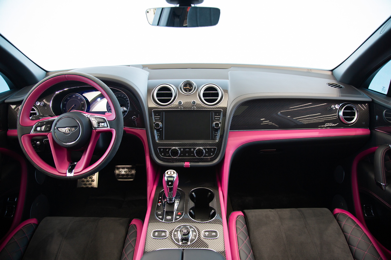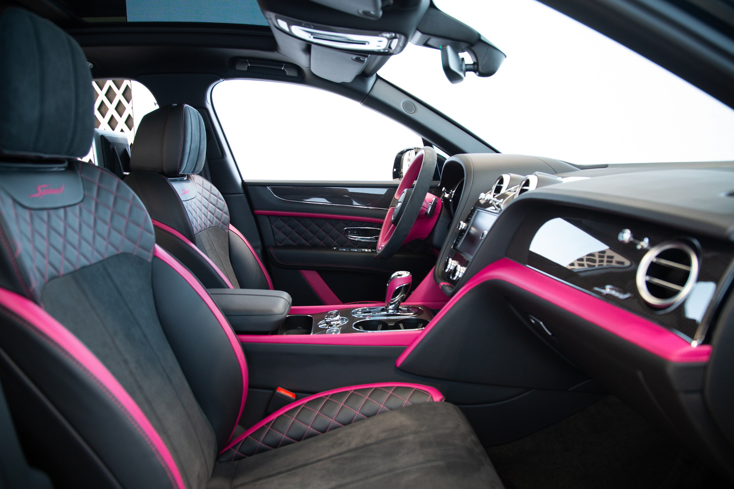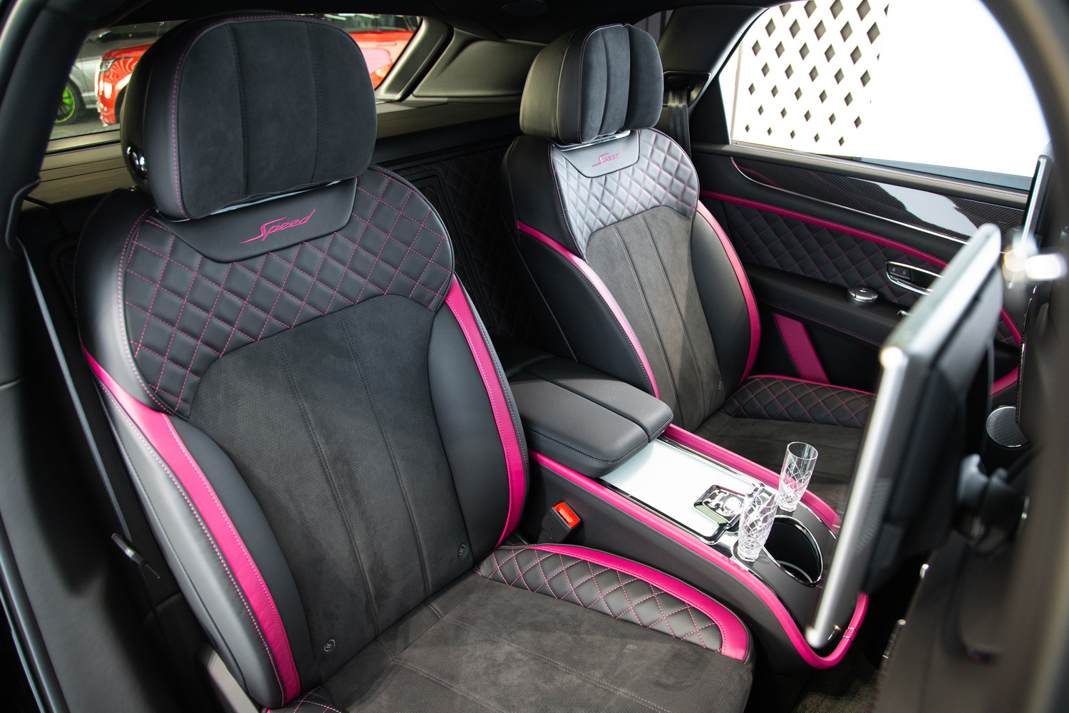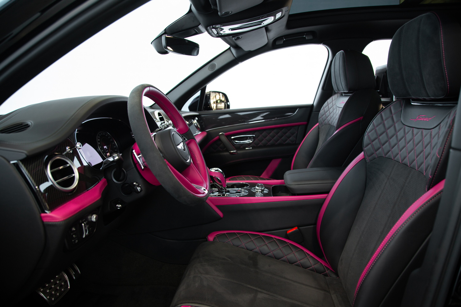 With its sleek black exterior, the 2020 Bentley Bentayga Speed exudes a commanding presence and refined elegance. The two-tone black and magenta interior creates a striking contrast, enveloping you in a world of luxurious comfort and style. Meticulously crafted with the finest materials, the cabin offers a harmonious blend of exquisite design and practicality.