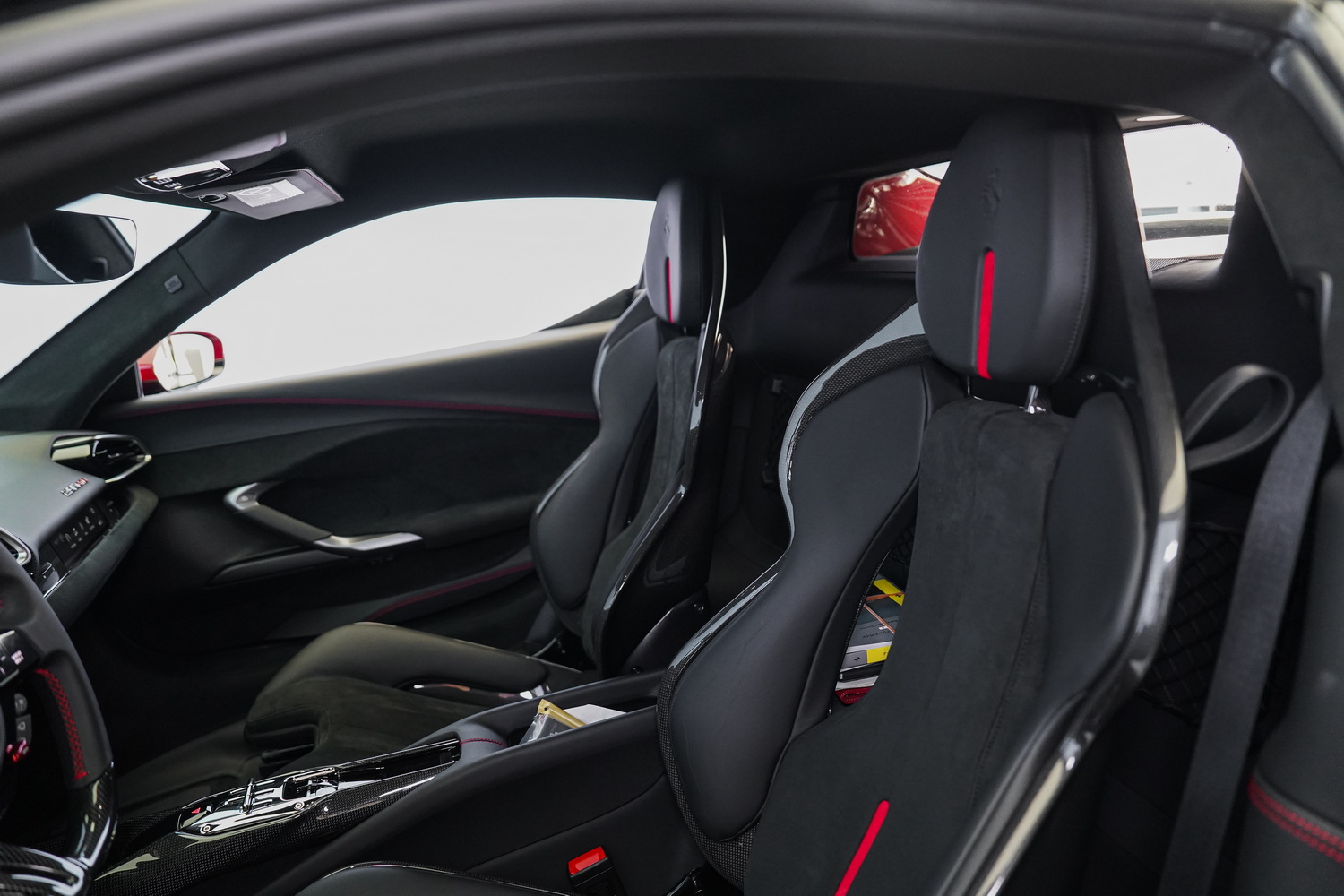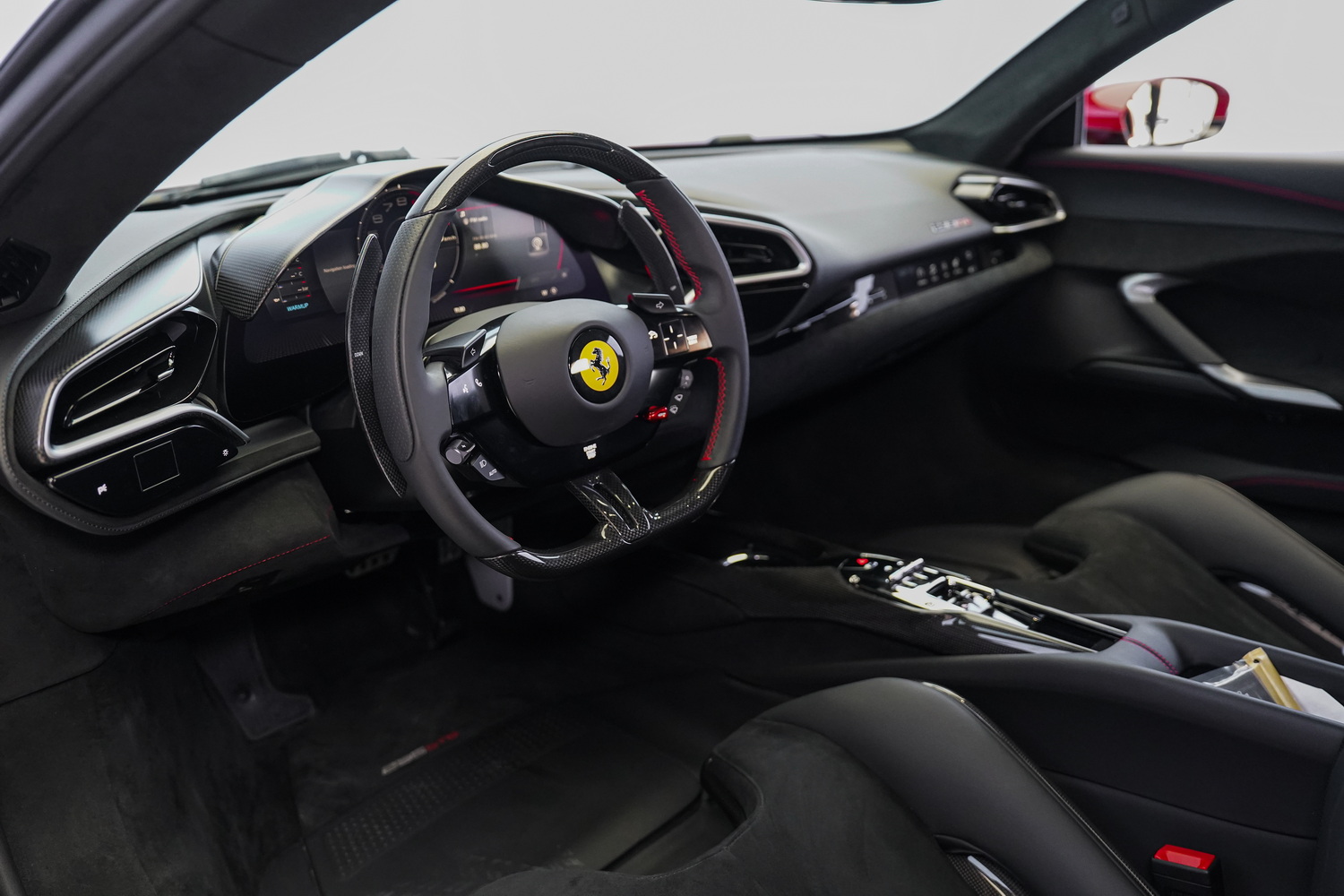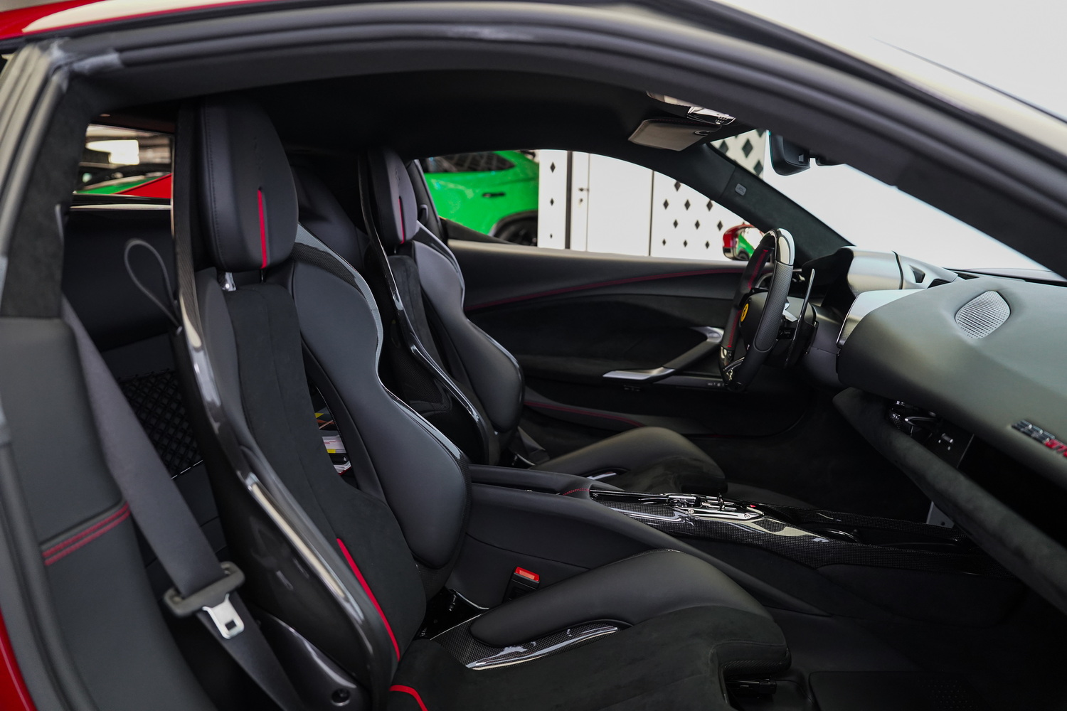 Inside, the Black leather and Alcantara interior embodies Ferrari’s dedication to the driver. The minimalist, driver-focused cockpit features digital instrumentation, carbon fibre trim, and contrast red stitching. Every surface reflects meticulous craftsmanship, from the multifunction steering wheel to the race-inspired paddle shifters — all designed to put performance and luxury at your fingertips.