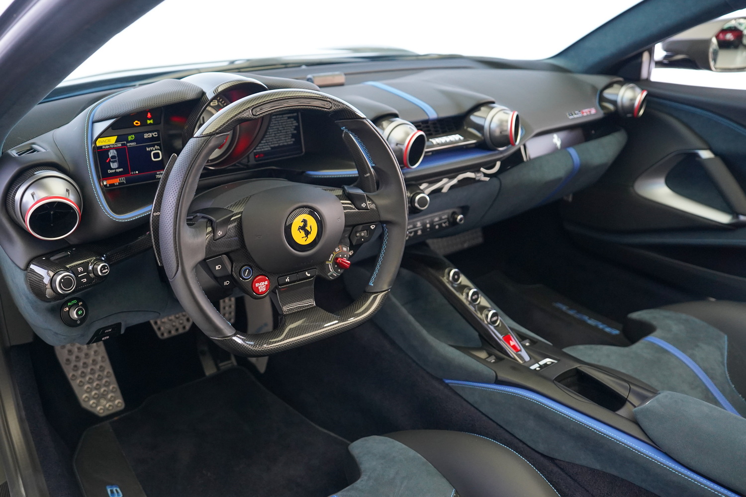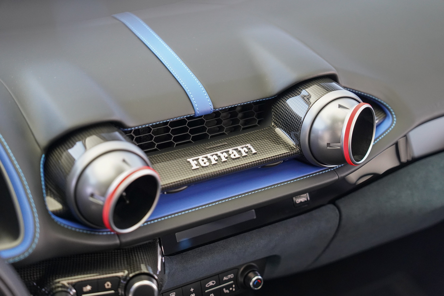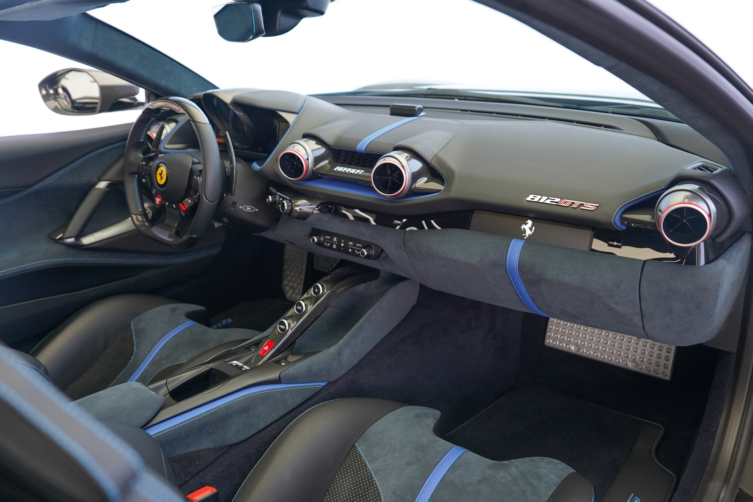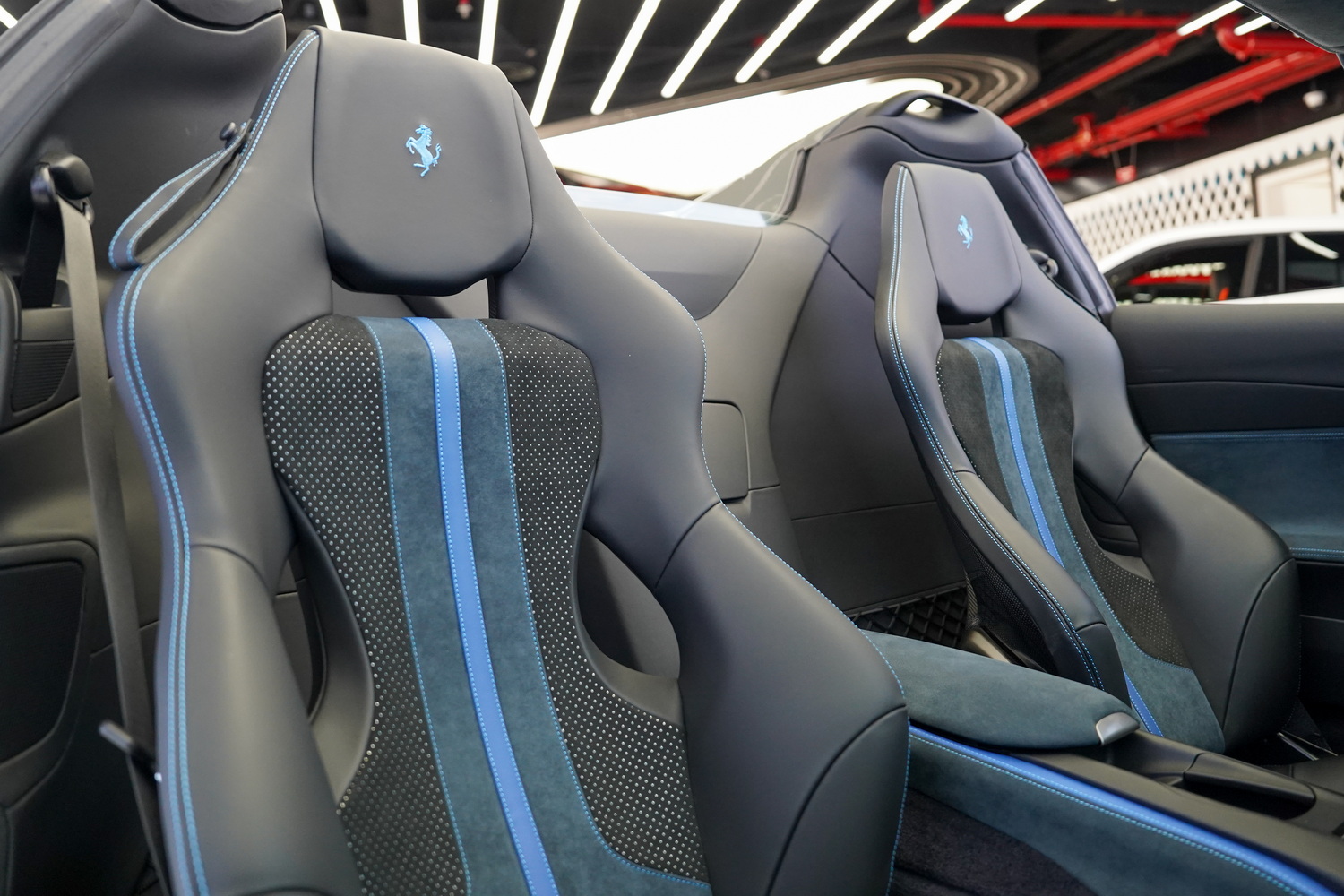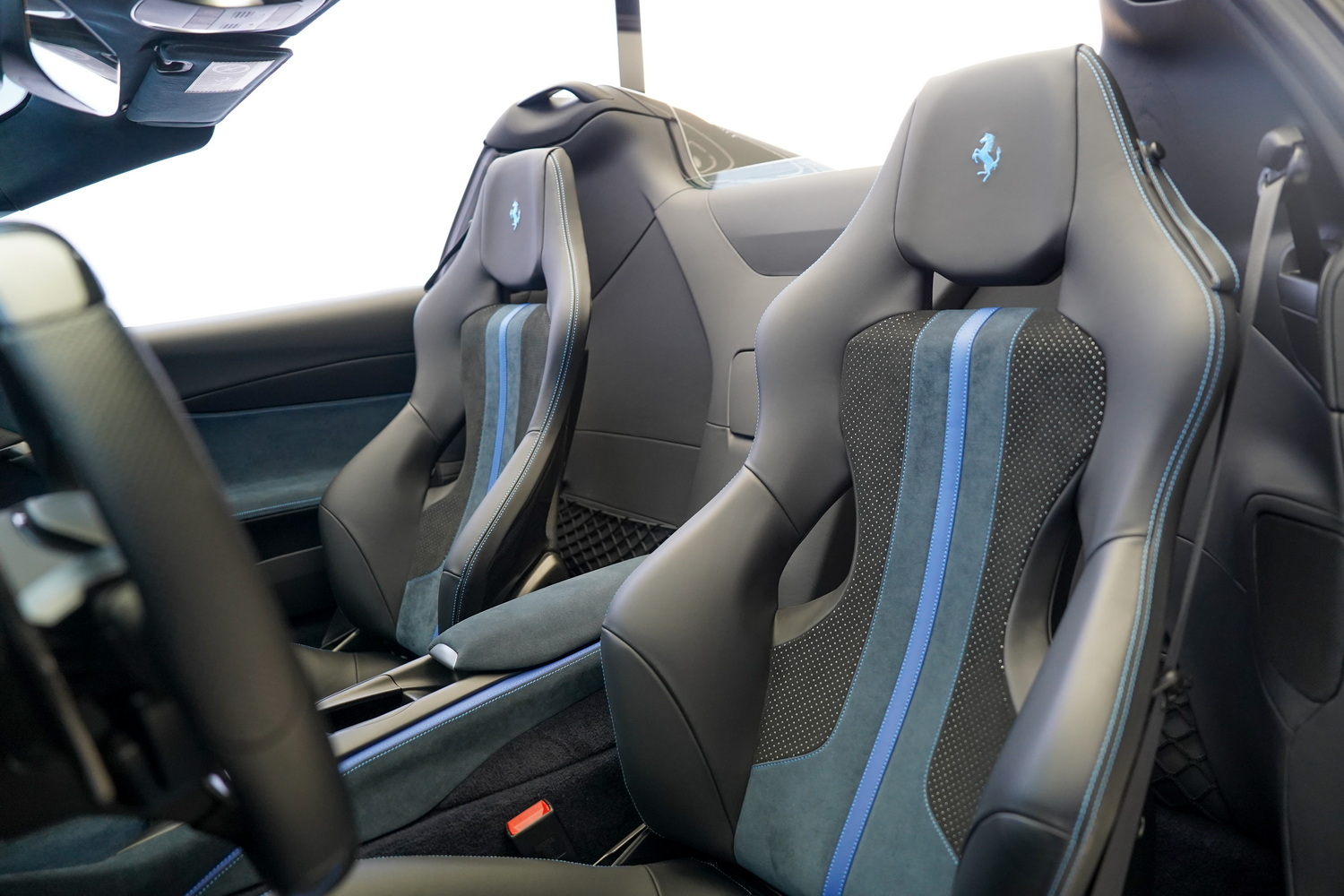 Inside, the cabin blends sporty character with refined luxury. The Blue + Black leather interior surrounds a driver-focused cockpit featuring high-resolution displays, intuitive controls, and premium materials throughout. Carbon fibre accents, precision stitching, and Ferrari’s iconic steering-wheel-mounted controls elevate the sense of exclusivity.