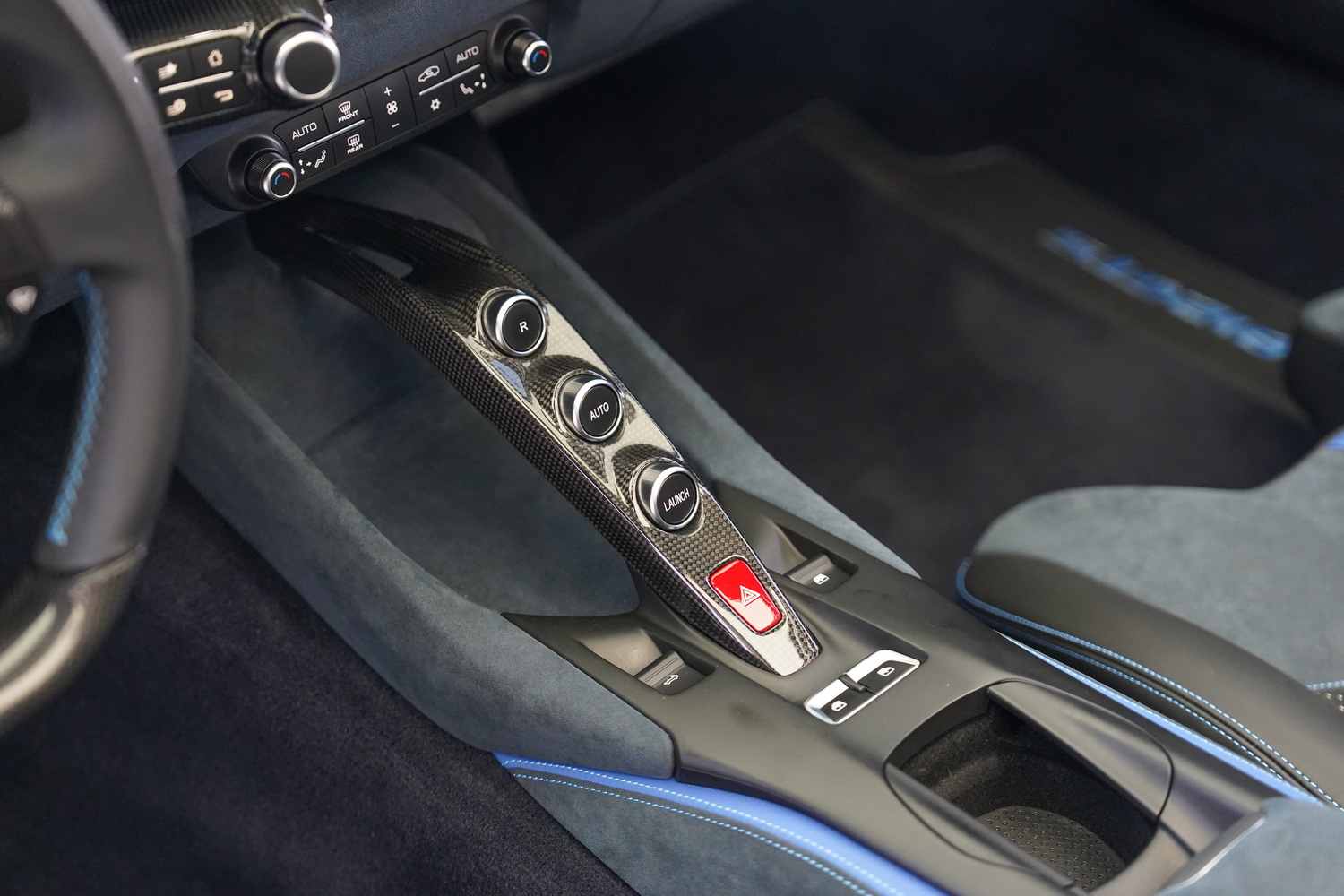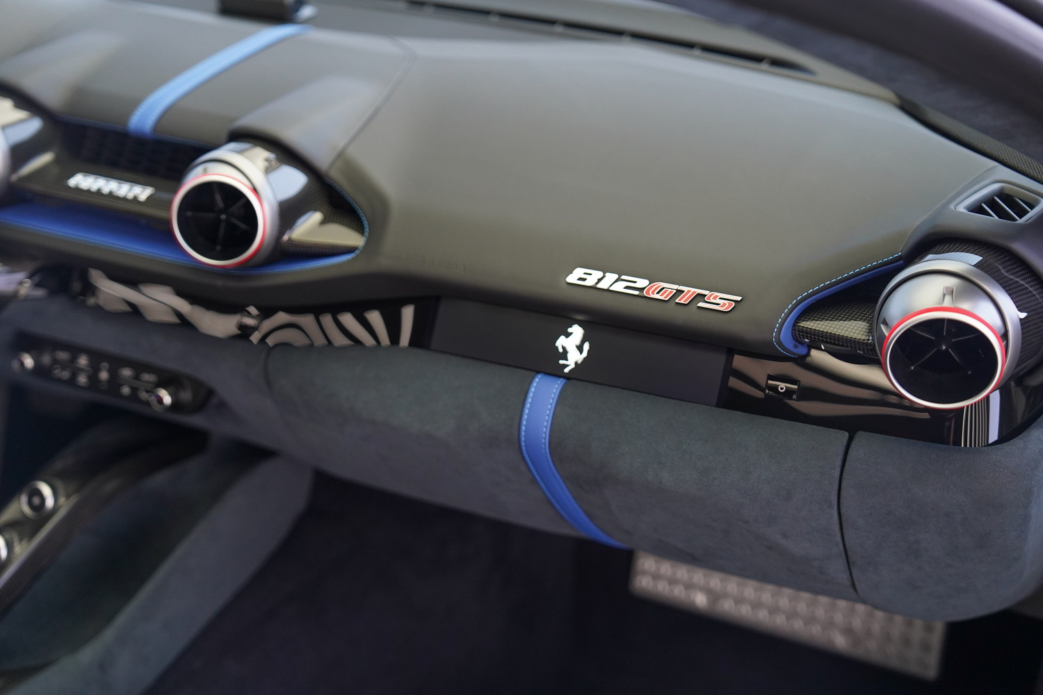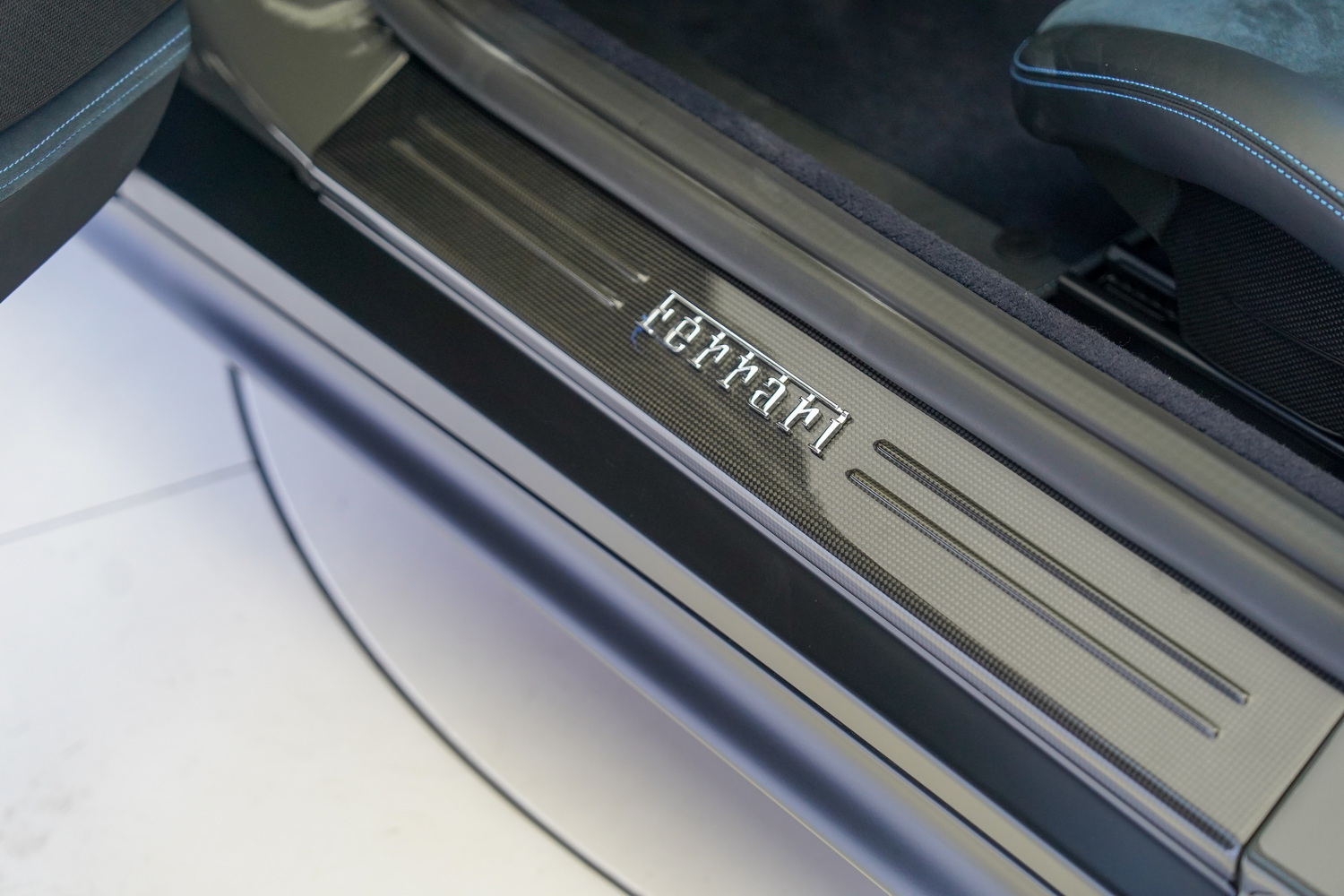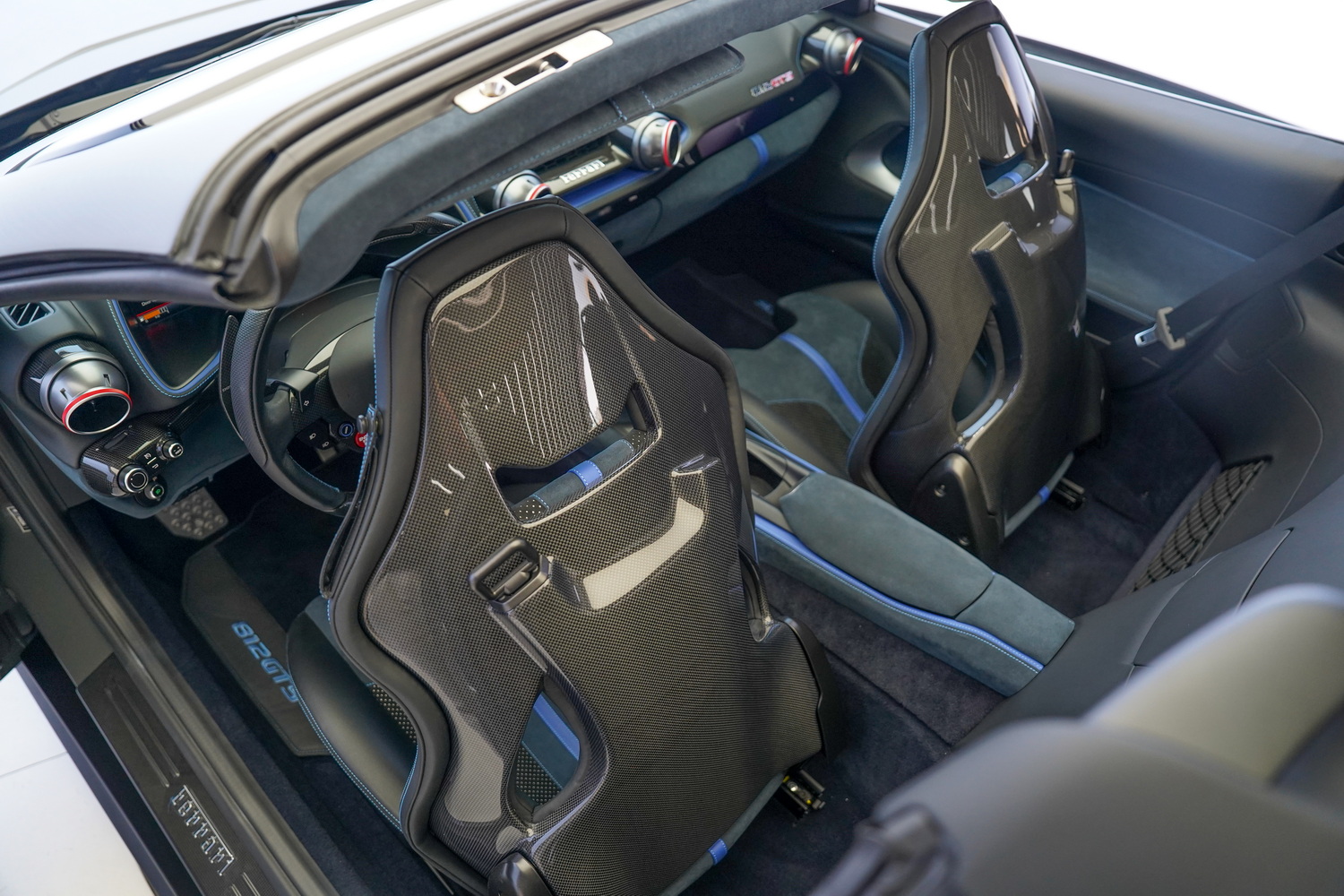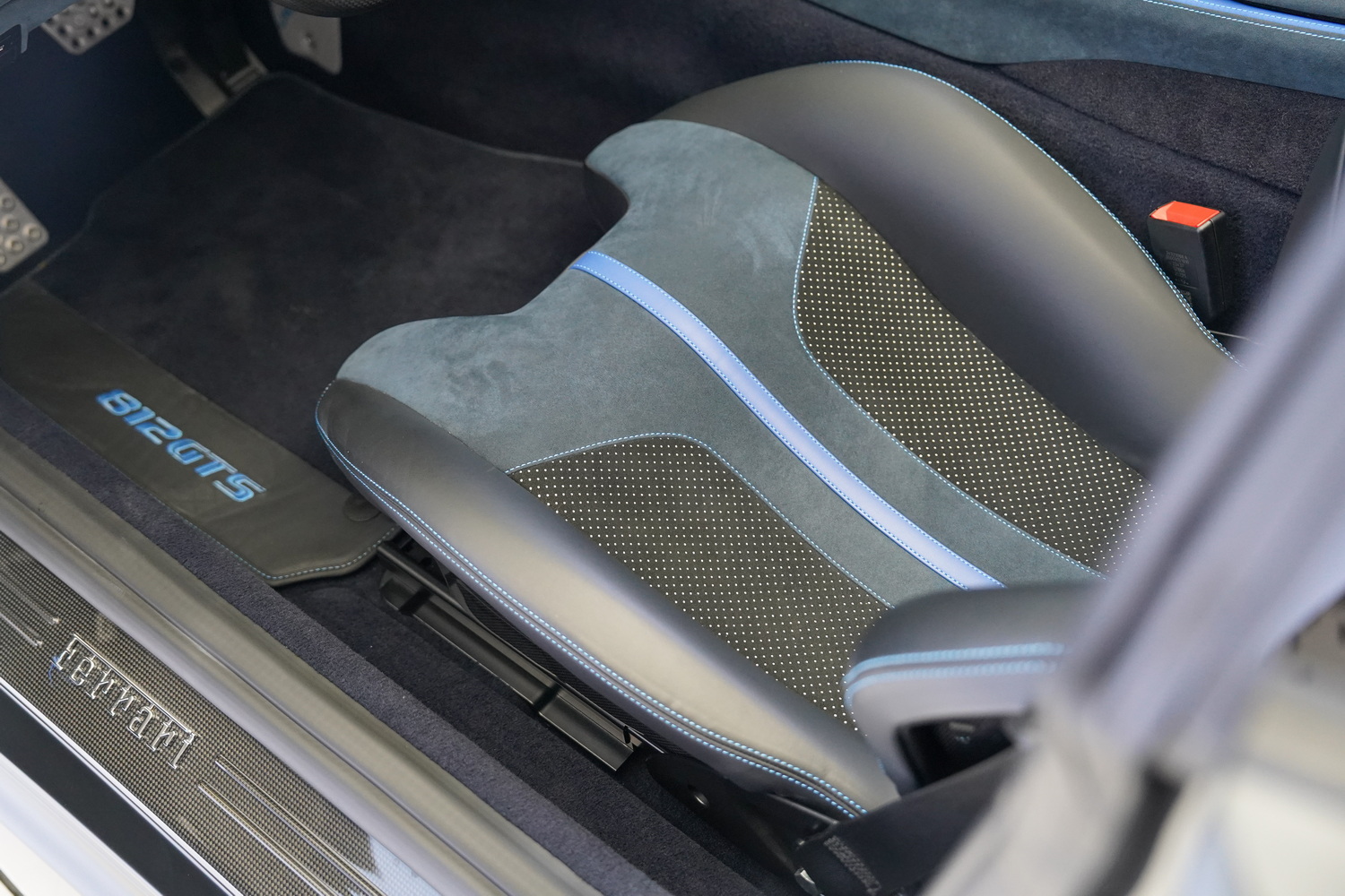 Inside, the cabin blends sporty character with refined luxury. The Blue + Black leather interior surrounds a driver-focused cockpit featuring high-resolution displays, intuitive controls, and premium materials throughout. Carbon fibre accents, precision stitching, and Ferrari’s iconic steering-wheel-mounted controls elevate the sense of exclusivity.