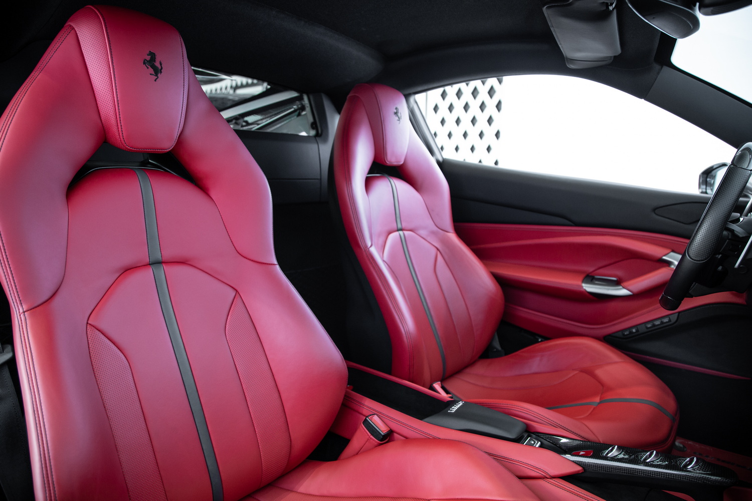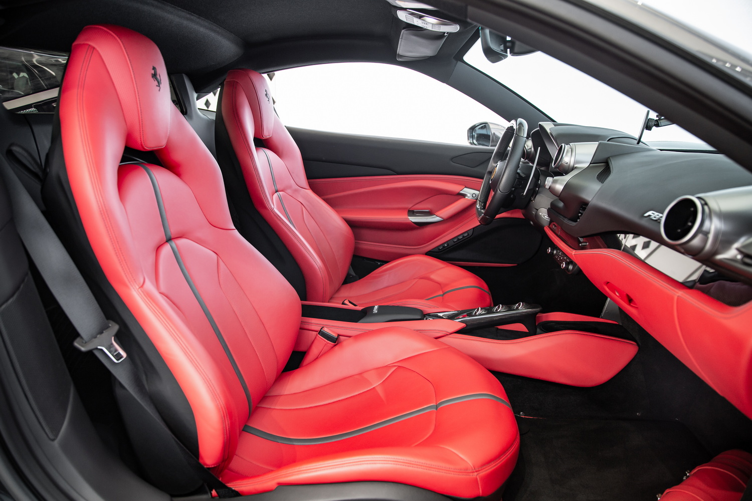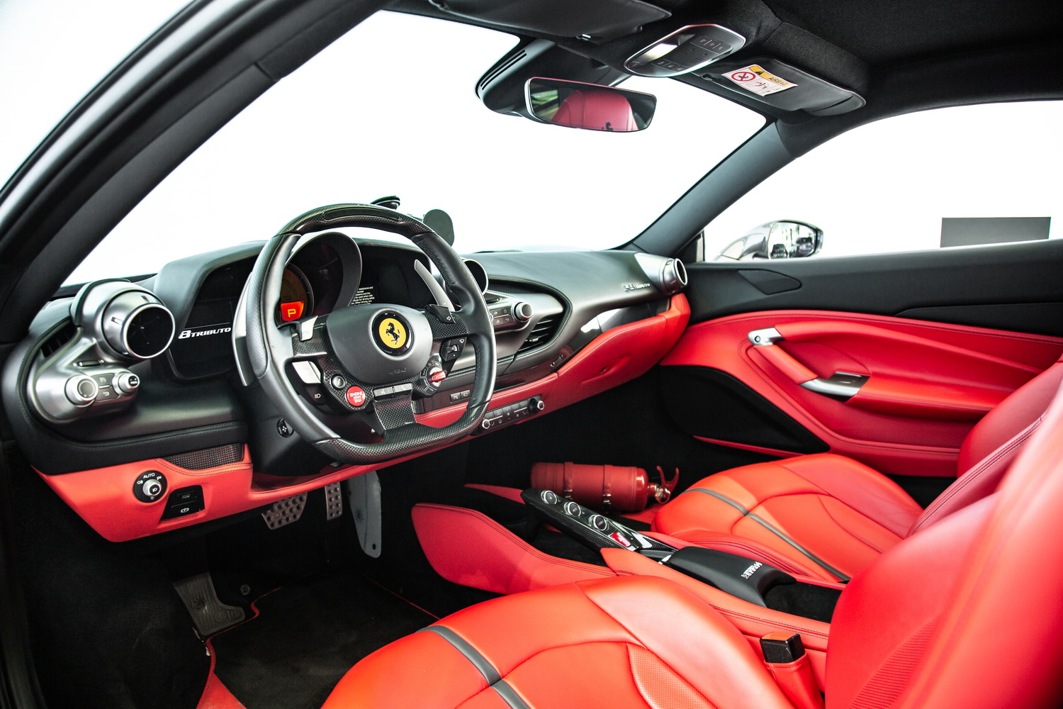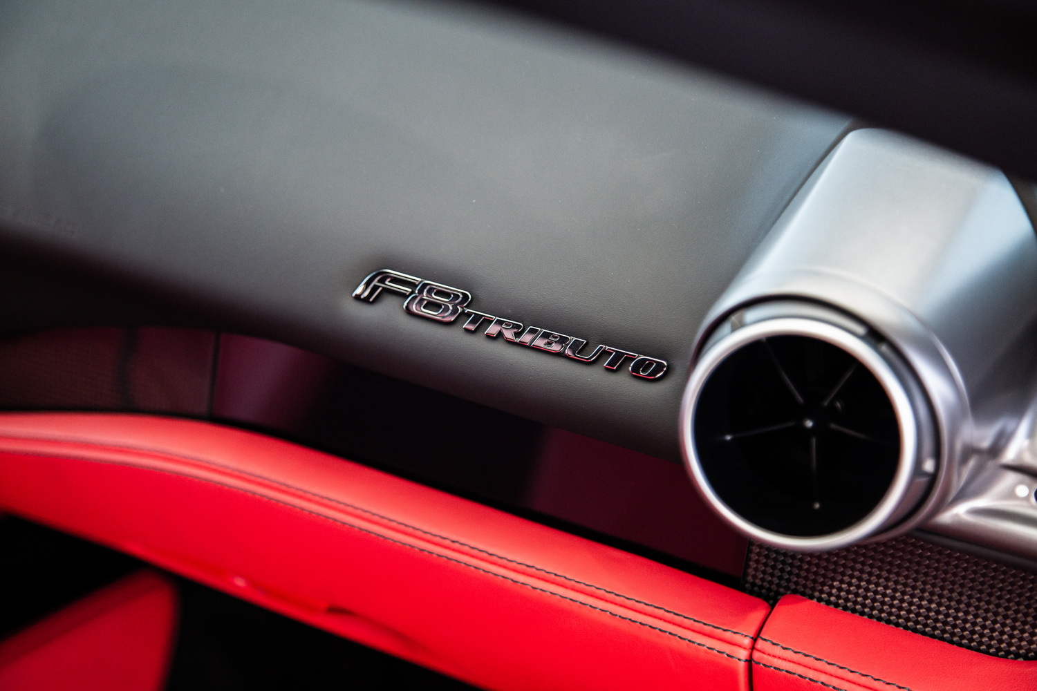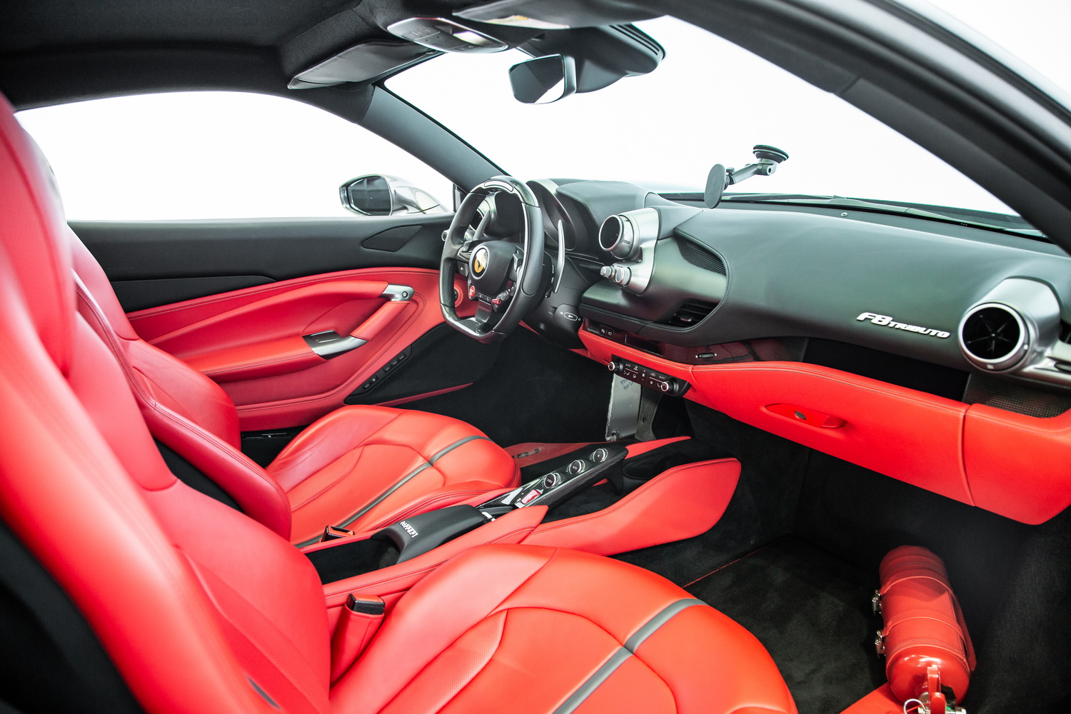 The F8 Tributo's sleek grey exterior is a sight to behold, exuding a sense of power and elegance. This is beautifully complemented by the car's vibrant red interior, creating a striking contrast that is both captivating and timeless. Every inch of the car, from its aerodynamic contours to the meticulously crafted interior, speaks of Ferrari's commitment to perfection.