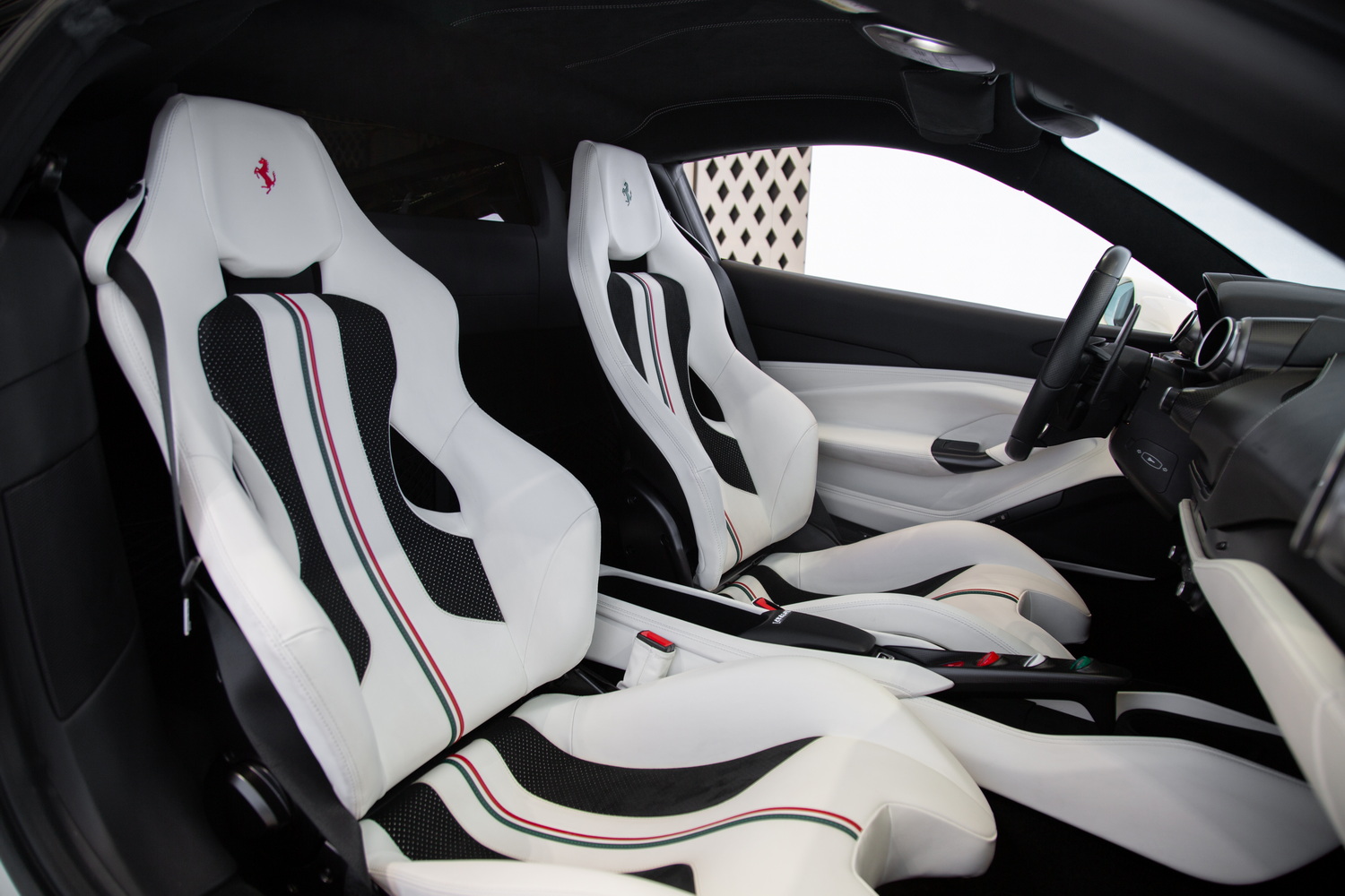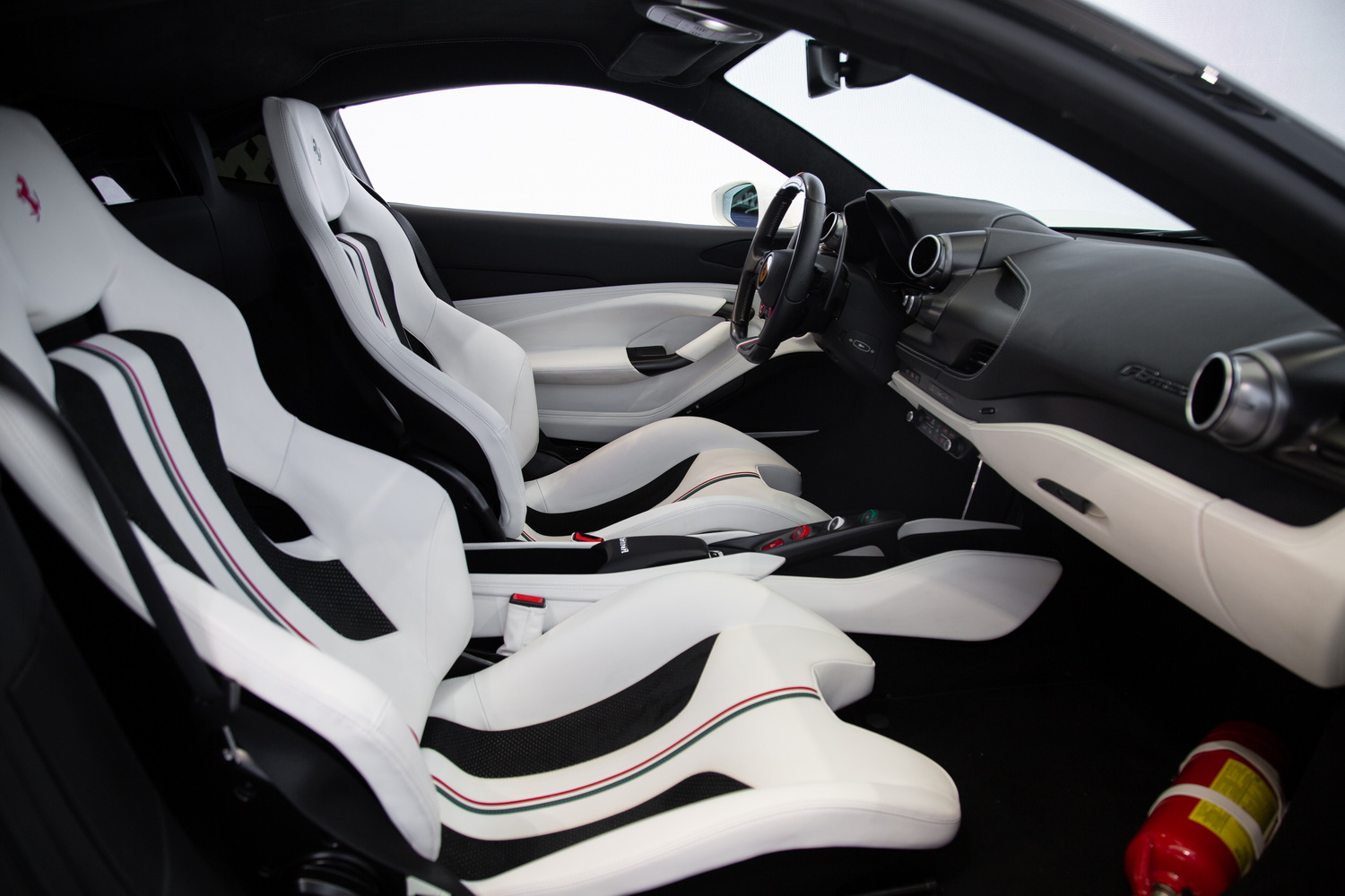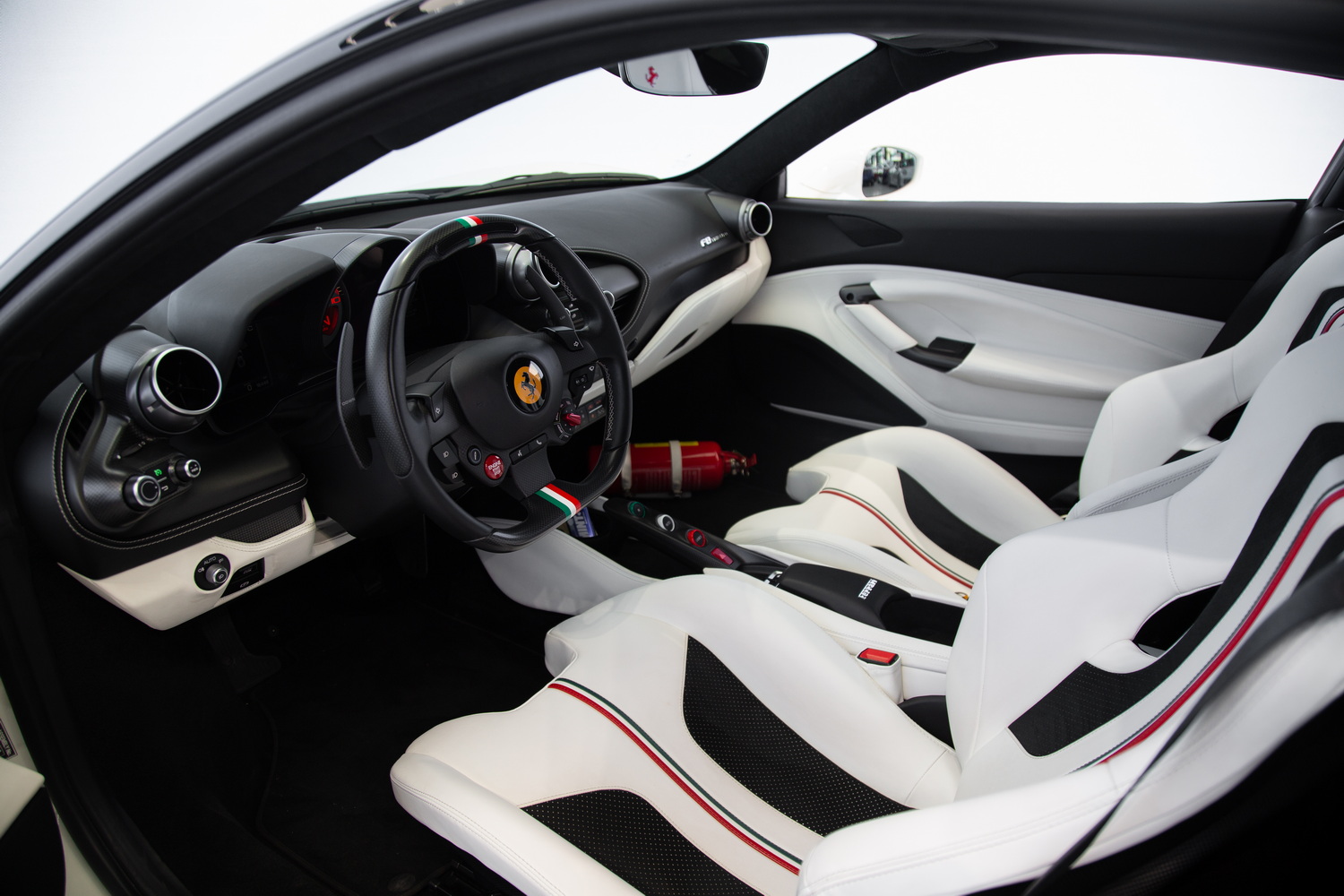 Step inside to experience the luxurious custom ivory interior, designed by Ferrari's own craftsmen to ensure a bespoke and comfortable driving experience. The interior is further enhanced by matte carbon fiber trim that adds a touch of modern elegance to the classic Ferrari aesthetic. With carbon bucket seats, you not only get superior support during high-performance driving but also a unique style that sets this F8 Tributo apart from others.