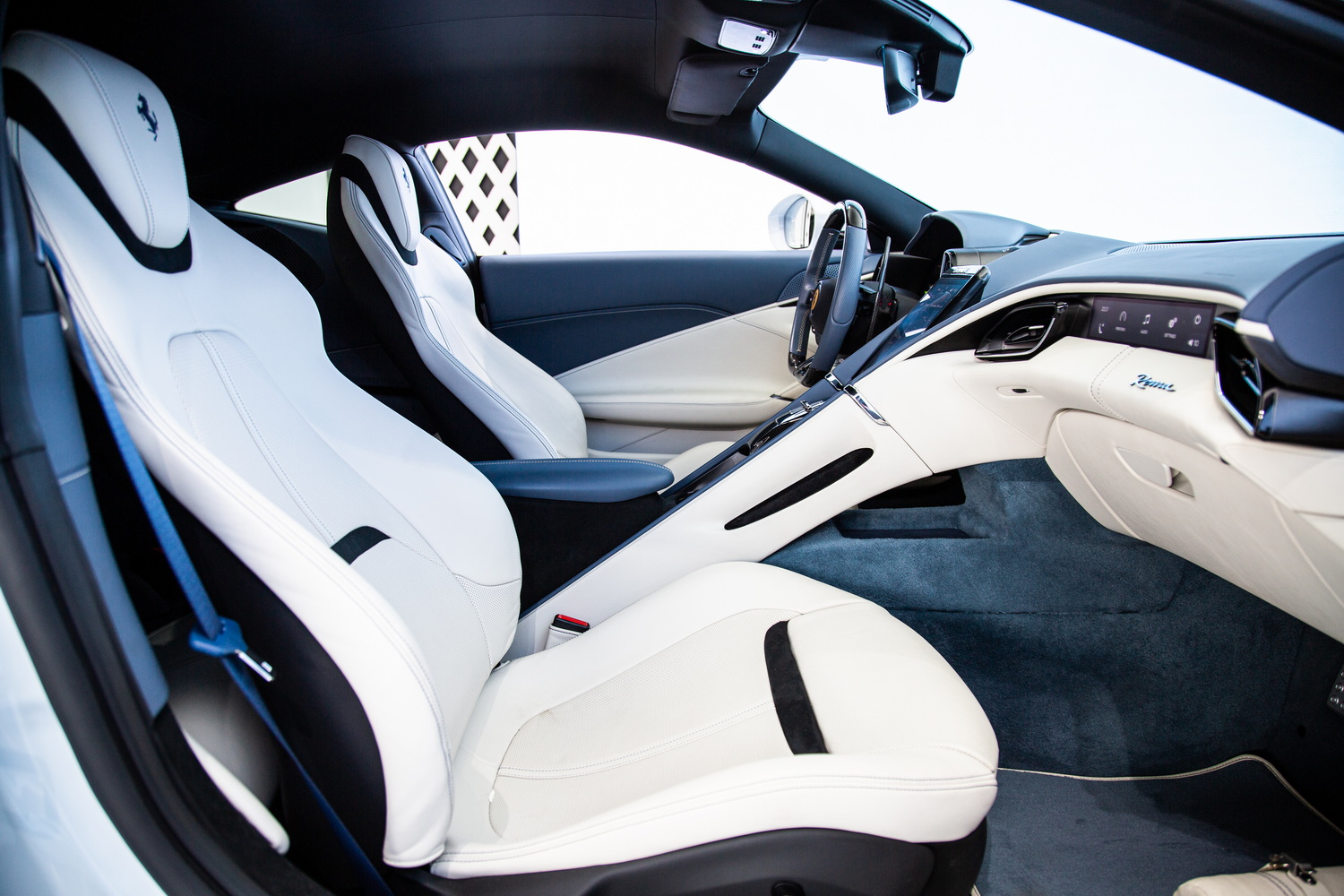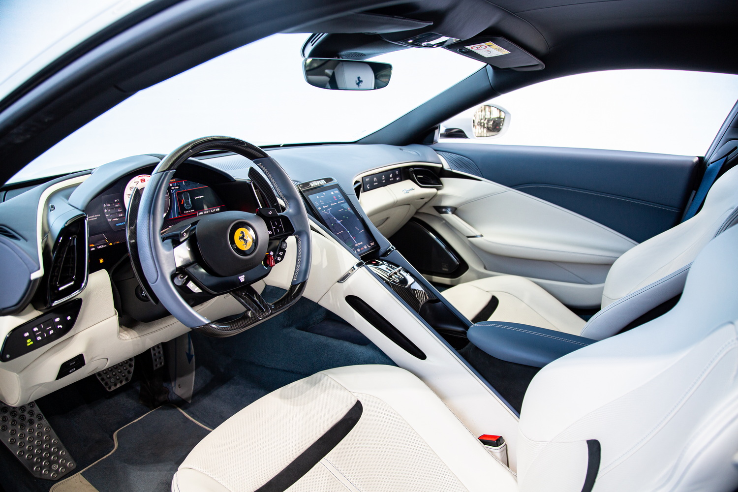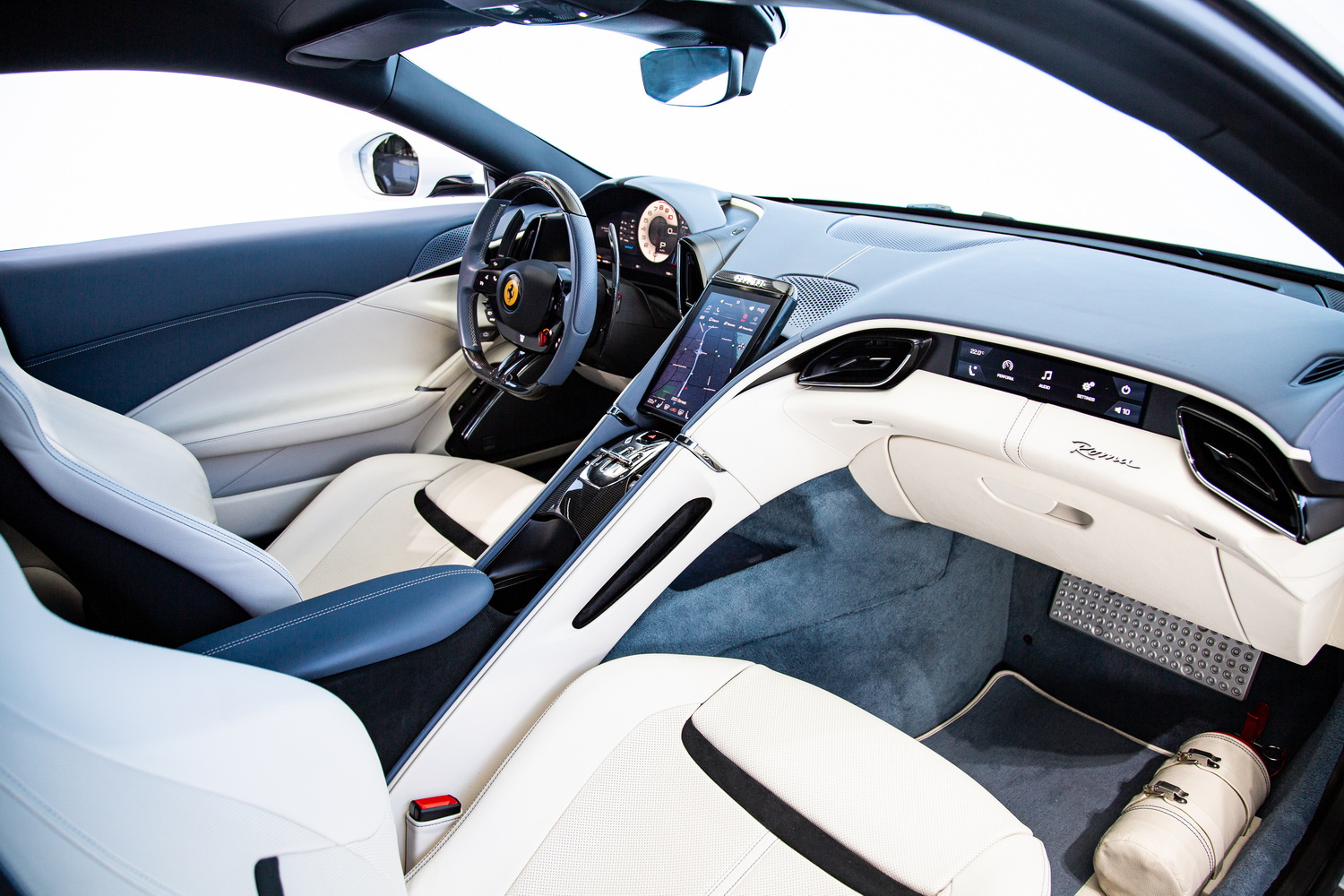 Welcome to Exotic Cars Dubai, where we present to you a masterpiece of Italian engineering and design - a used 2023 Ferrari Roma, now available for sale in the heart of Dubai. This exquisite vehicle, with its sleek white exterior and a luxurious ivory and blue interior, is a testament to Ferrari's unparalleled commitment to craftsmanship and performance.