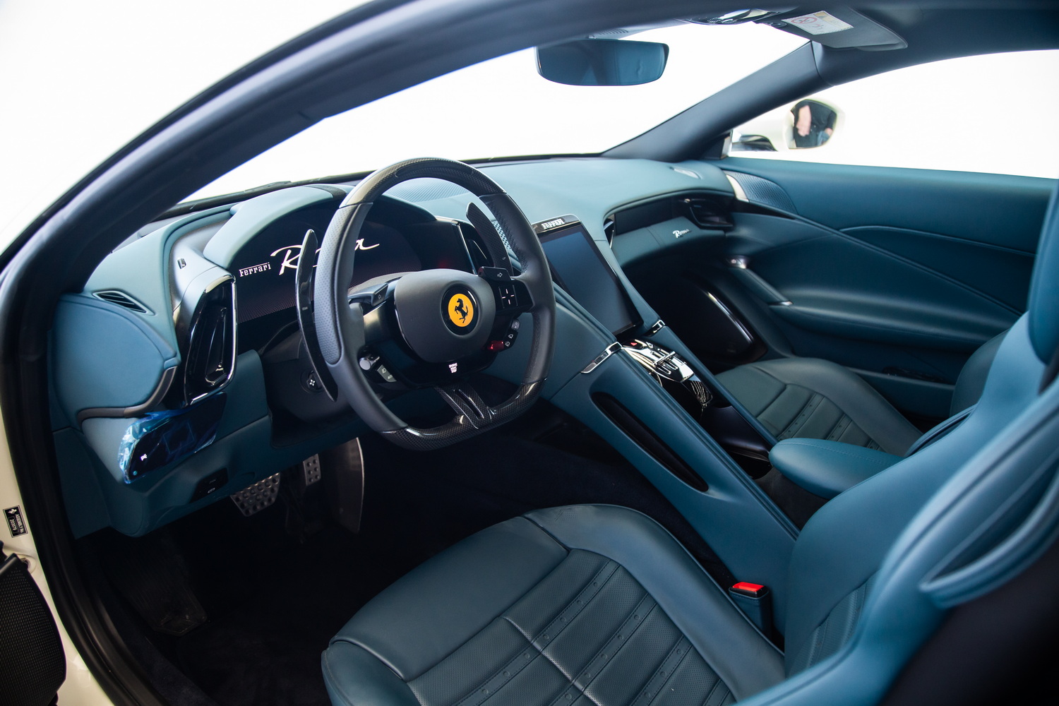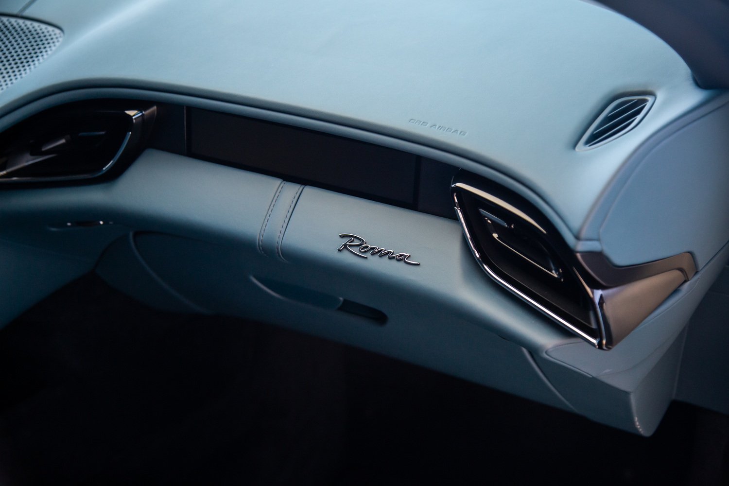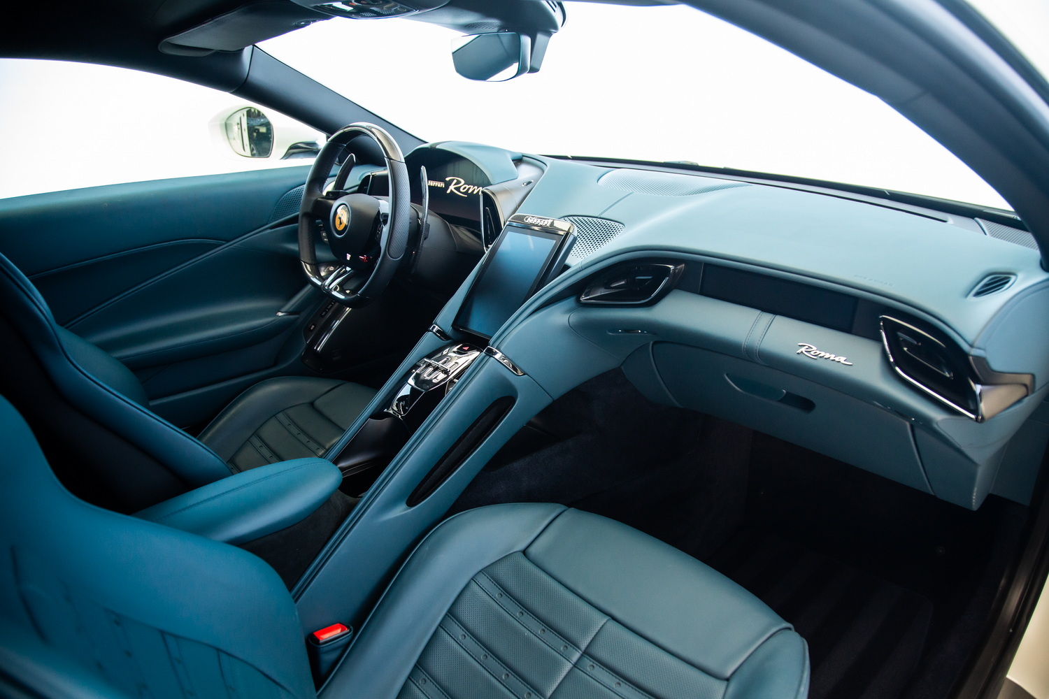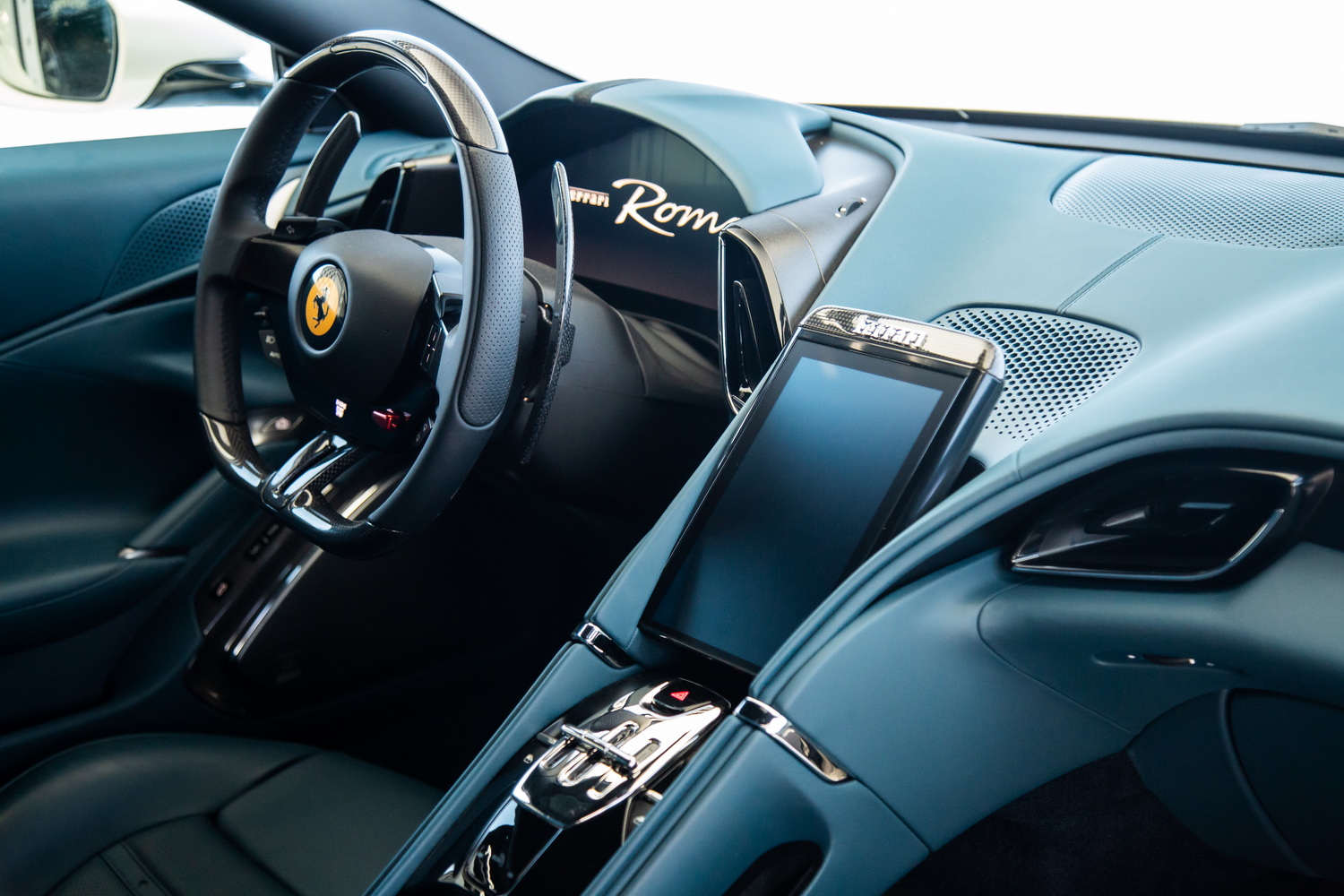 Inside, the cabin of the Ferrari Roma is a haven of luxury, where every detail is crafted to perfection. The blue interior creates a striking and sophisticated environment, rich in contrast and designed for comfort. The seats and panels are accentuated with carbon trim, adding a contemporary touch to the classic design. The JBL sound system offers superior audio quality, turning the cabin into an immersive listening environment, perfect for enjoying music on the road.