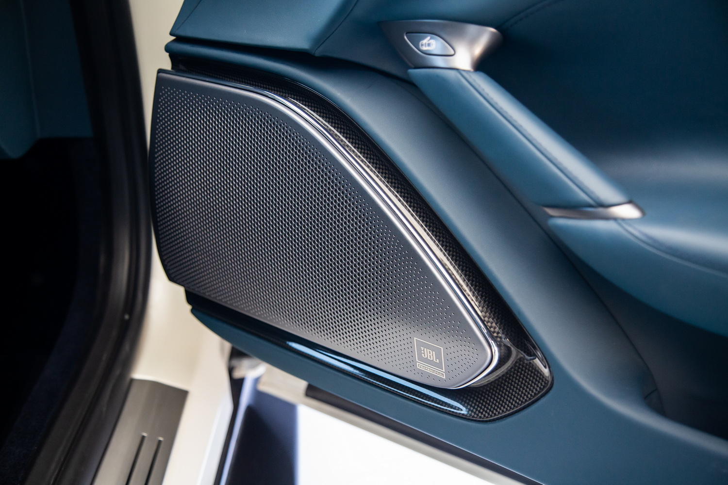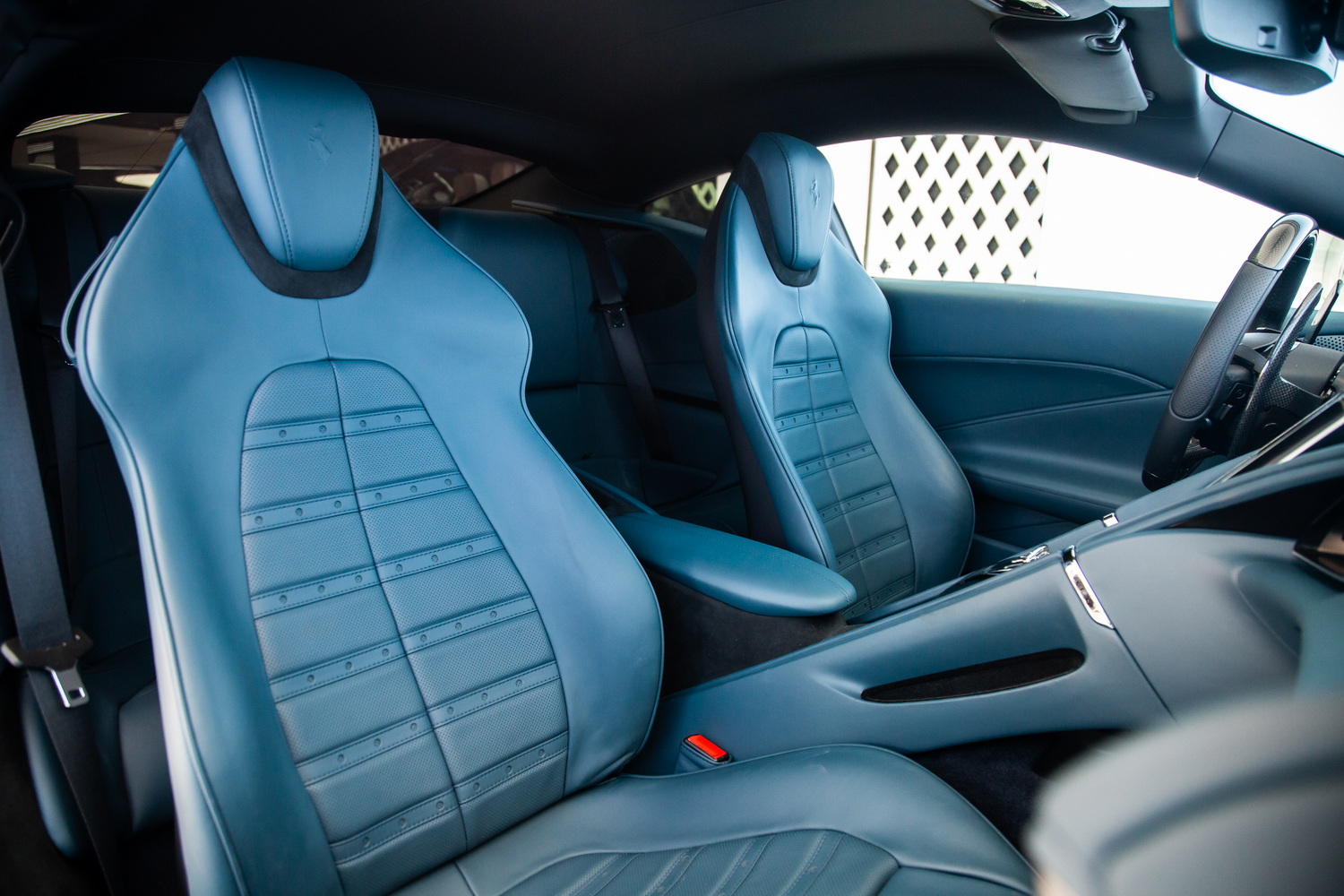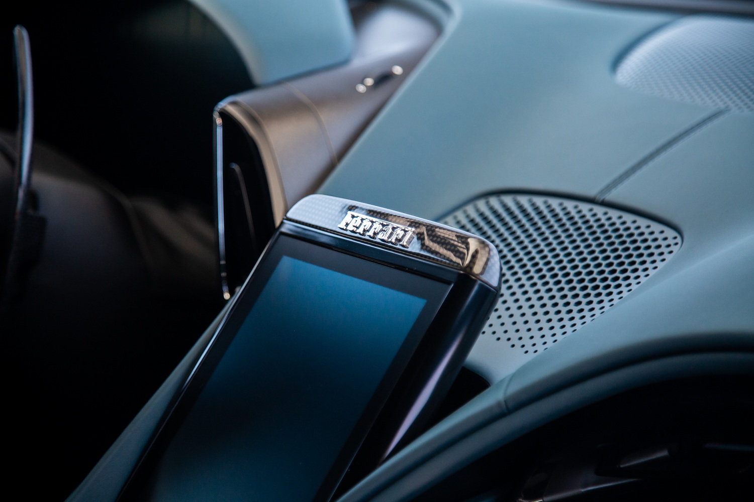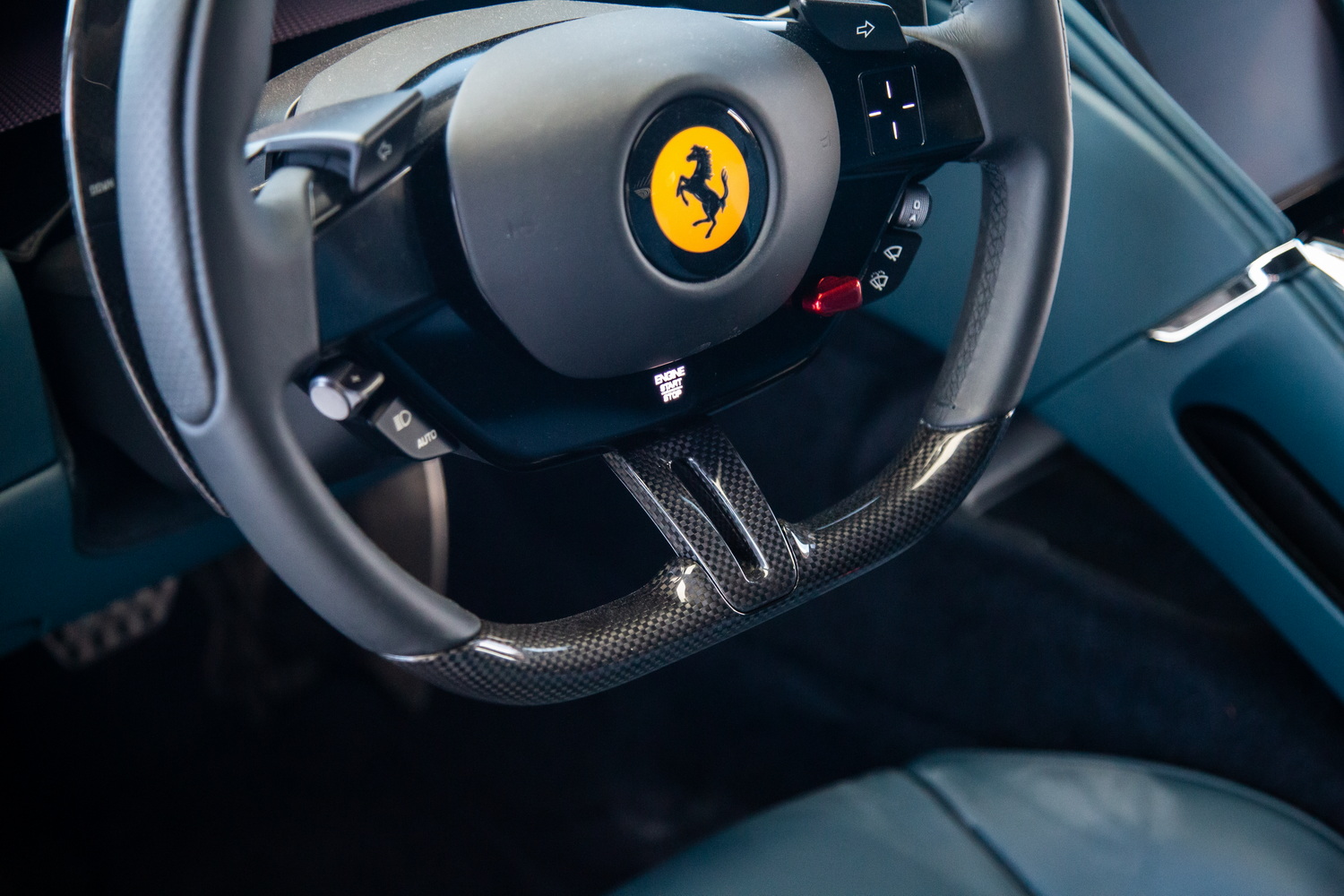 Inside, the cabin of the Ferrari Roma is a haven of luxury, where every detail is crafted to perfection. The blue interior creates a striking and sophisticated environment, rich in contrast and designed for comfort. The seats and panels are accentuated with carbon trim, adding a contemporary touch to the classic design. The JBL sound system offers superior audio quality, turning the cabin into an immersive listening environment, perfect for enjoying music on the road.