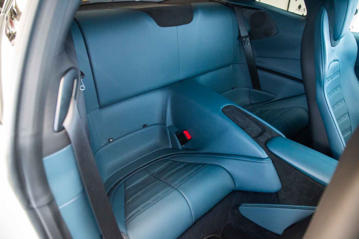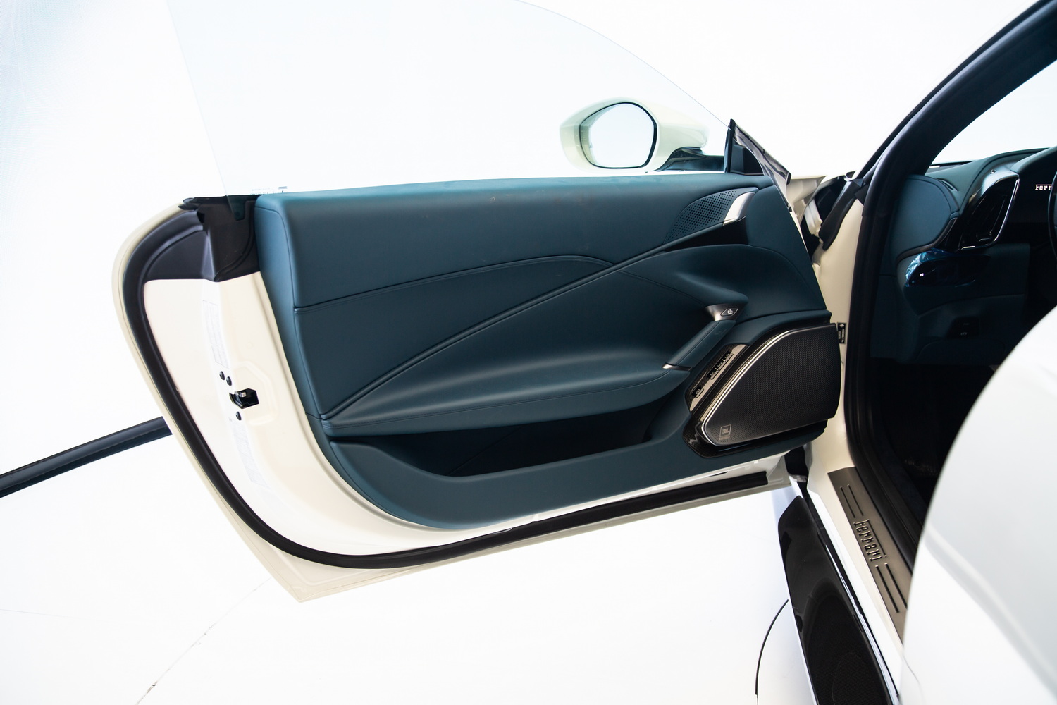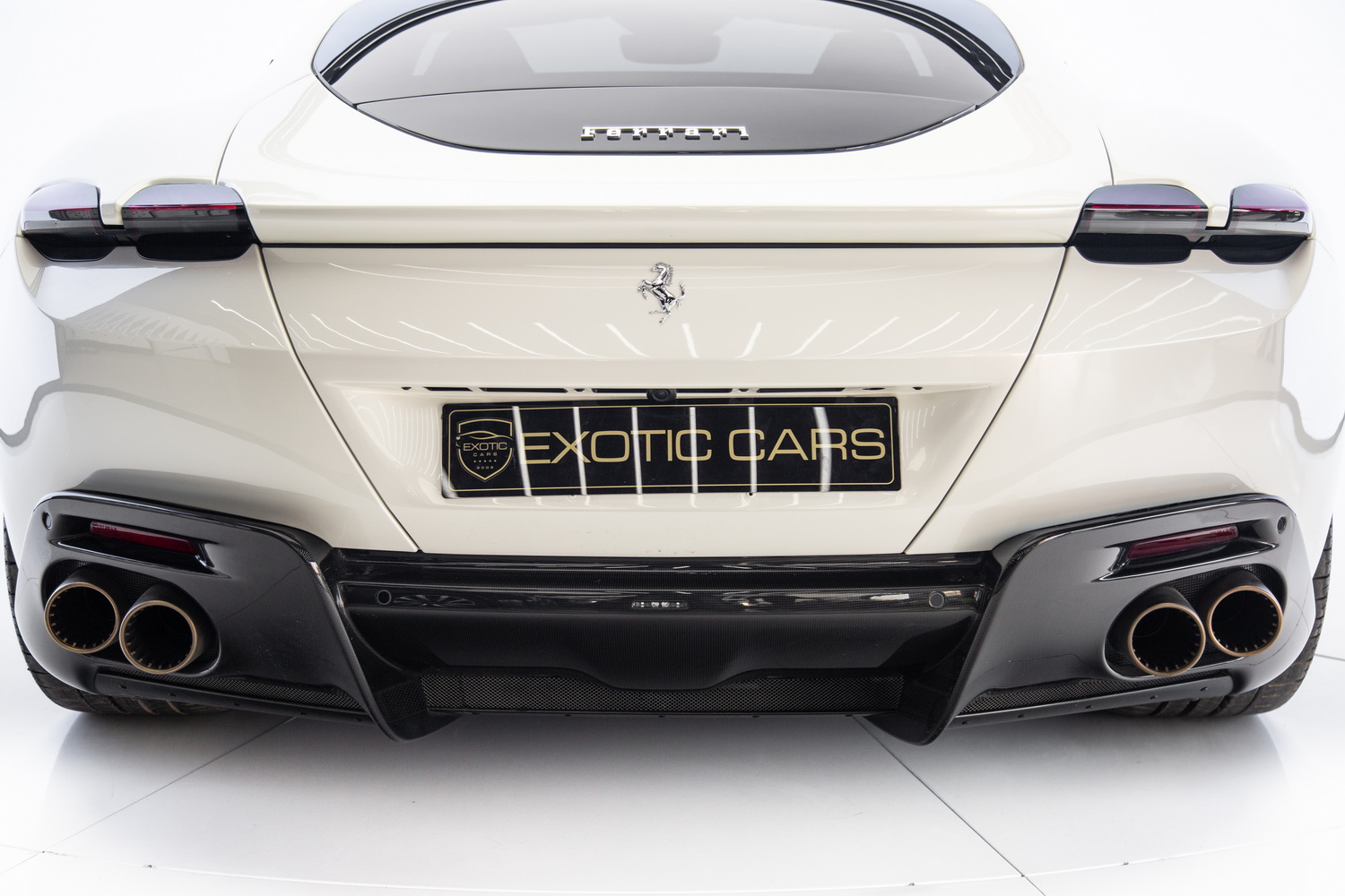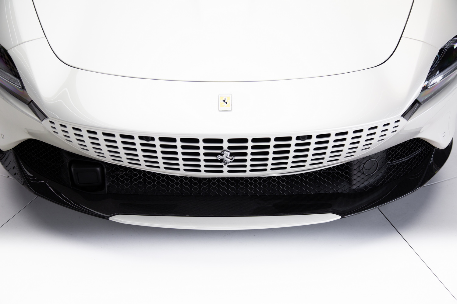 The exterior's pearl white finish gives the Roma an air of elegance and purity, highlighting the car's flowing silhouette and balanced proportions. The addition of exterior carbon trim not only enhances the aesthetic appeal but also contributes to the vehicle’s aerodynamic efficiency, underscoring its sporty character.