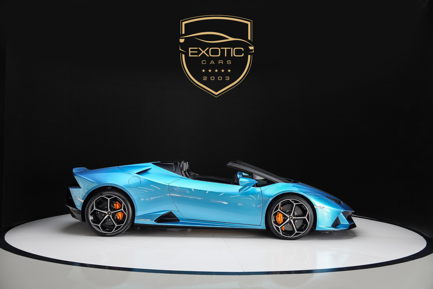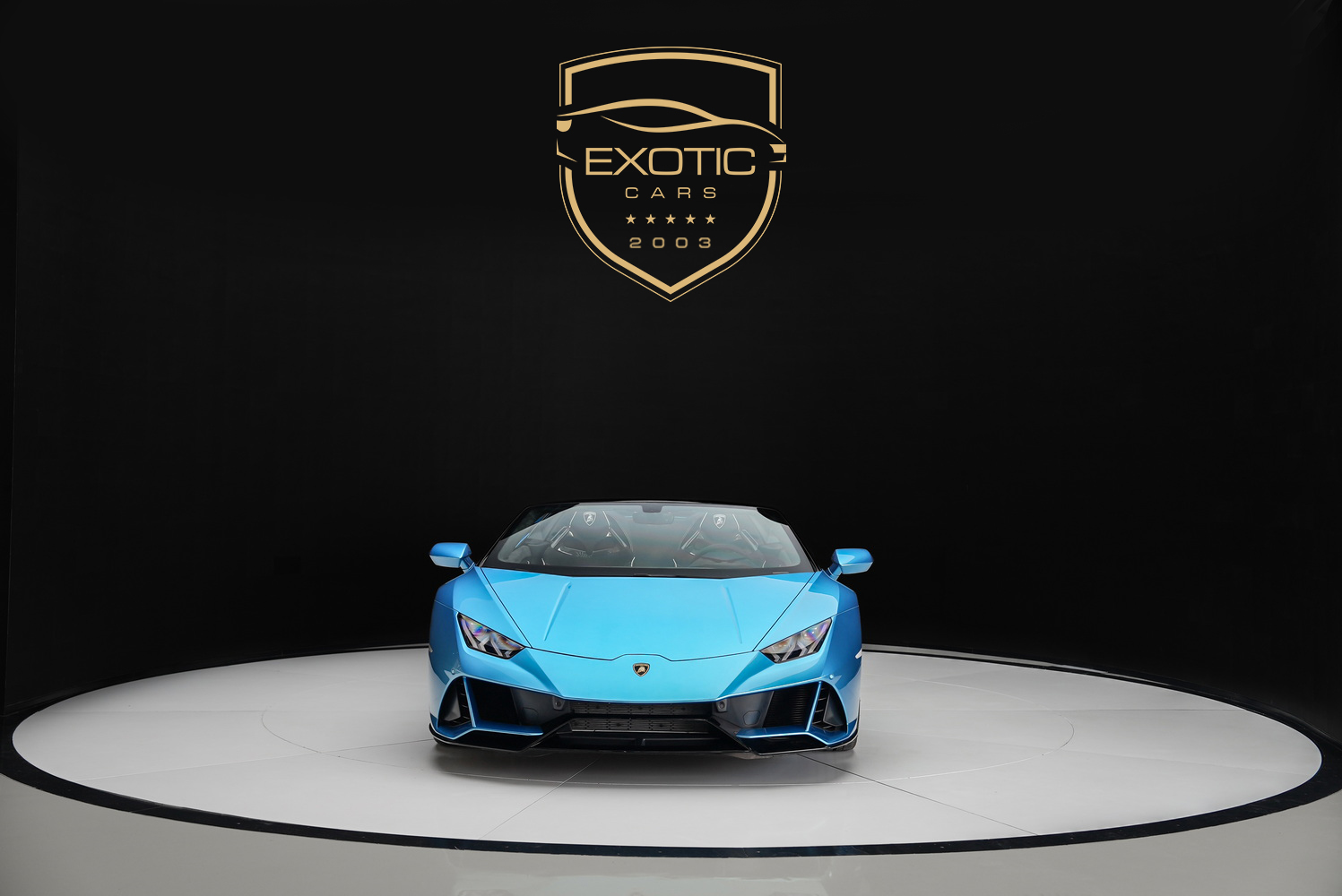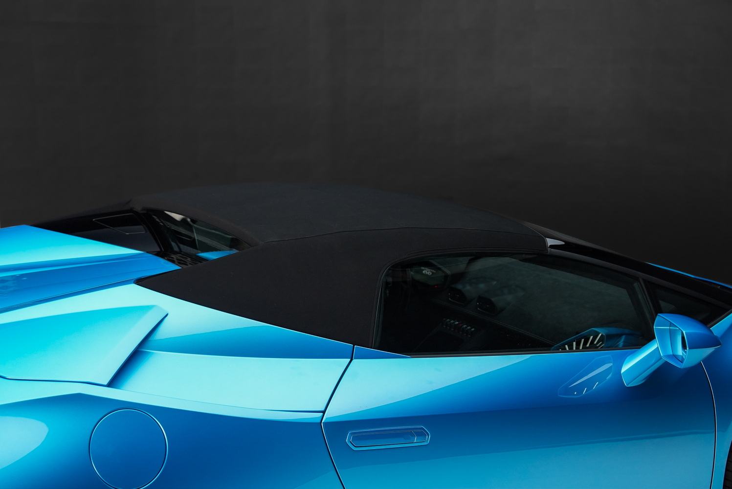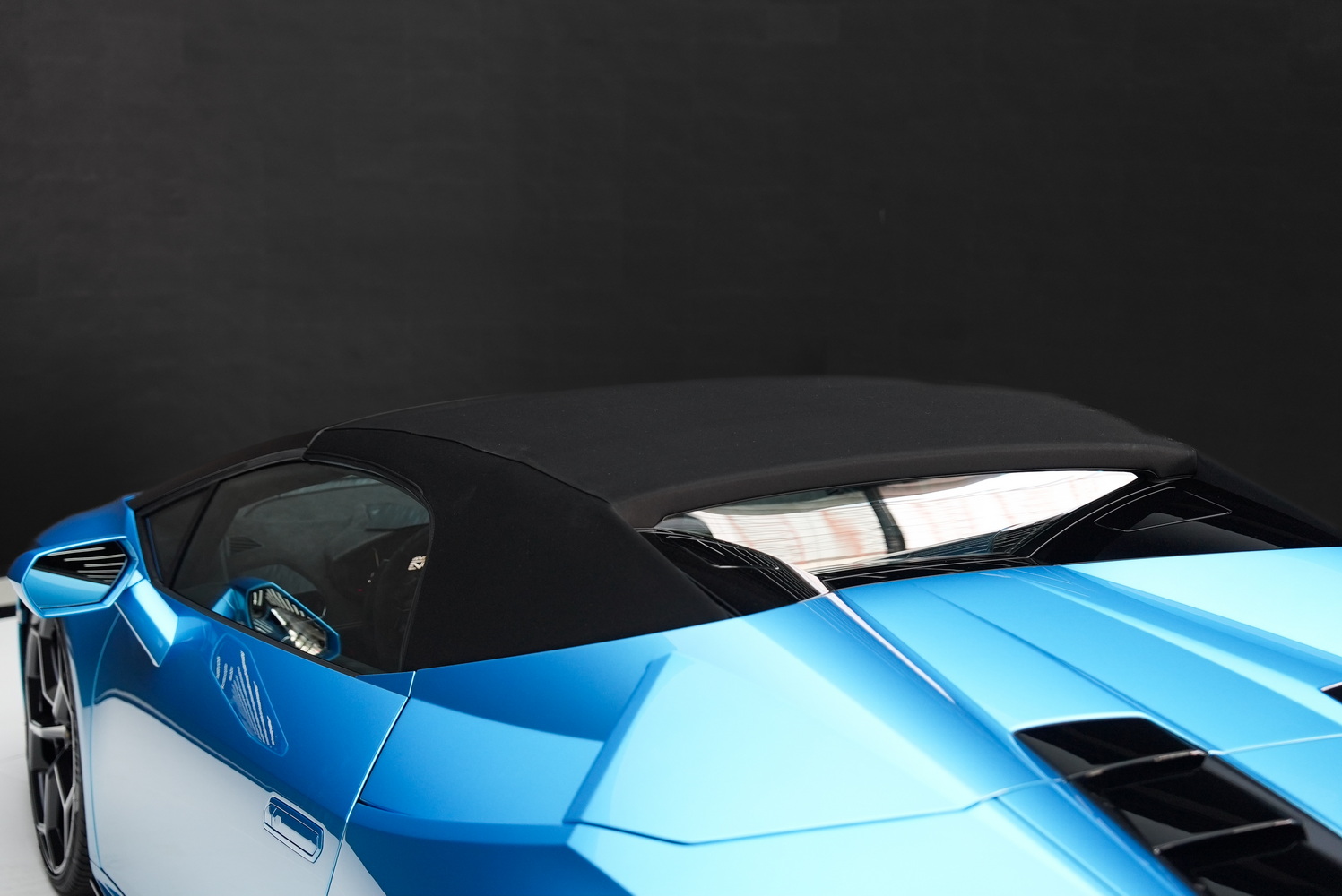 Discover the 2024 Lamborghini Huracán EVO Spyder, finished in Blue with a Black interior, Black soft top, and carbon seats, now available at our flagship showroom.