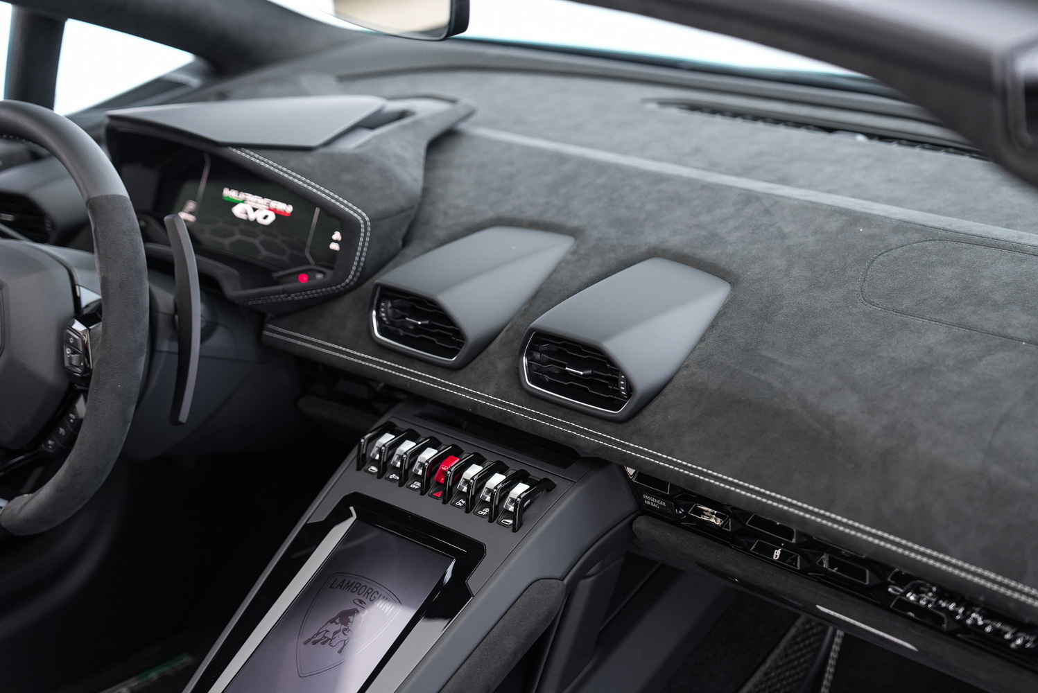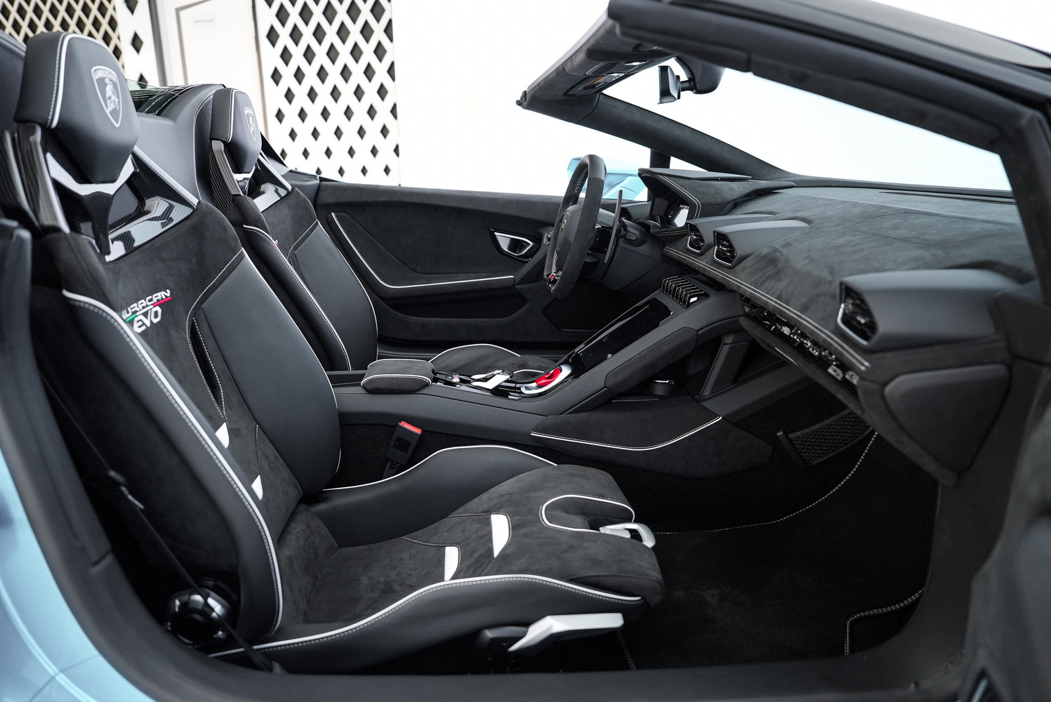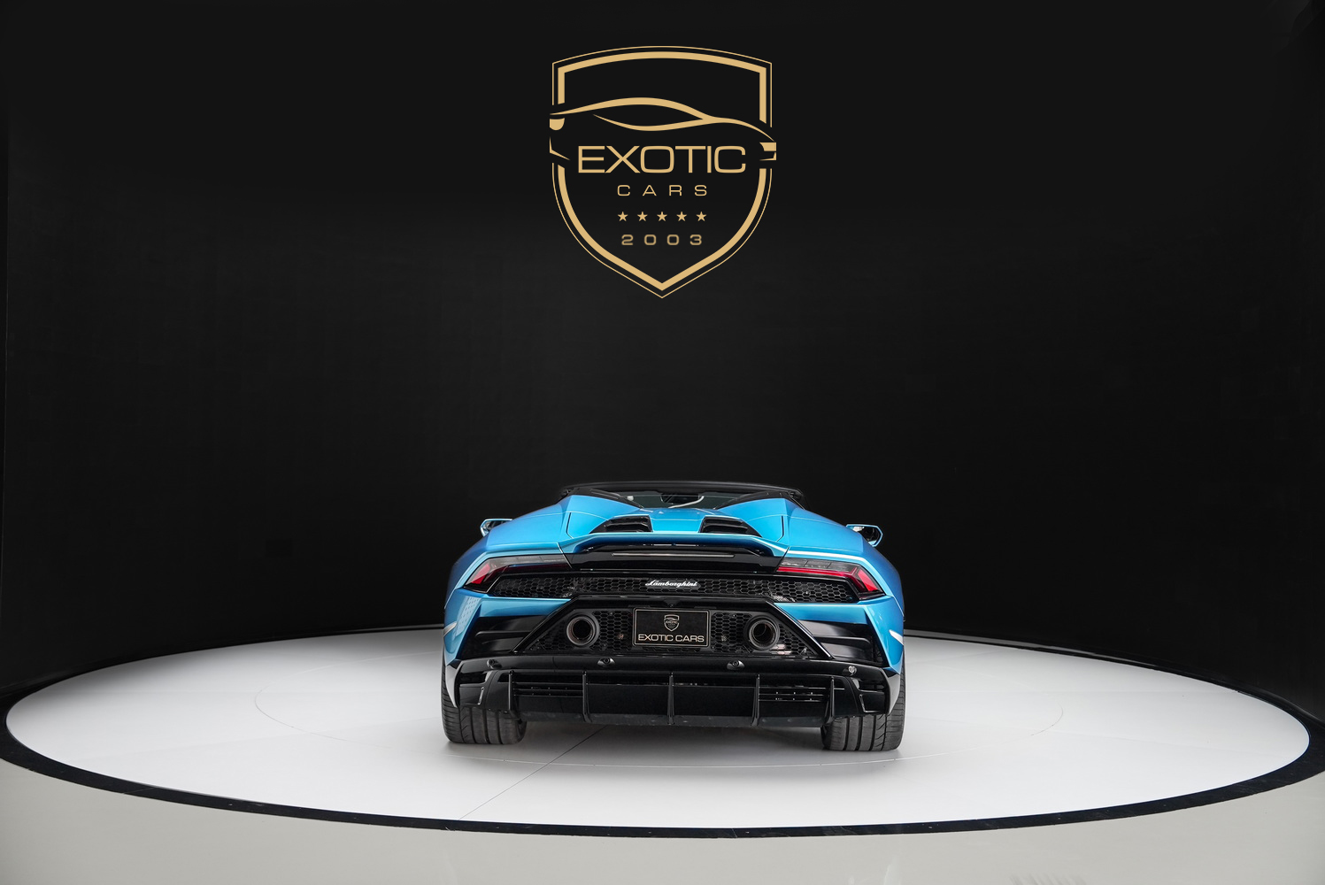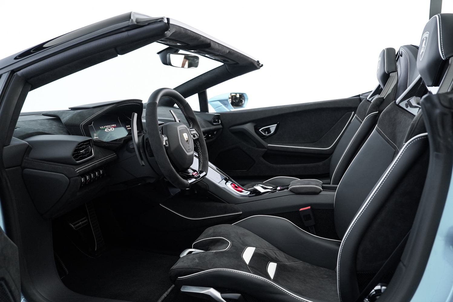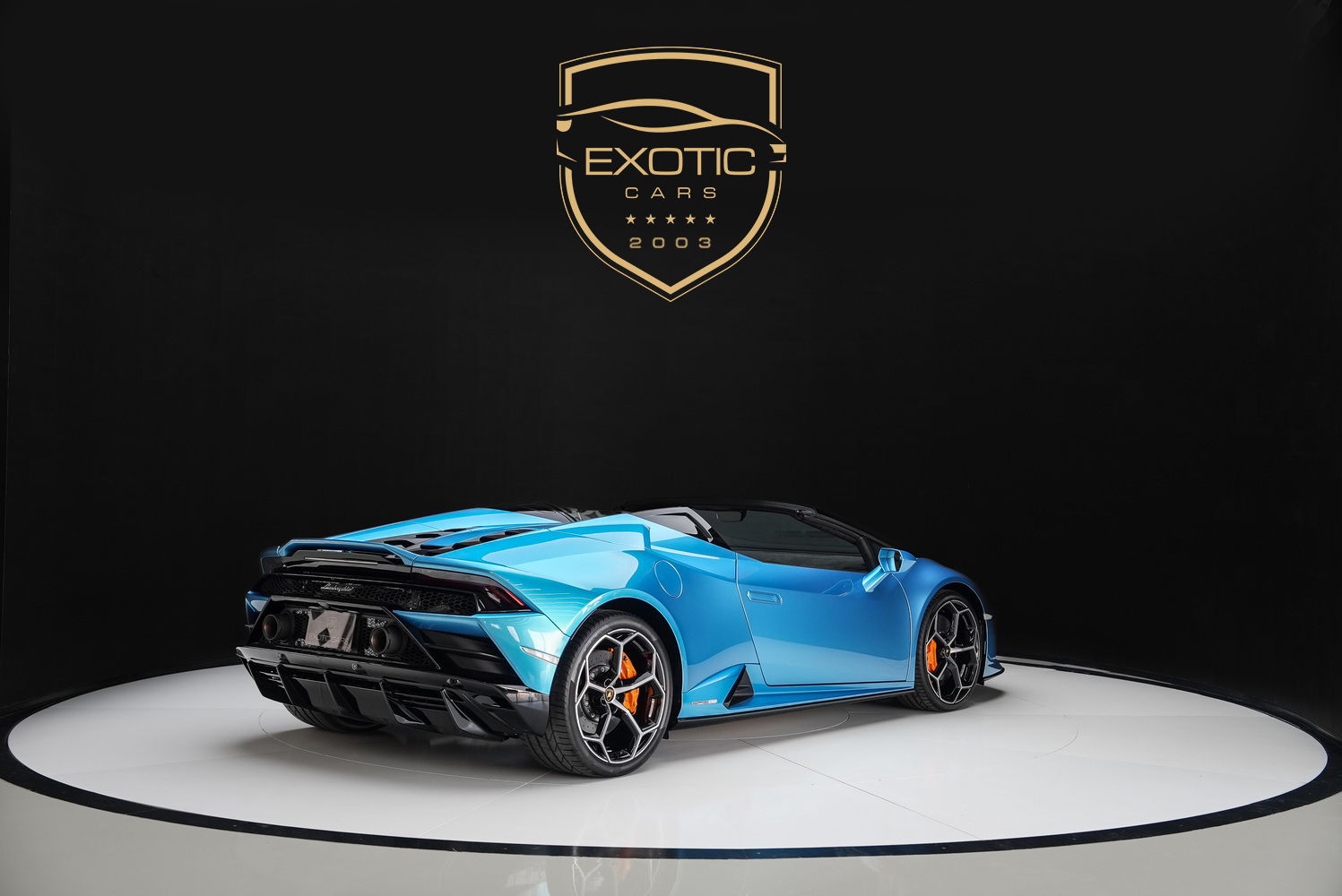 Discover the 2024 Lamborghini Huracán EVO Spyder, finished in Blue with a Black interior, Black soft top, and carbon seats, now available at our flagship showroom.