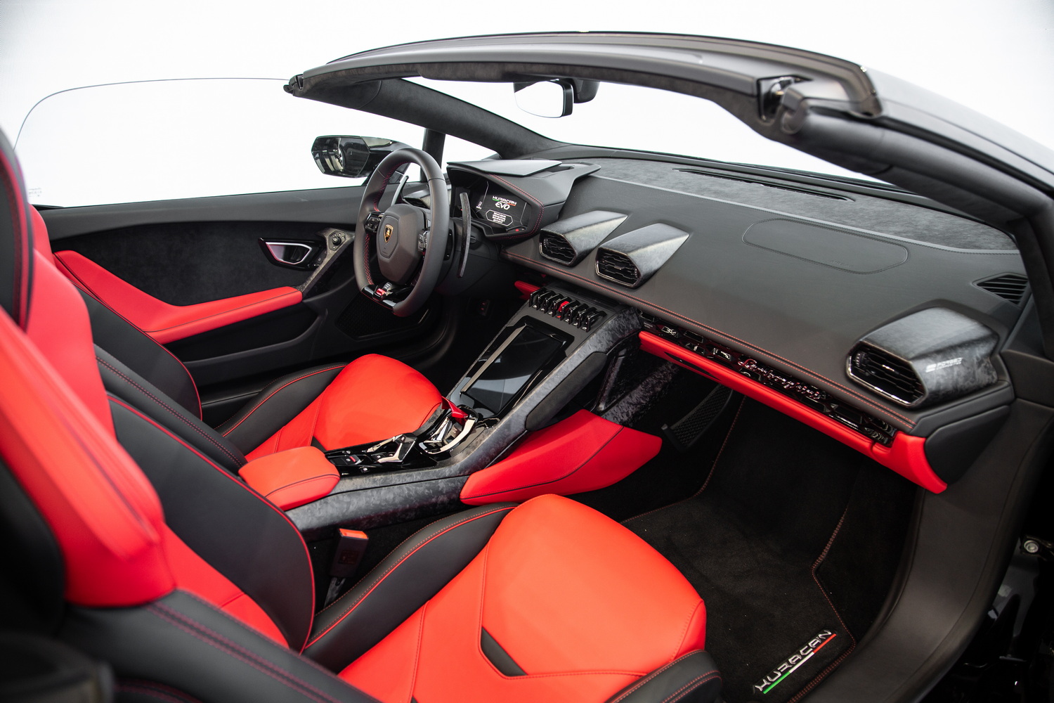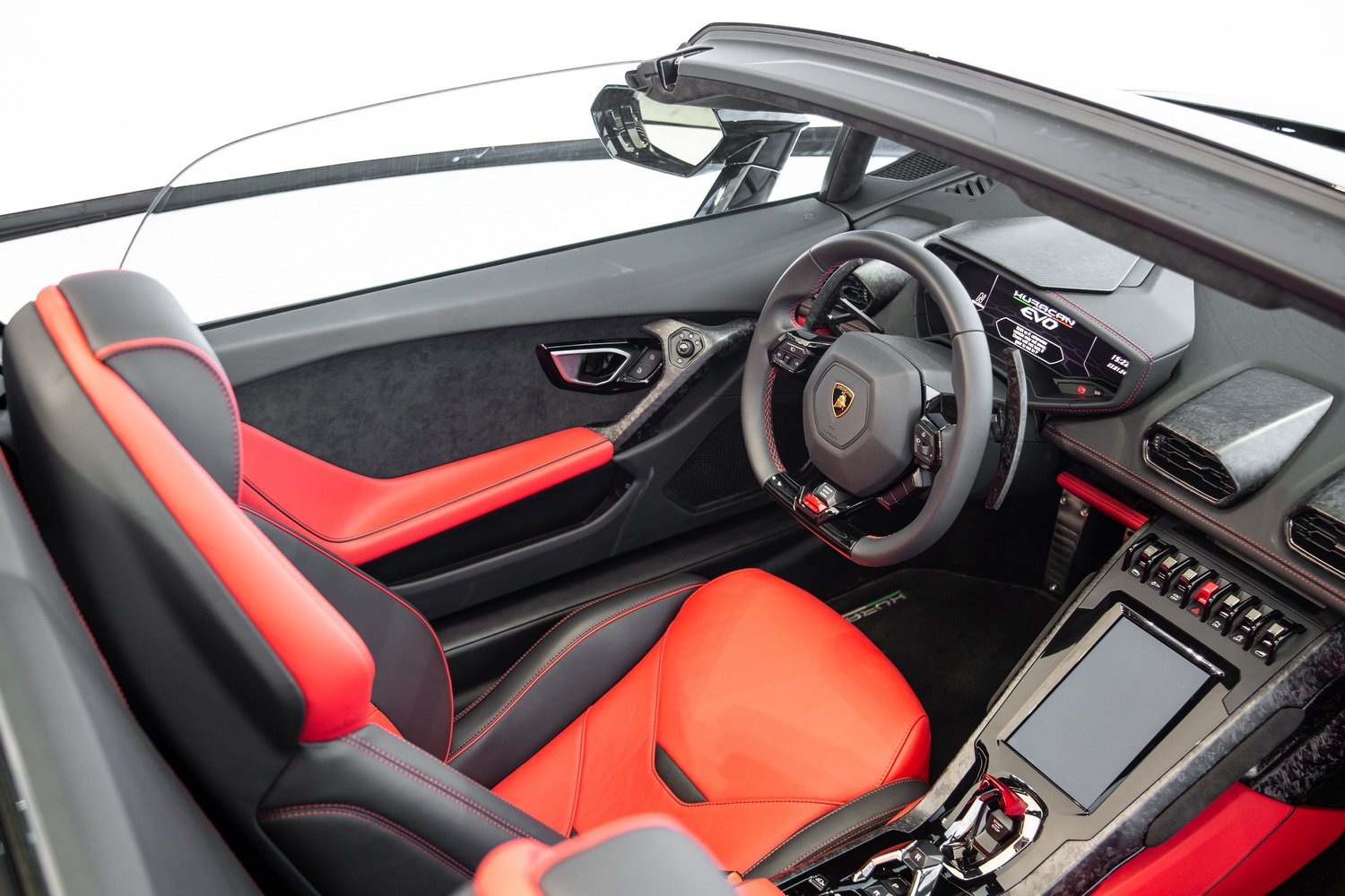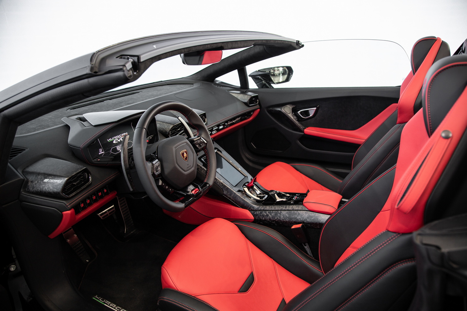Unmatched Interior Craftsmanship: The forged carbon composite trim that adorns the interior of the Huracan EVO Spyder is not just a design element; it's a statement of luxury and cutting-edge technology. This high-quality material enhances the cabin's sporty and sophisticated ambiance, ensuring every drive is as visually stunning as it is exhilarating.