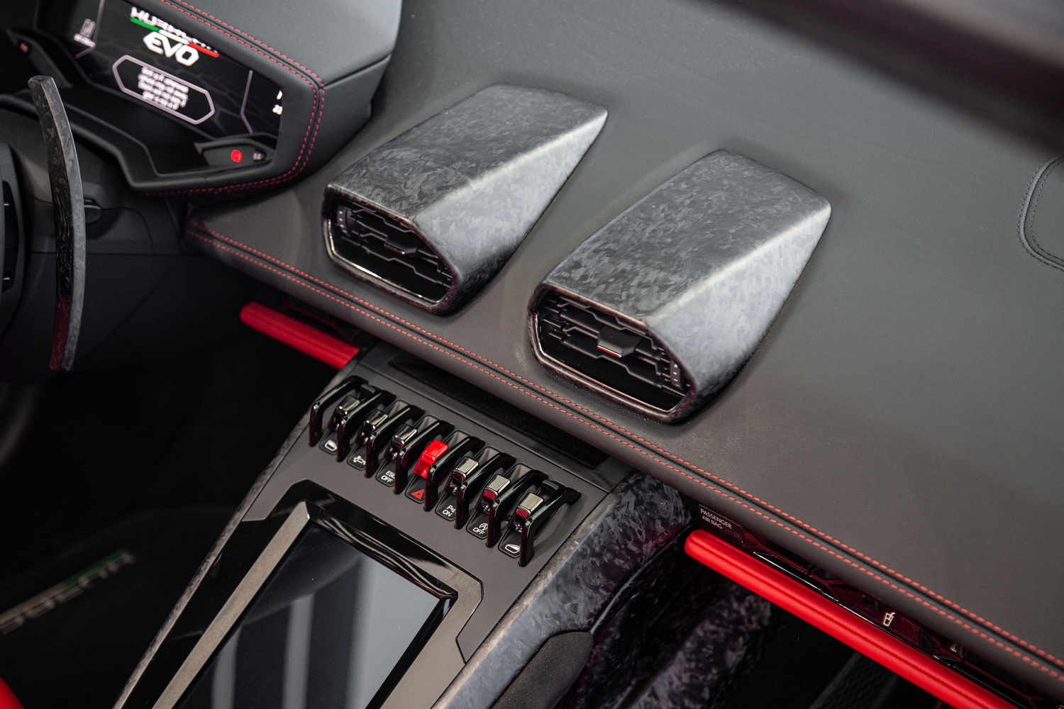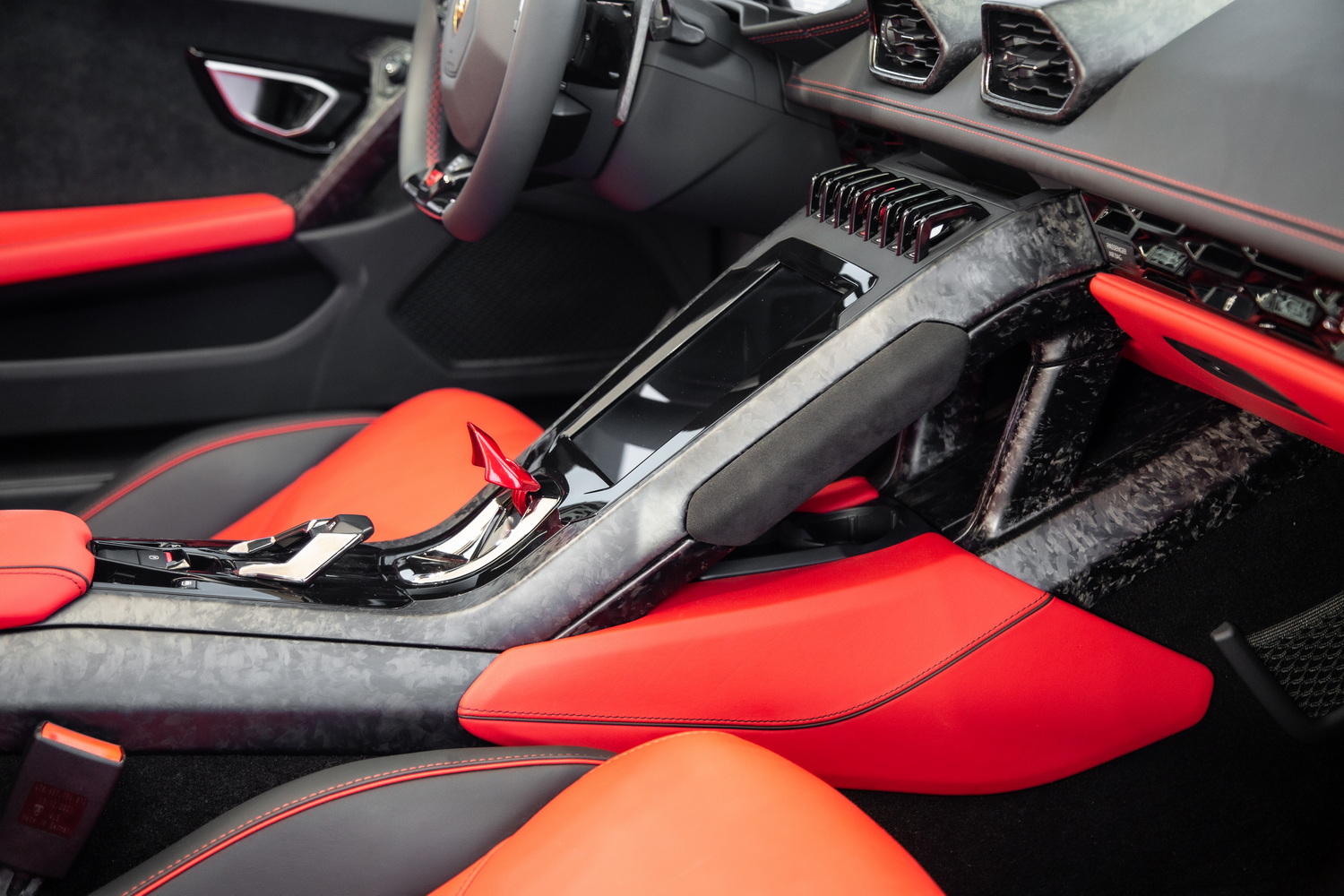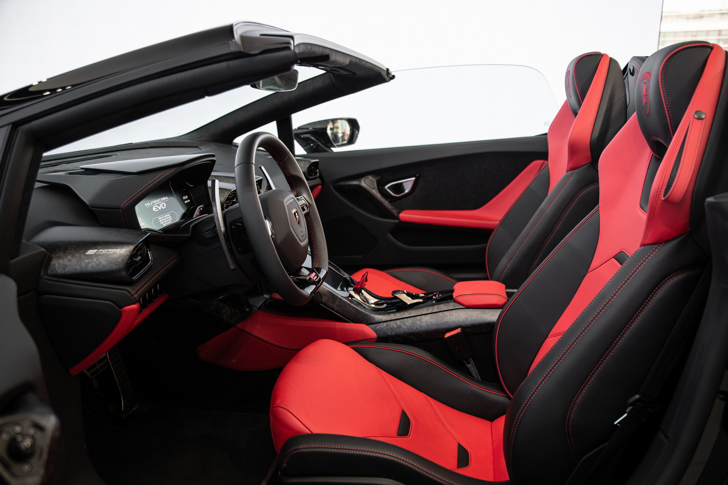 Unmatched Interior Craftsmanship: The forged carbon composite trim that adorns the interior of the Huracan EVO Spyder is not just a design element; it's a statement of luxury and cutting-edge technology. This high-quality material enhances the cabin's sporty and sophisticated ambiance, ensuring every drive is as visually stunning as it is exhilarating.