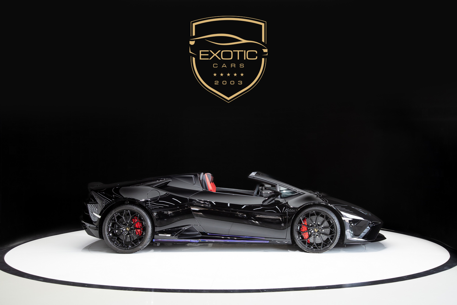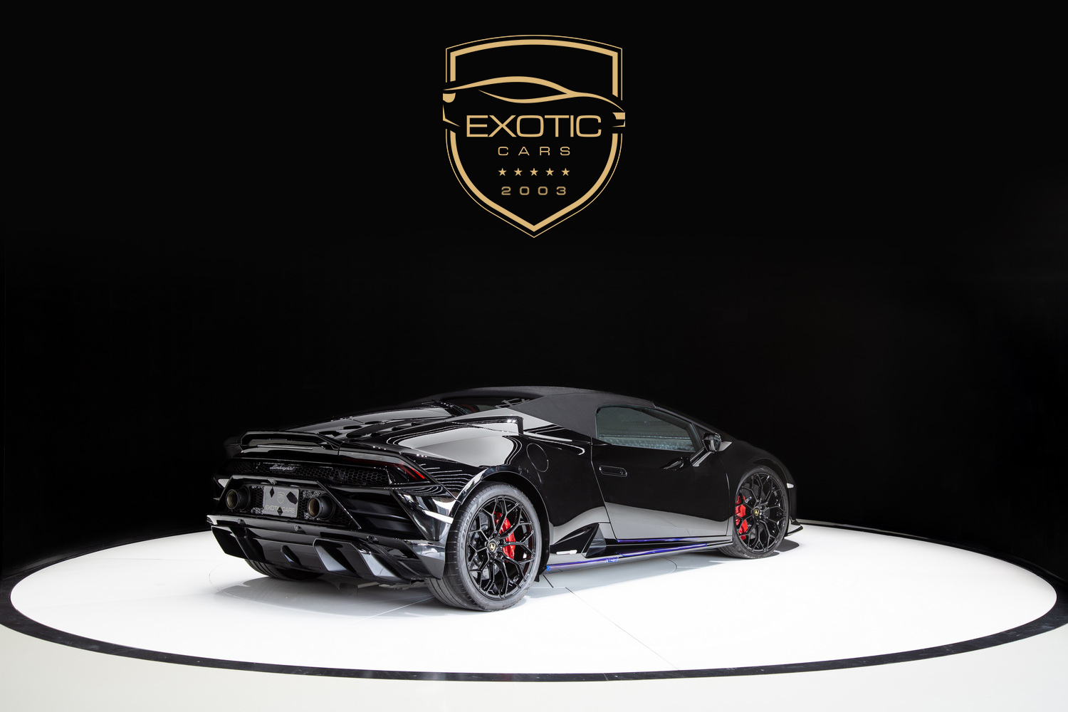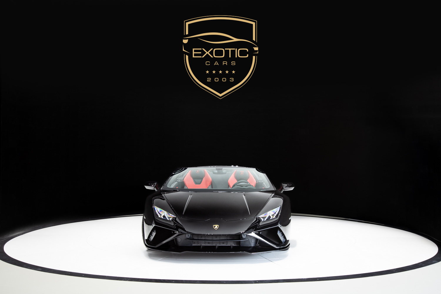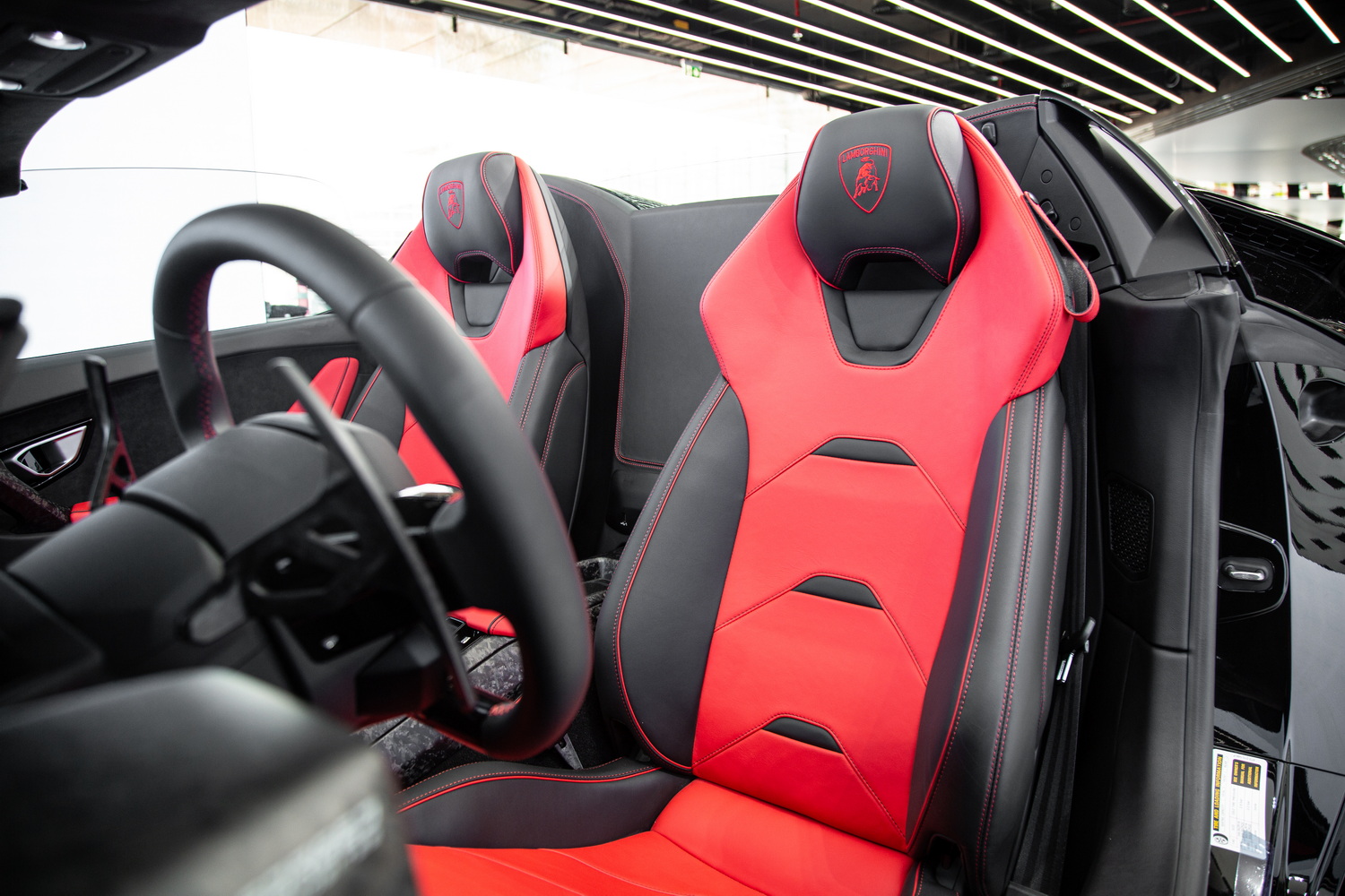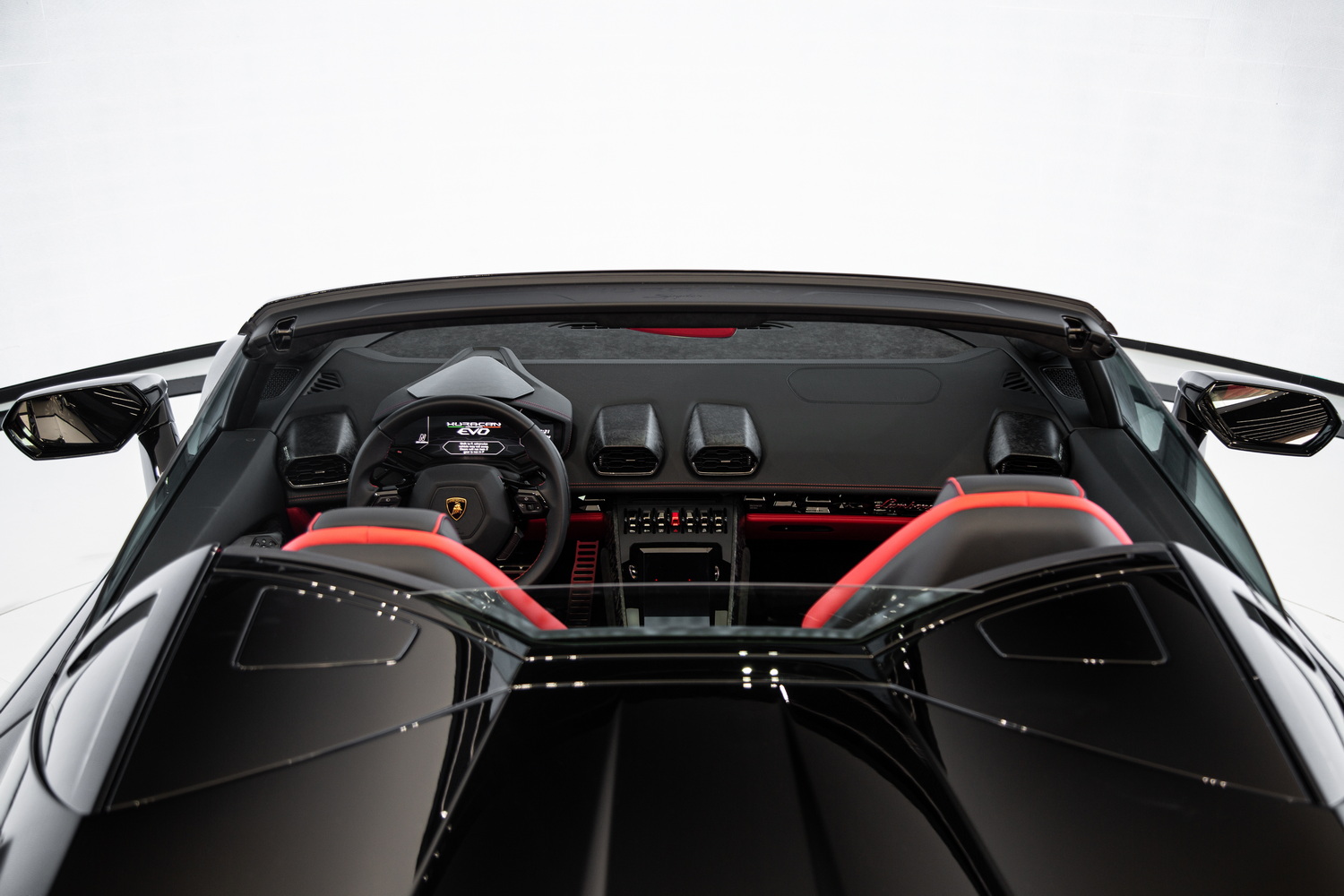 A Design That Exudes Power and Elegance: The black exterior of the Lamborghini Huracan EVO Spyder radiates a commanding presence, while the red and black interior creates a dynamic and immersive environment. The black roof adds a seamless and stylish touch, perfectly complementing the car's bold aesthetics.