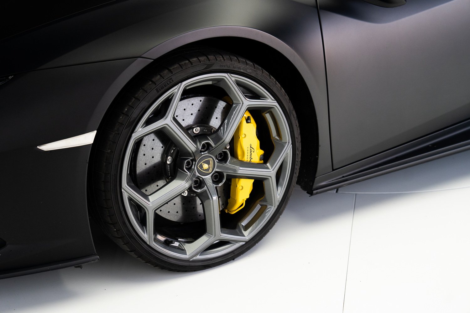 The matt black exterior of the Huracán EVO is designed to turn heads wherever it goes. Its sharp, aerodynamic lines, low-slung body, and aggressive stance make it a true masterpiece. From the front splitter to the rear diffuser, every detail is meticulously crafted to optimize performance and create an undeniable road presence.