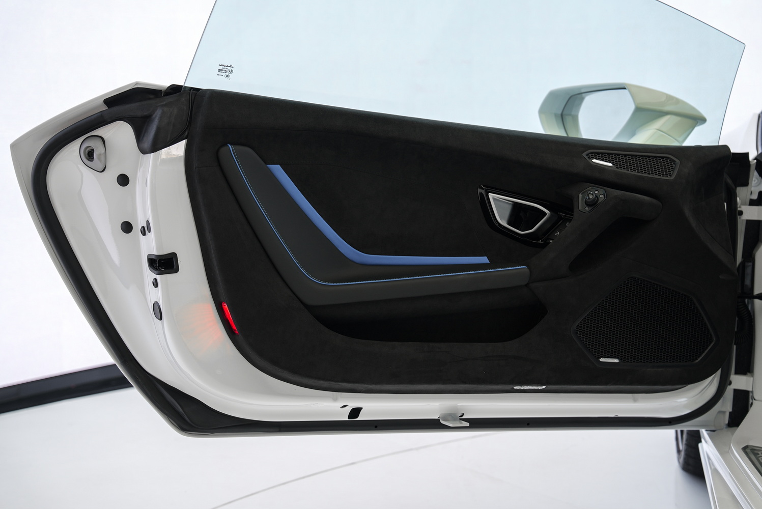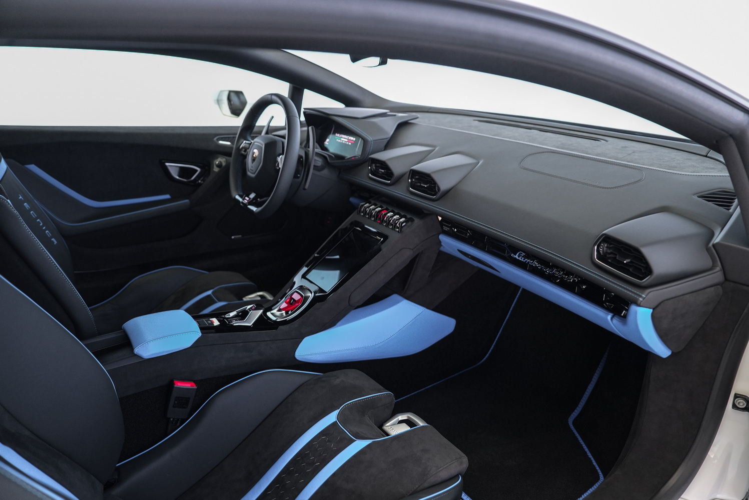 Inside, the black and blue interior creates a perfect blend of luxury and sportiness. The premium leather upholstery, accented with blue stitching, delivers comfort while reflecting Lamborghini’s dedication to quality craftsmanship. The racing-inspired seats provide excellent support for high-performance driving, and the infotainment system keeps you connected to the world while you focus on the road ahead. The interior is designed to provide an immersive driving experience, making every journey behind the wheel a thrilling adventure.
