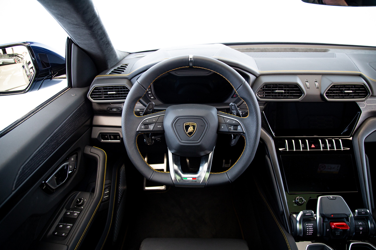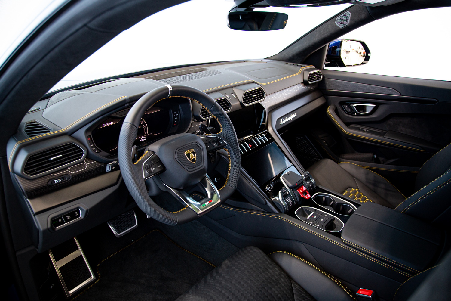 Introducing the new 2023 Lamborghini Urus S, the epitome of high-performance SUVs. This remarkable vehicle comes with a host of exciting features that set it apart from its predecessors. Prepare to be captivated by the striking blue exterior that accentuates the dynamic design of the Urus S. Step inside the cabin, and you'll be greeted by a luxurious black and yellow interior, exuding a perfect blend of style and sportiness.