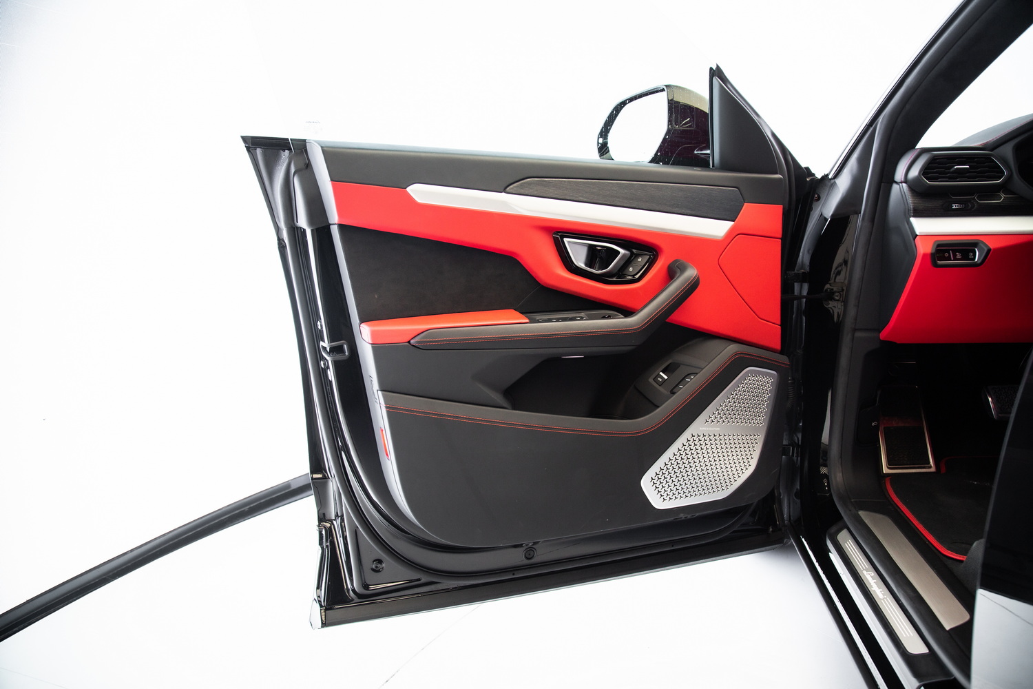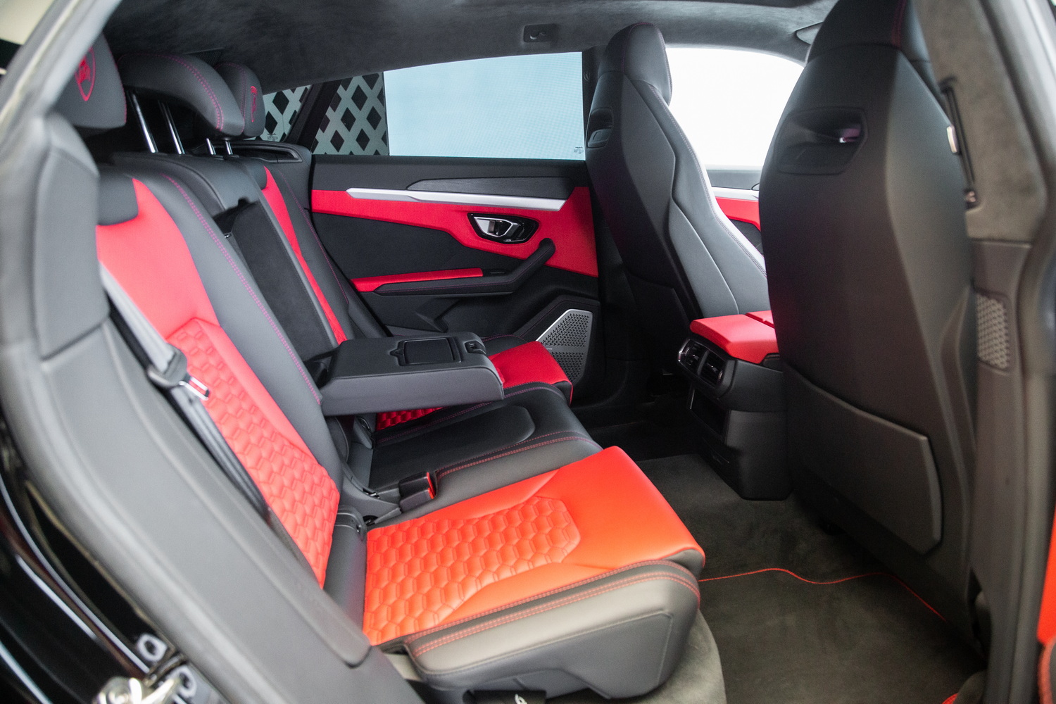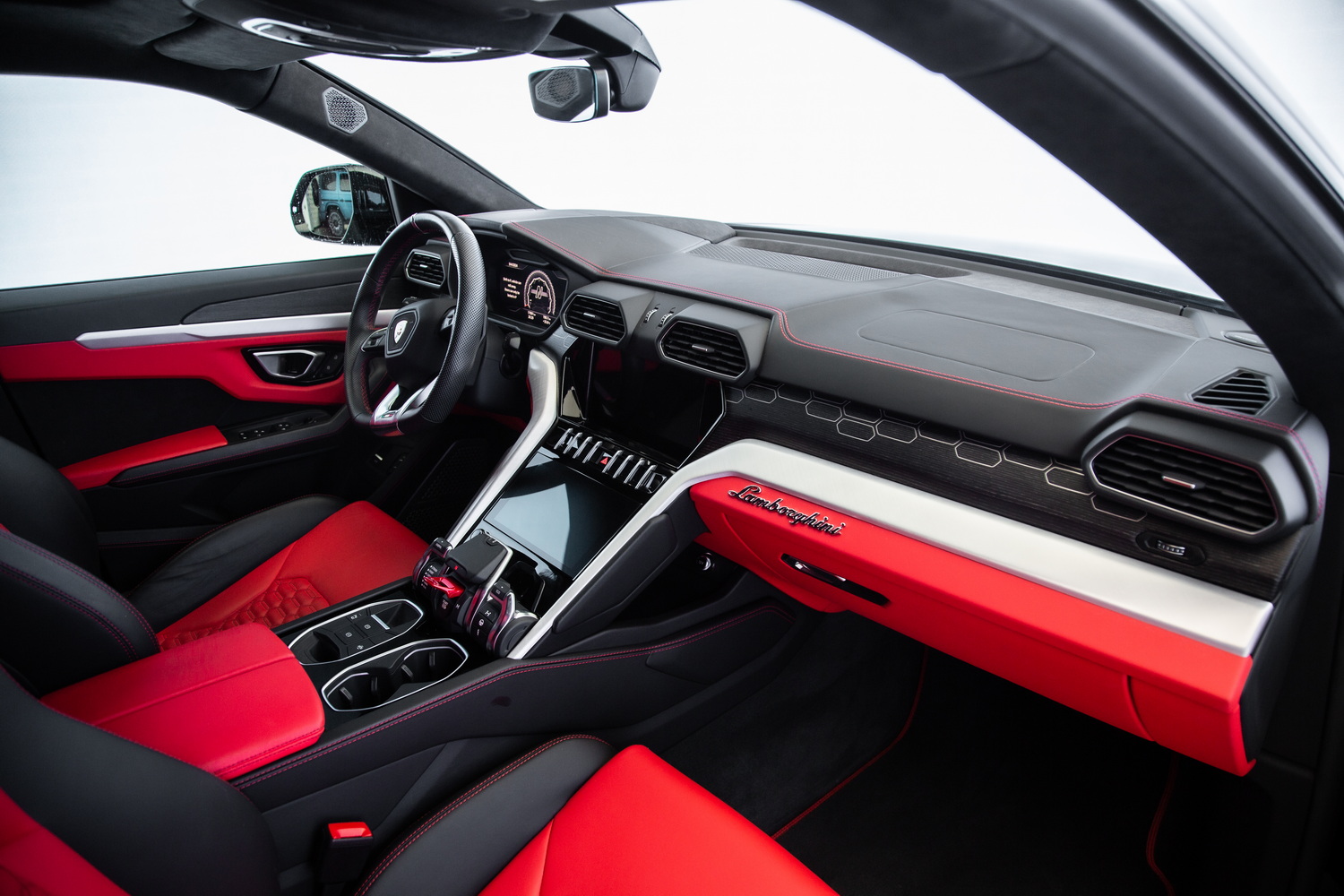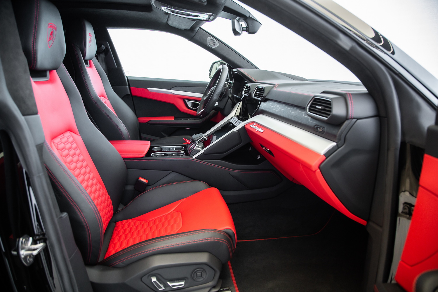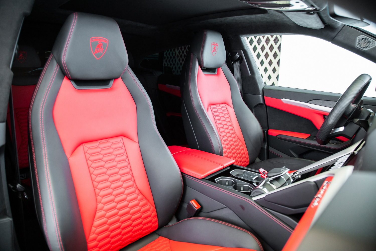 Step inside the Urus to experience a lavish red interior that contrasts beautifully with the exterior. The rich red leather upholstery, accented with red stitching on the seats, adds a touch of luxury and sportiness. The interior is designed to offer both comfort and style, making every journey a pleasure.