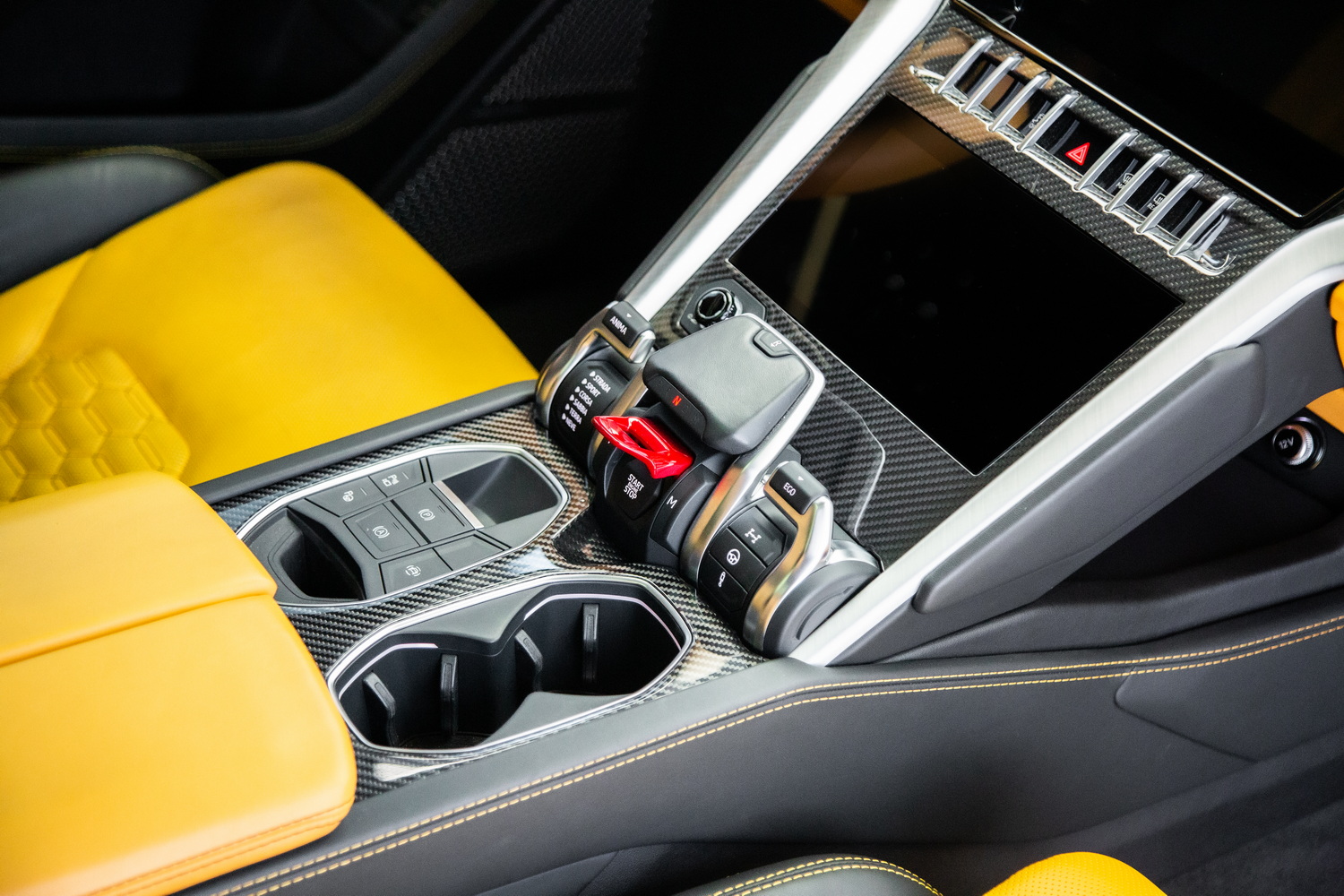 Inside, the Urus showcases a striking yellow and black interior, creating a vibrant contrast that highlights the vehicle's luxurious craftsmanship. The seats feature yellow leather stitching, providing an extra touch of elegance and attention to detail. The combination of premium materials and sporty aesthetics perfectly balances comfort and performance for both the driver and passengers.