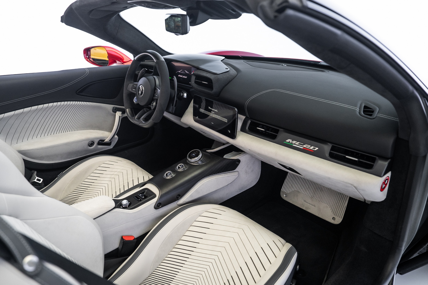 The red exterior of the MC20 Cielo Spider commands attention on any road. Its aerodynamic silhouette, enhanced by carbon accents, is a testament to Maserati's engineering prowess. The convertible design allows you to experience the thrill of open-air driving while showcasing the car’s aggressive yet elegant styling.