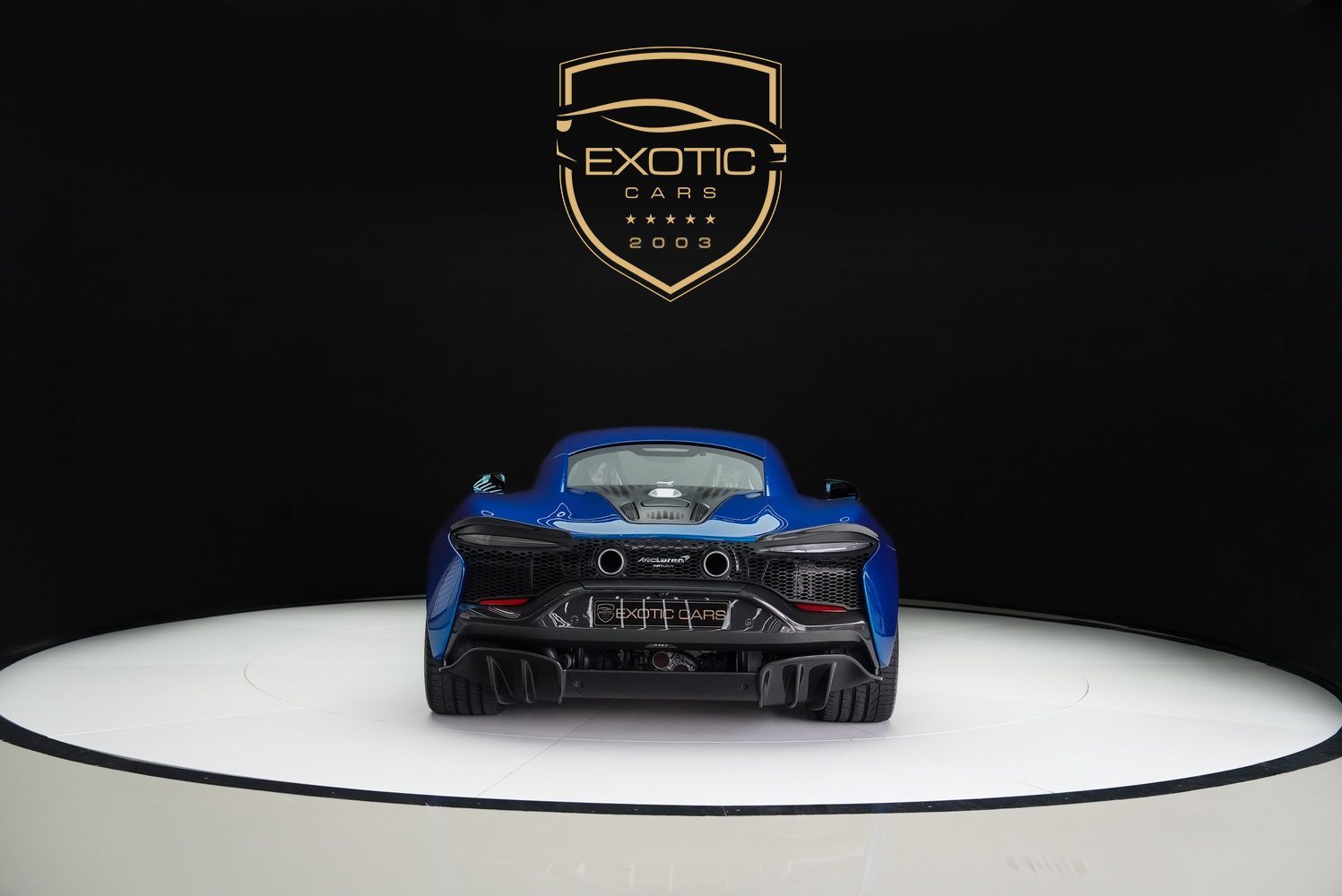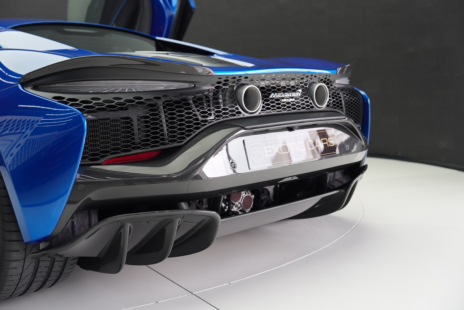 The Blue exterior highlights the Artura’s sleek aerodynamics and lightweight carbon-fiber monocoque chassis, ensuring a perfect balance of agility and strength. Featuring: