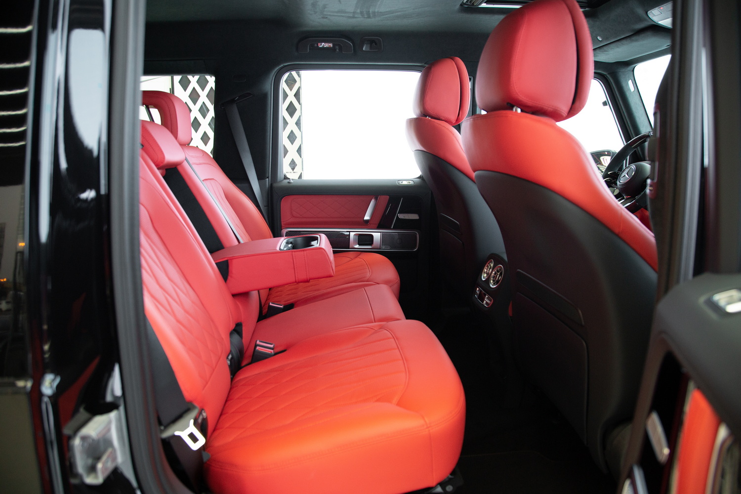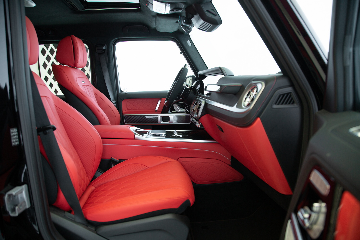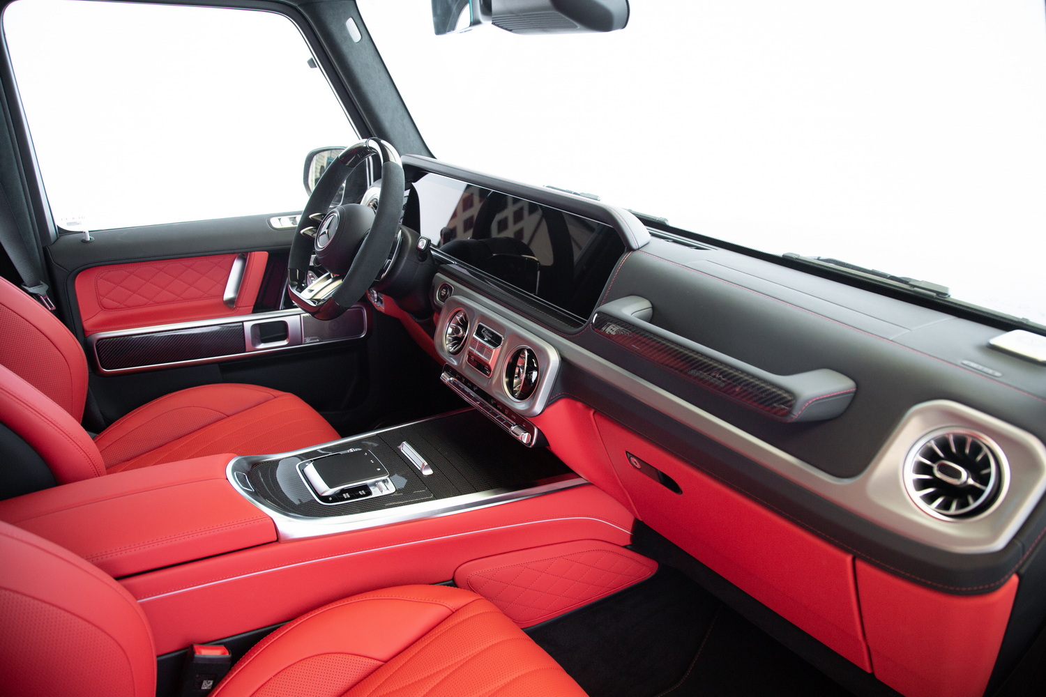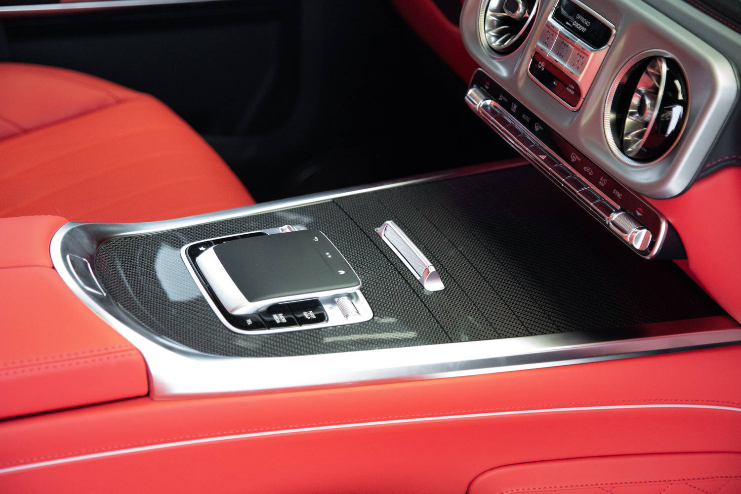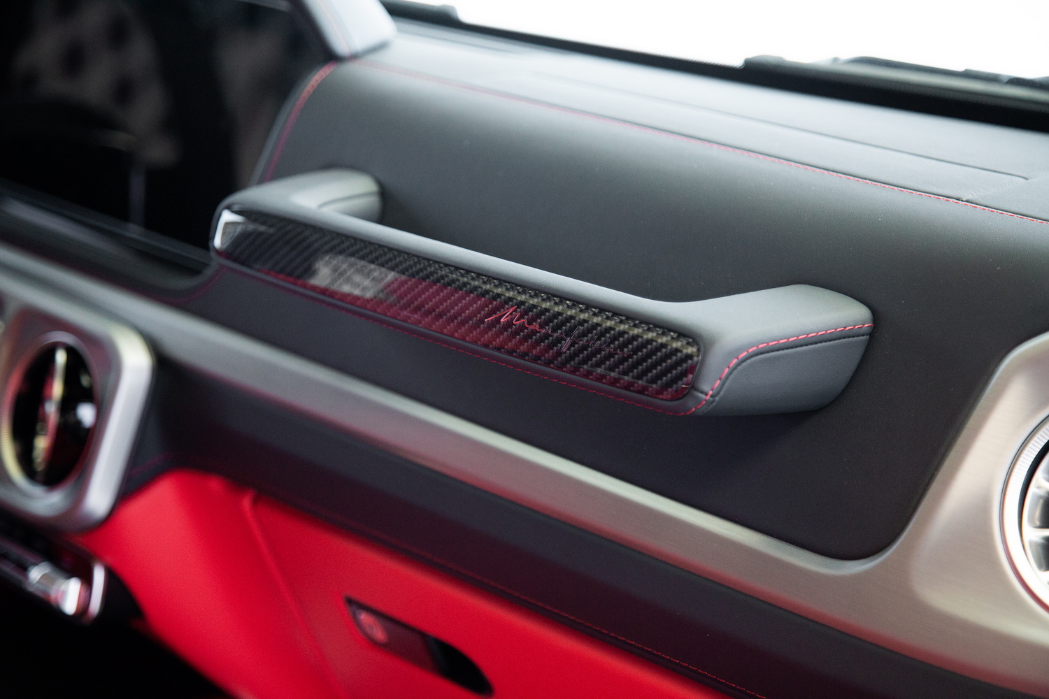 Step inside, and you are greeted by an opulent red leather interior, offering a perfect blend of style and comfort. The high-quality materials and meticulously crafted details provide a refined driving experience. What sets this model apart is its extensive carbon fibre trim, applied both inside and out. The interior carbon accents highlight the G63 AMG's performance-driven design while adding a modern, sophisticated touch. The exterior carbon elements further enhance its aggressive yet refined appearance, making it an ideal choice for those who appreciate both luxury and power.