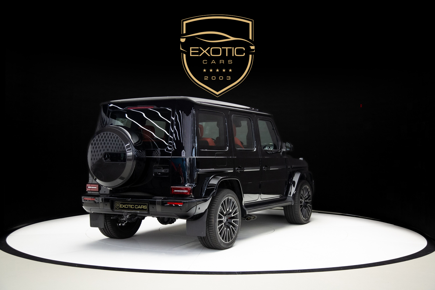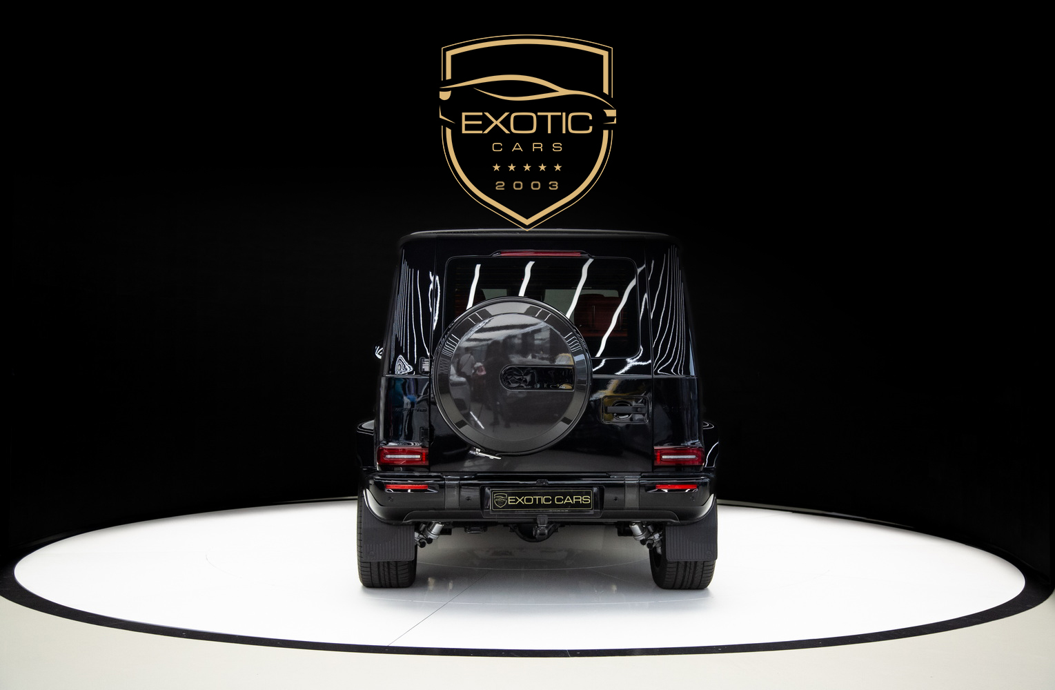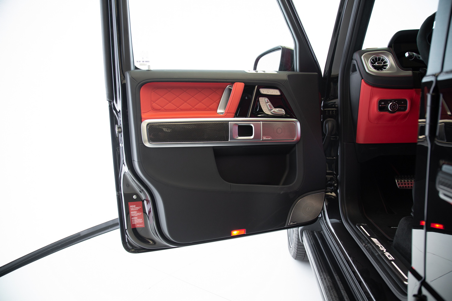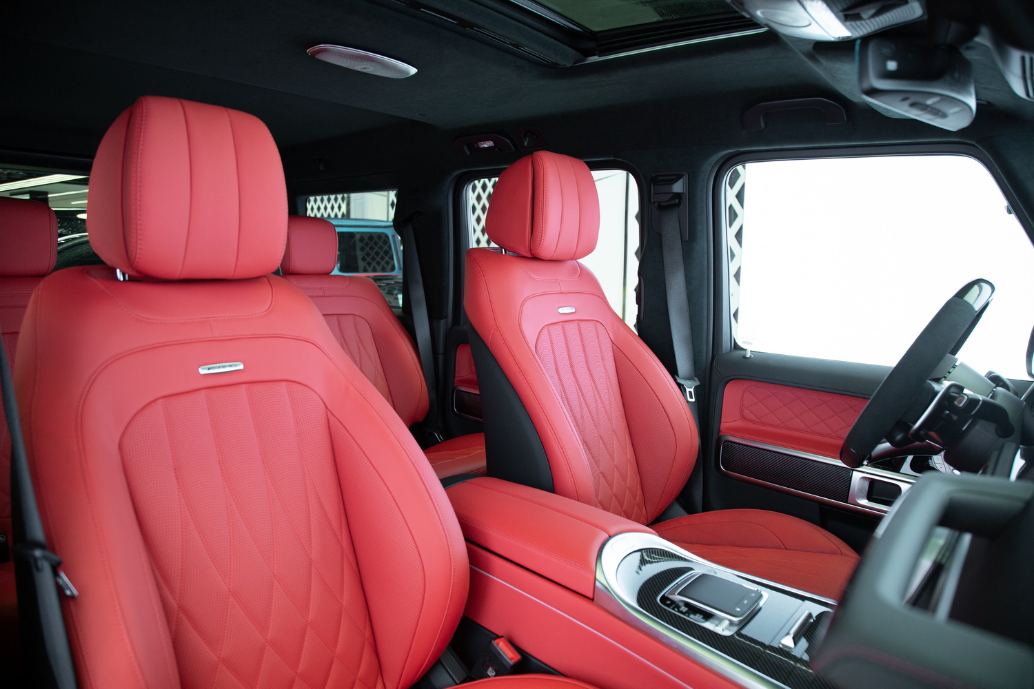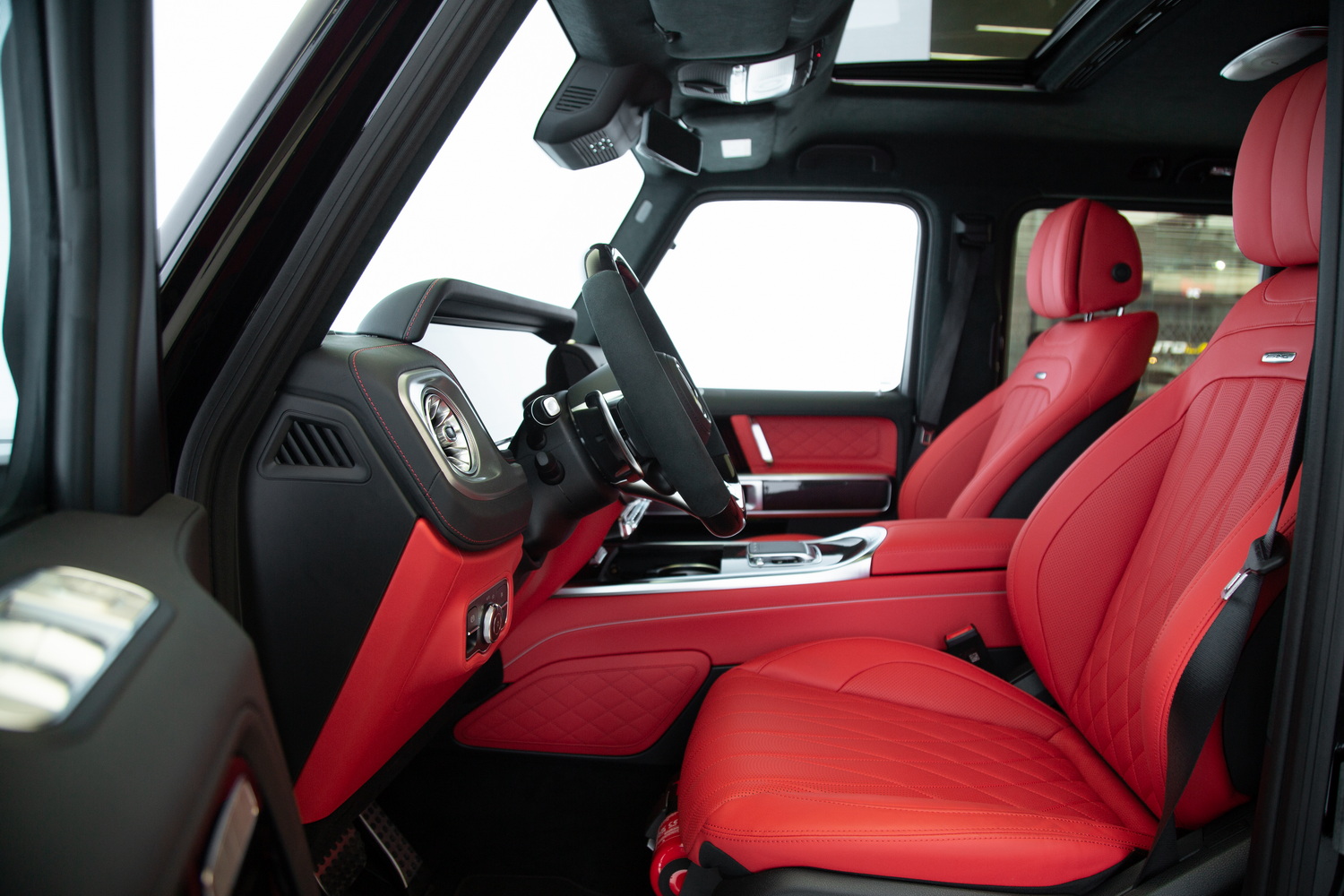 Step inside, and you are greeted by an opulent red leather interior, offering a perfect blend of style and comfort. The high-quality materials and meticulously crafted details provide a refined driving experience. What sets this model apart is its extensive carbon fibre trim, applied both inside and out. The interior carbon accents highlight the G63 AMG's performance-driven design while adding a modern, sophisticated touch. The exterior carbon elements further enhance its aggressive yet refined appearance, making it an ideal choice for those who appreciate both luxury and power.