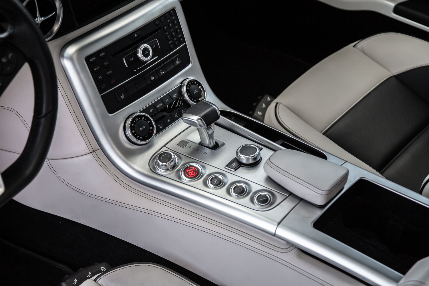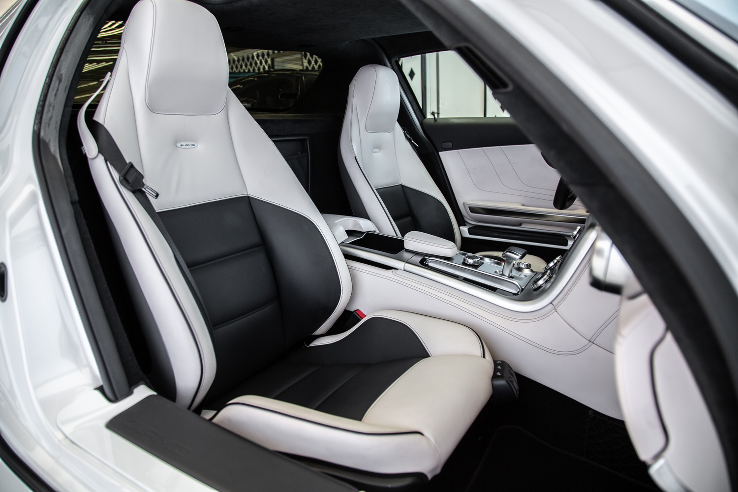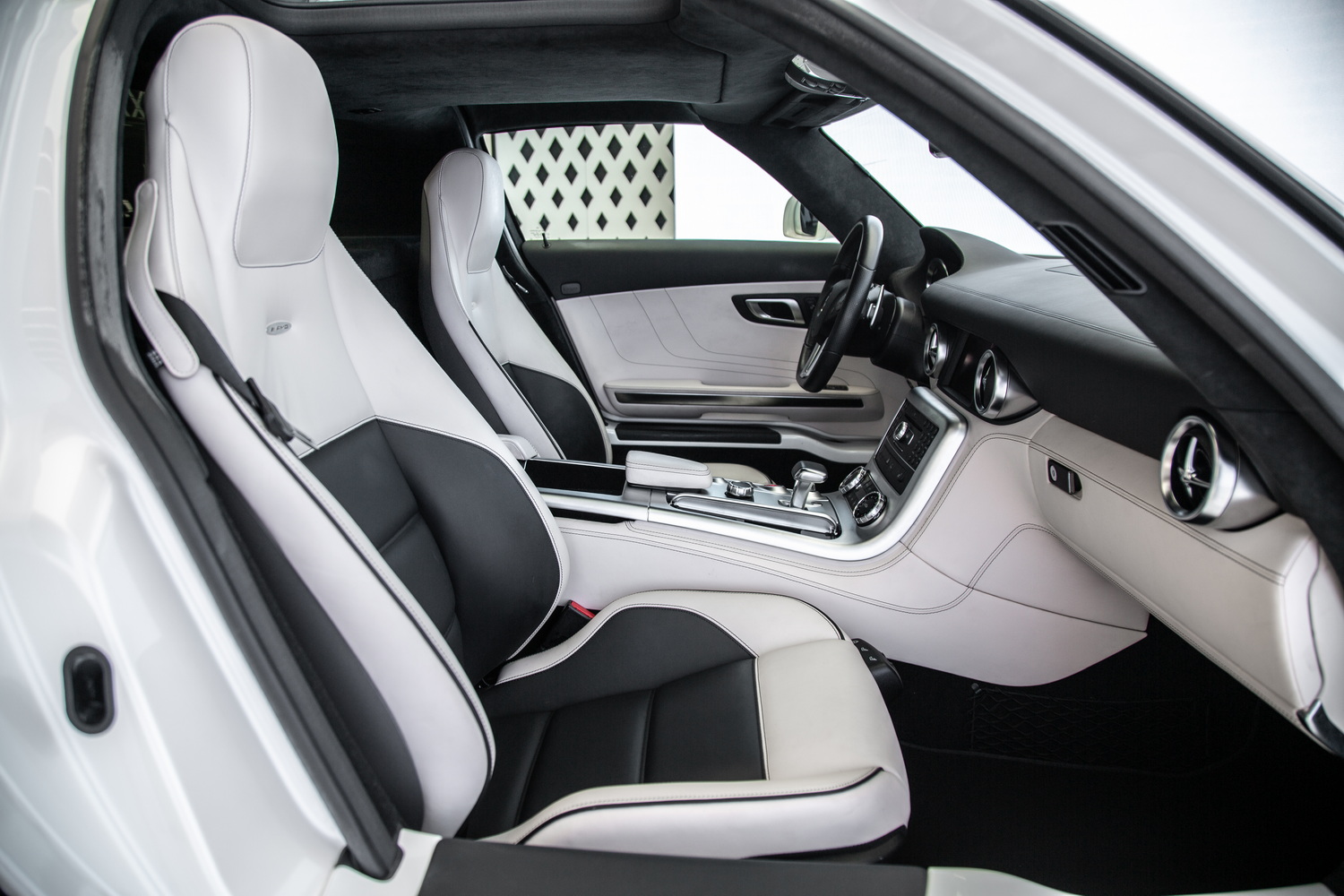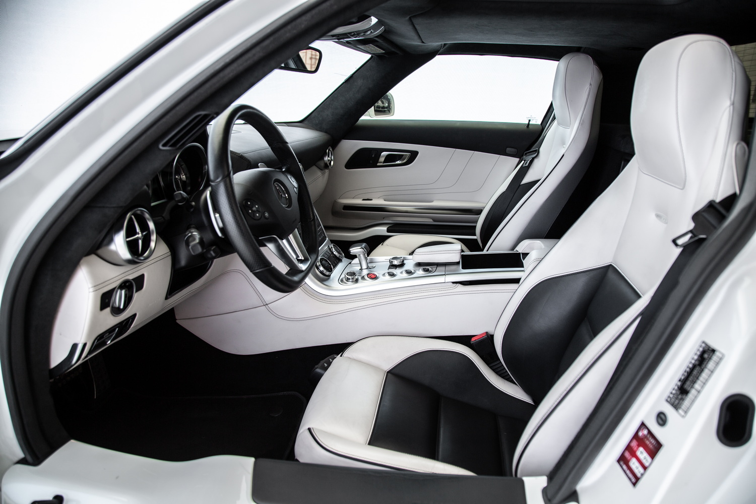 Step inside the SLS AMG, and you're greeted by a luxurious two-tone white and black interior. The cabin is a perfect balance of style and function, combining high-quality leather with premium materials throughout. The two-tone colour scheme offers a sophisticated contrast, creating a sense of both luxury and sportiness. Every detail, from the hand-stitched leather to the carefully designed dashboard, is focused on the driver, ensuring an exceptional driving experience.