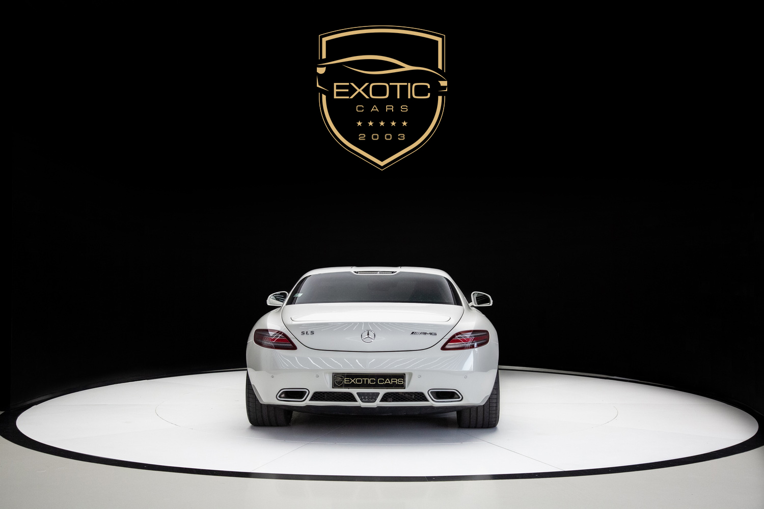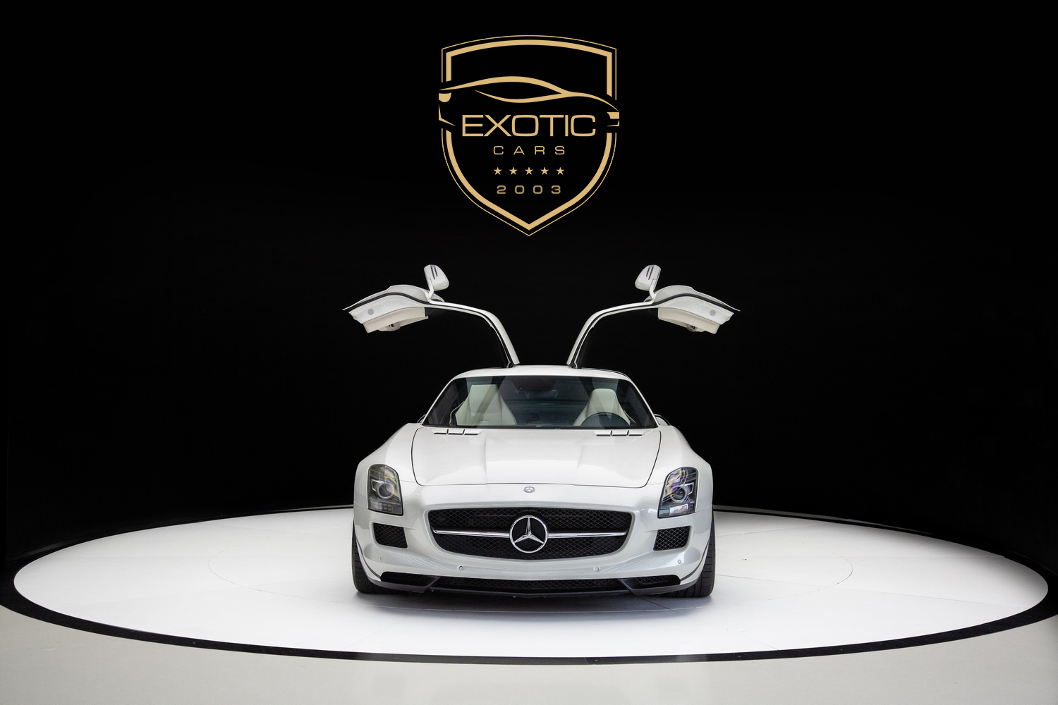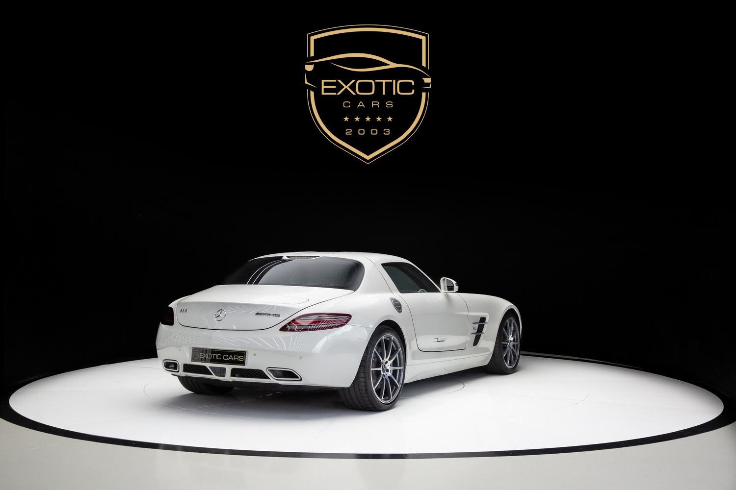 The 2010 Mercedes-Benz SLS AMG, with a white exterior and a stunning two-tone white and black interior, is available for sale in Dubai at Exotic Cars Dubai.