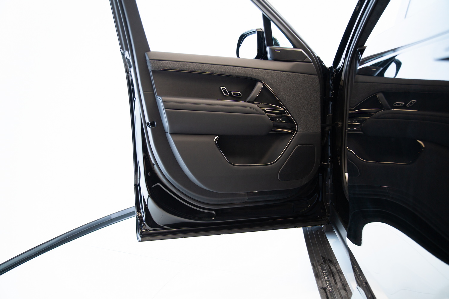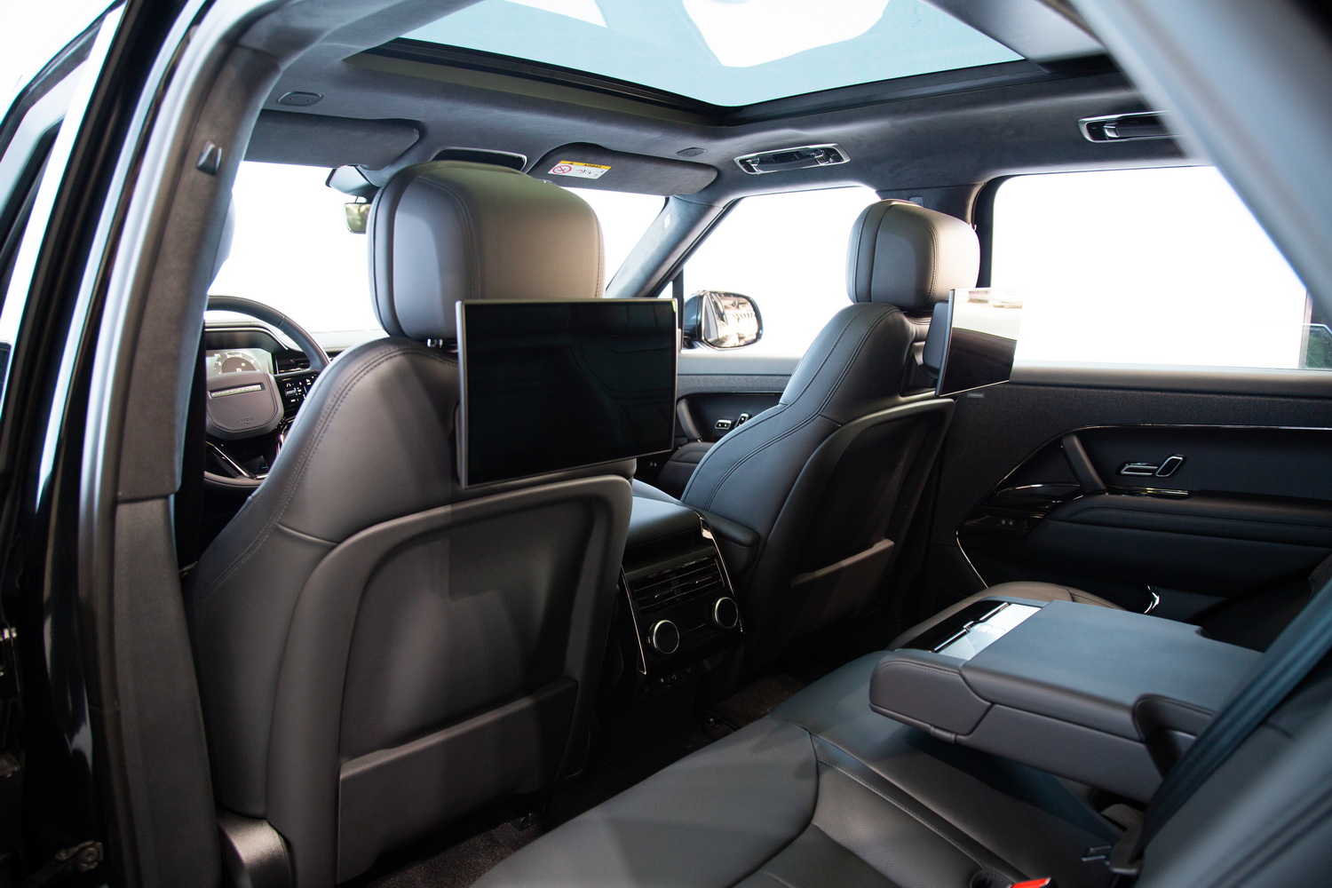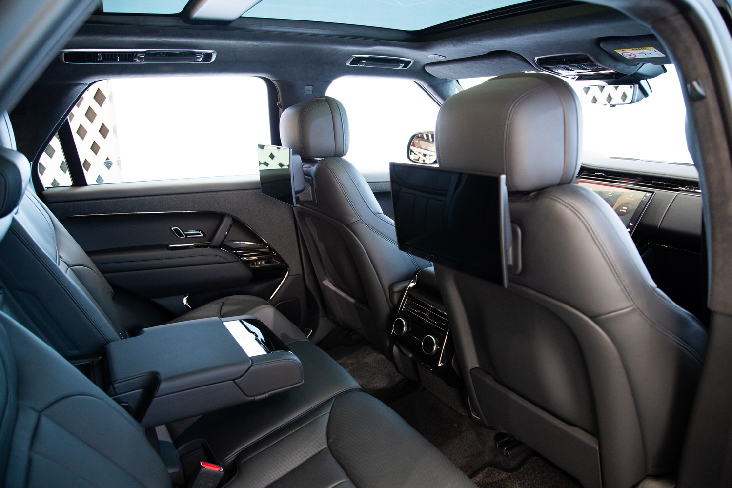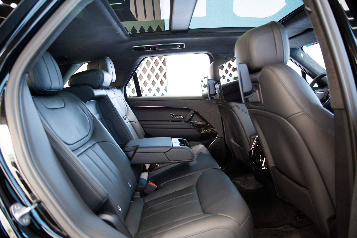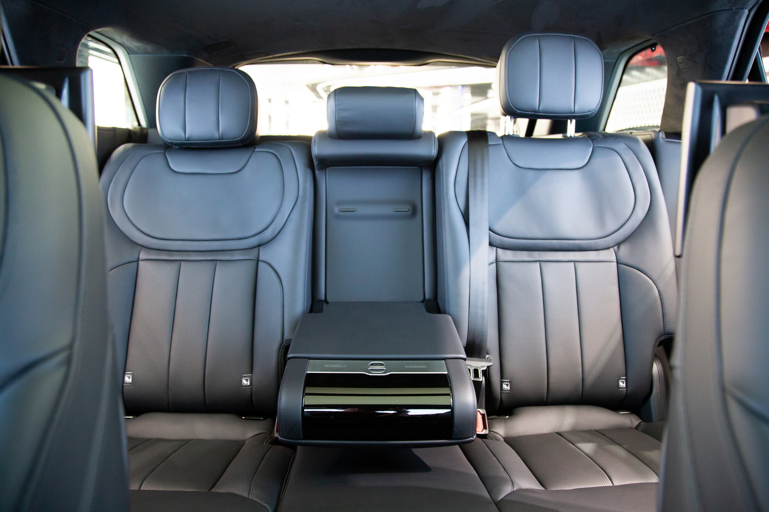 Step inside, and you're immediately ensconced in an environment of opulent comfort and state-of-the-art technology. The black leather upholstery is impeccably crafted, creating a sumptuous interior that perfectly matches the exterior. Further elevating the in-cabin experience are rear entertainment systems that promise to keep every journey entertaining for all passengers.