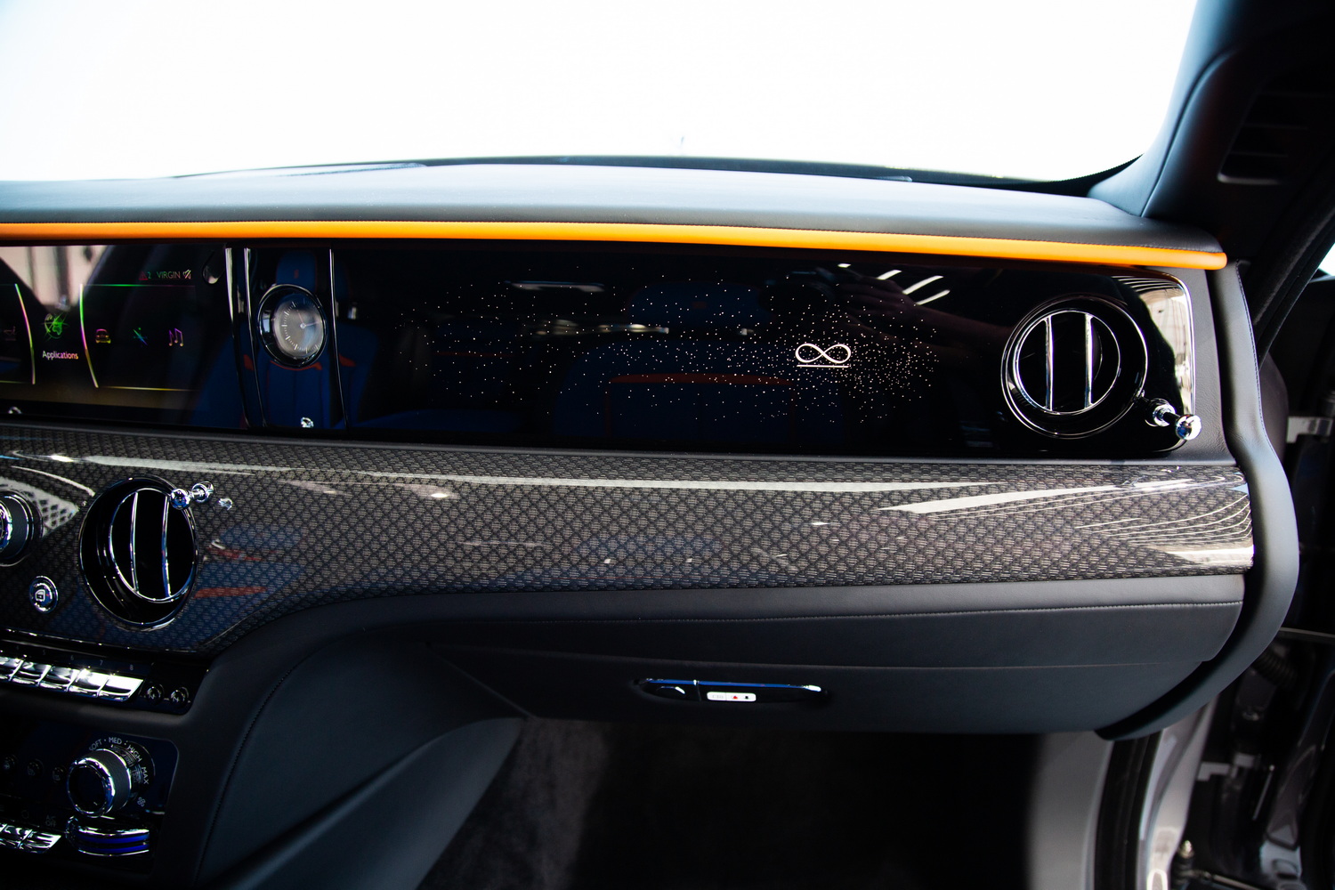The interior features a complex weave of carbon and metallic fibers, creating a deep diamond pattern that is both subtle and intricate. The Illuminated Fascia, displaying a glowing Lemniscate surrounded by over 850 stars, provides an ethereal ambiance, ensuring every drive is under the stars.