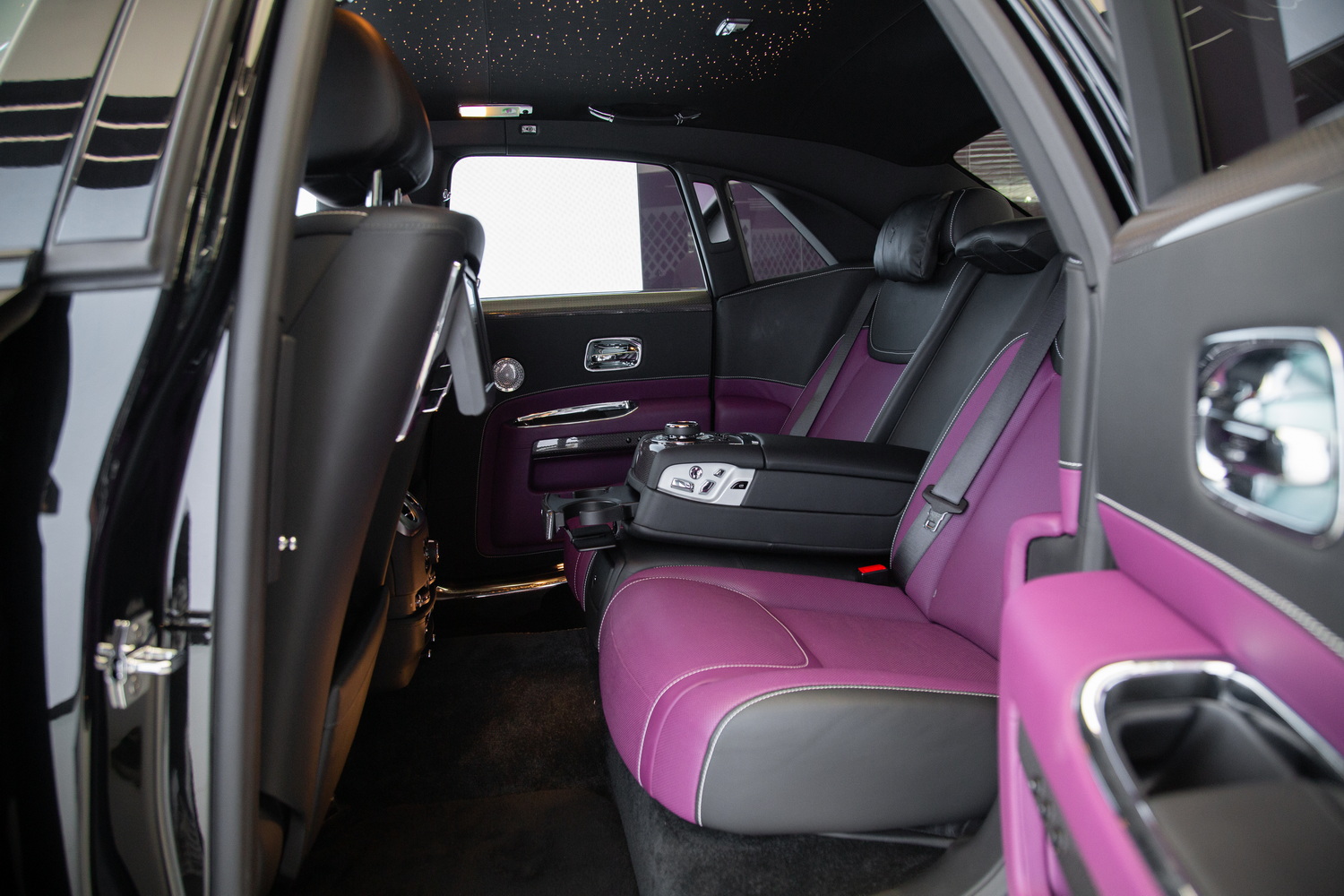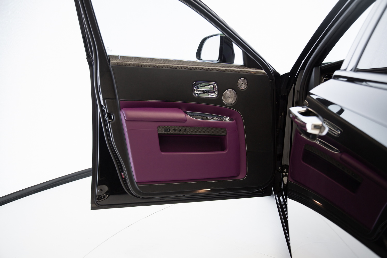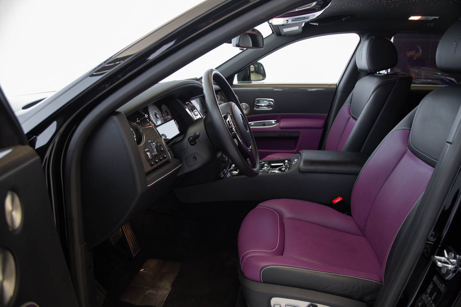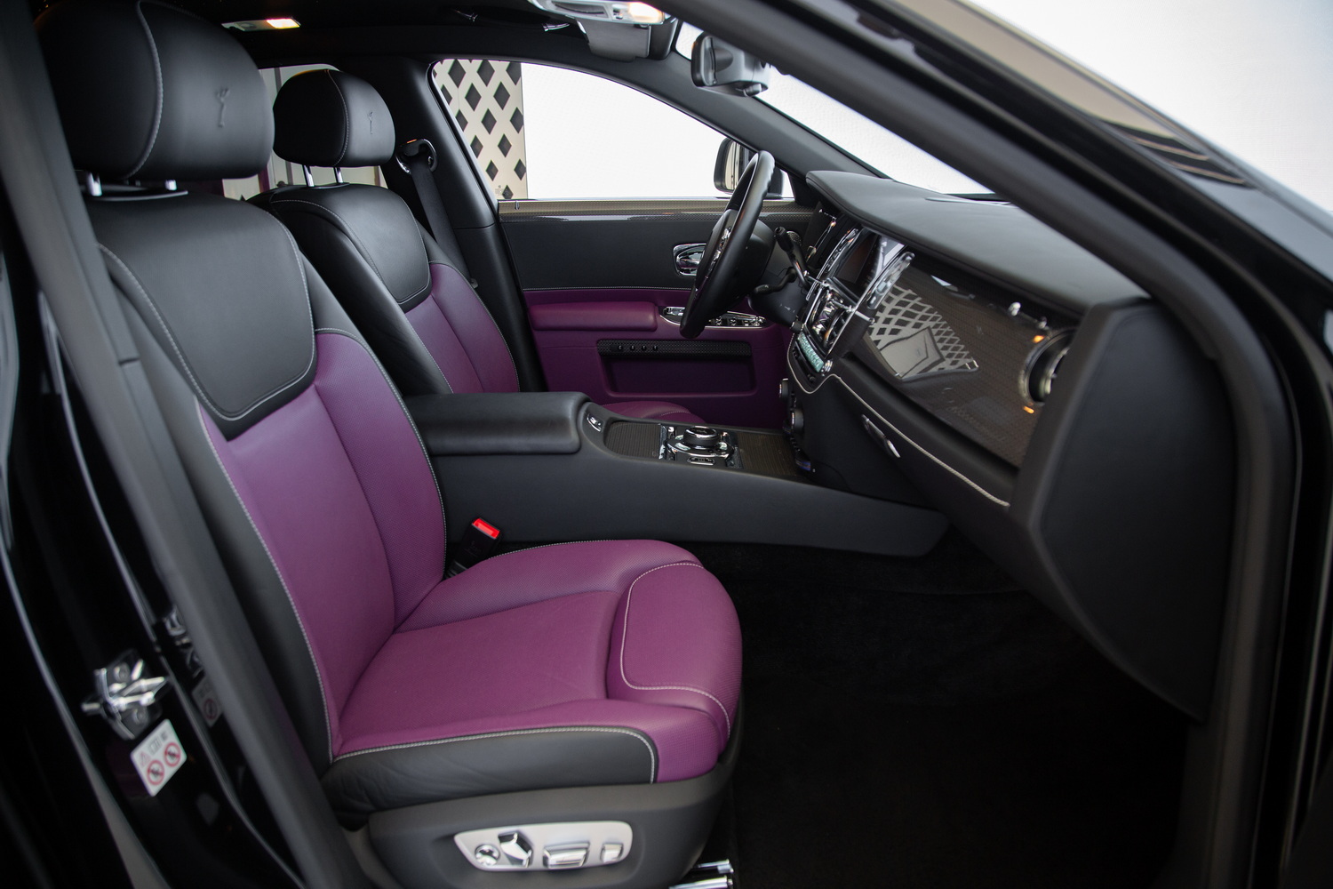 The 2018 Rolls-Royce Ghost Black Badge is designed for those who demand more than just luxury; they seek a vehicle that combines traditional elegance with a more assertive and powerful presence. The black exterior of the Ghost Black Badge exudes a timeless sophistication, while the unique purple and black interior creates a lavish and distinctive environment, showcasing Rolls-Royce's commitment to bespoke craftsmanship and luxury.
