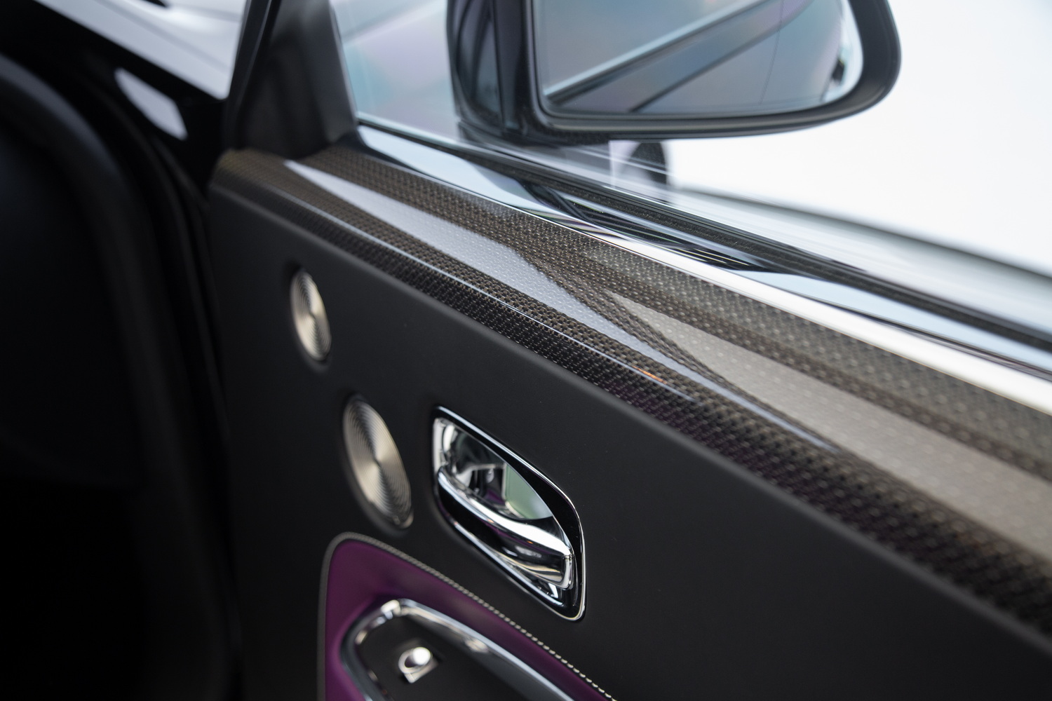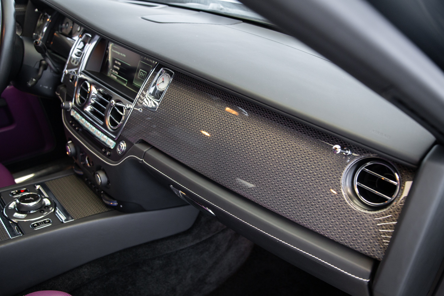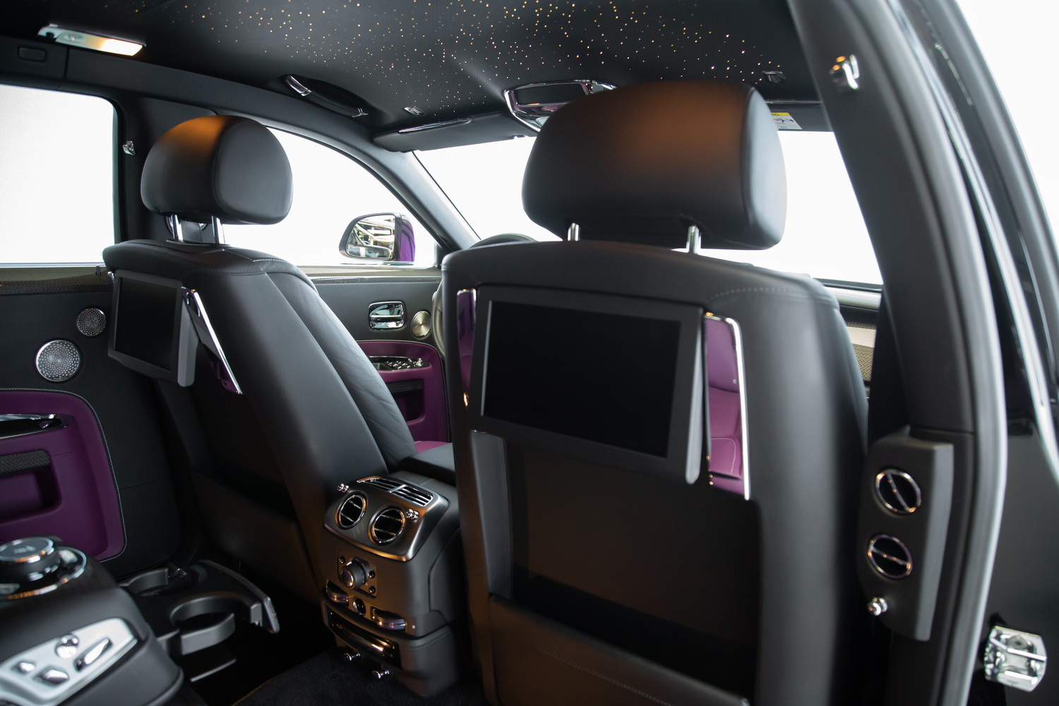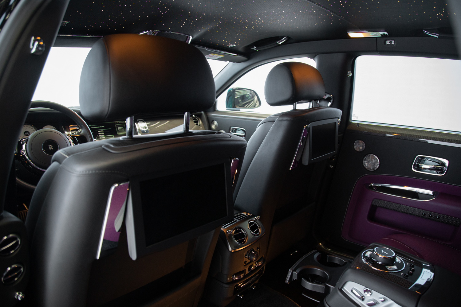 The 2018 Rolls-Royce Ghost Black Badge is designed for those who demand more than just luxury; they seek a vehicle that combines traditional elegance with a more assertive and powerful presence. The black exterior of the Ghost Black Badge exudes a timeless sophistication, while the unique purple and black interior creates a lavish and distinctive environment, showcasing Rolls-Royce's commitment to bespoke craftsmanship and luxury.