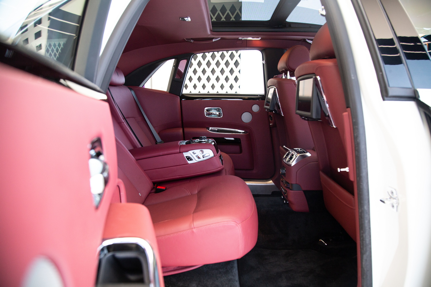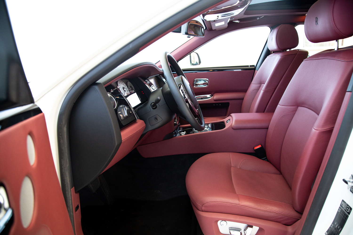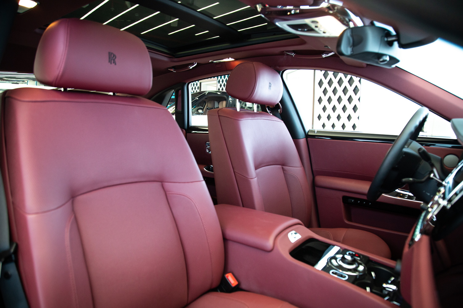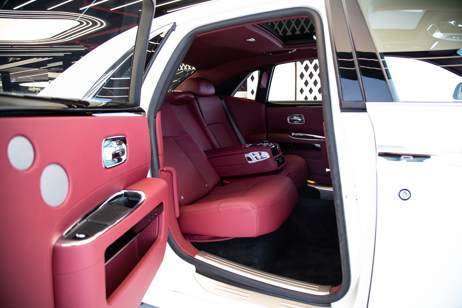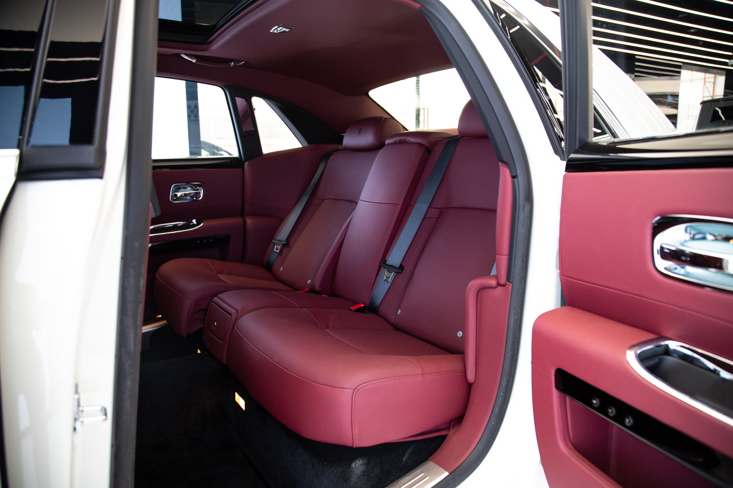 Inside, the car features a lavish red interior, a bold choice that reflects sophistication and exclusivity. The premium leather seats are as comfortable as they are stylish, ensuring that every journey feels luxurious. The expansive panoramic roof adds a feeling of openness to the cabin, allowing natural light to flow in and enhancing the serene atmosphere that Rolls-Royce is known for.