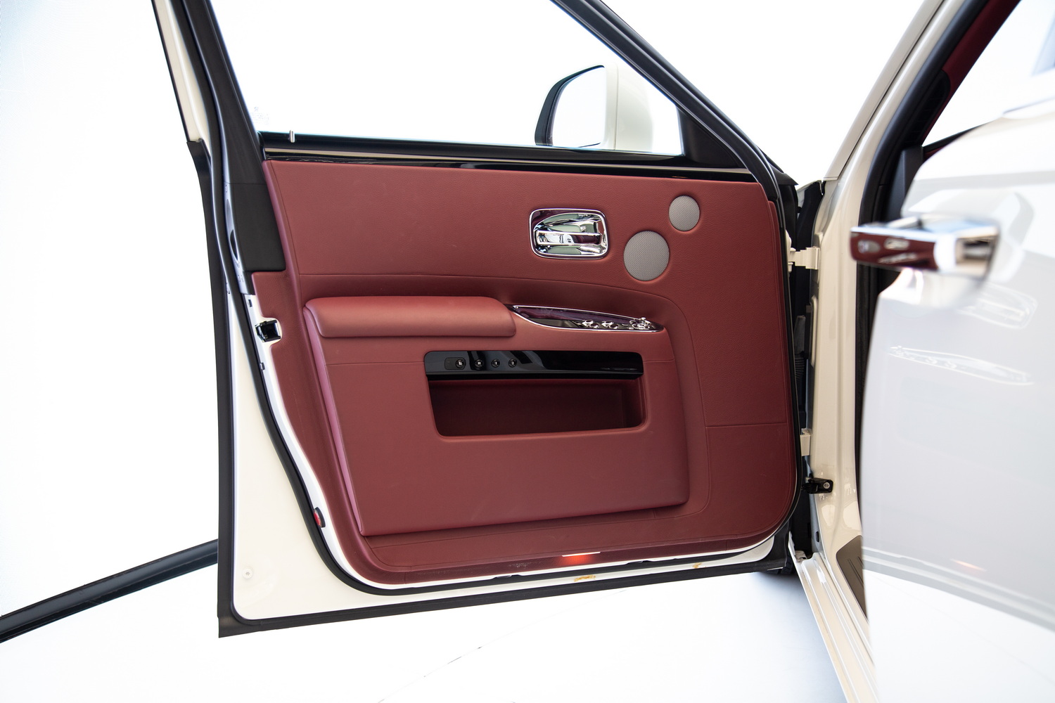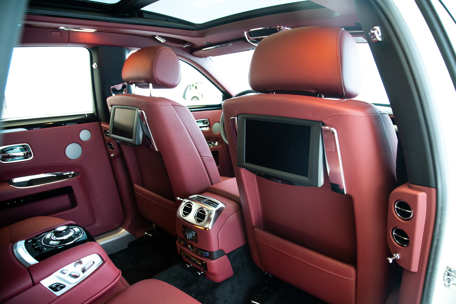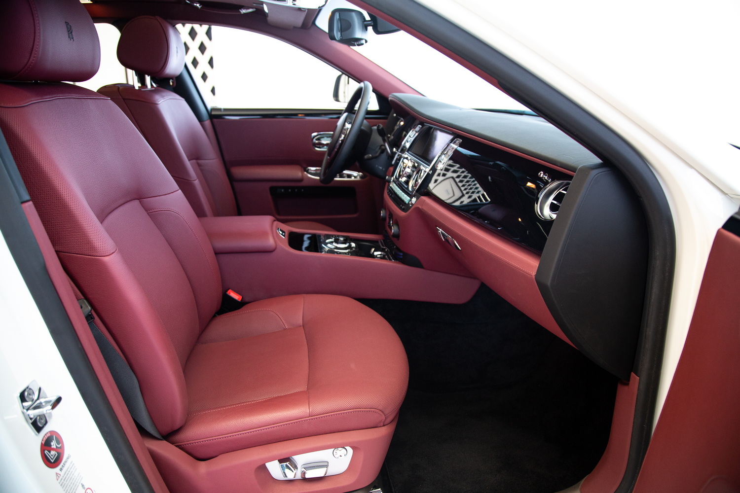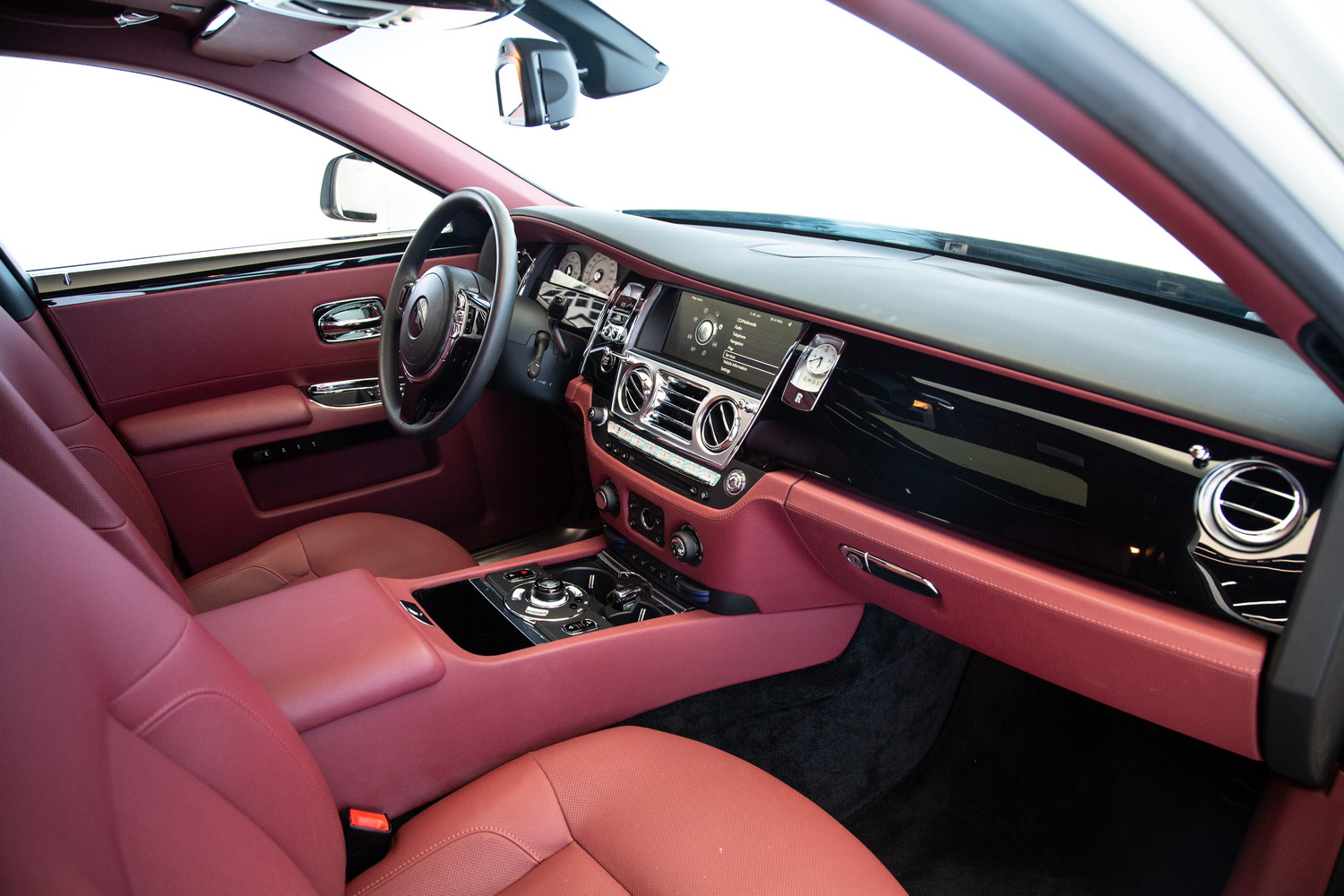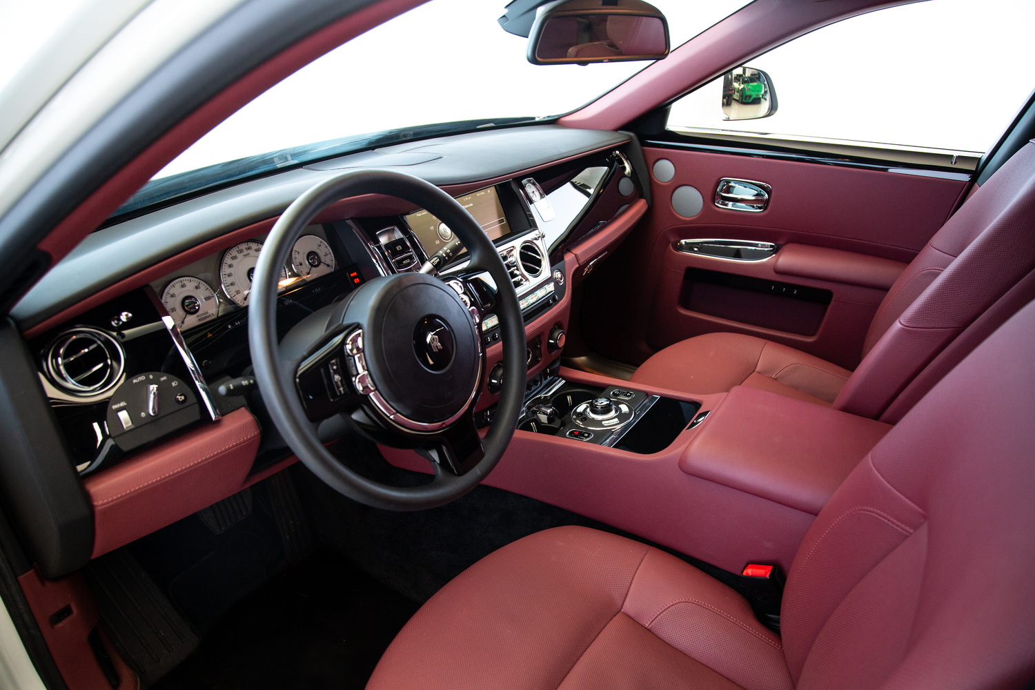 Inside, the car features a lavish red interior, a bold choice that reflects sophistication and exclusivity. The premium leather seats are as comfortable as they are stylish, ensuring that every journey feels luxurious. The expansive panoramic roof adds a feeling of openness to the cabin, allowing natural light to flow in and enhancing the serene atmosphere that Rolls-Royce is known for.
