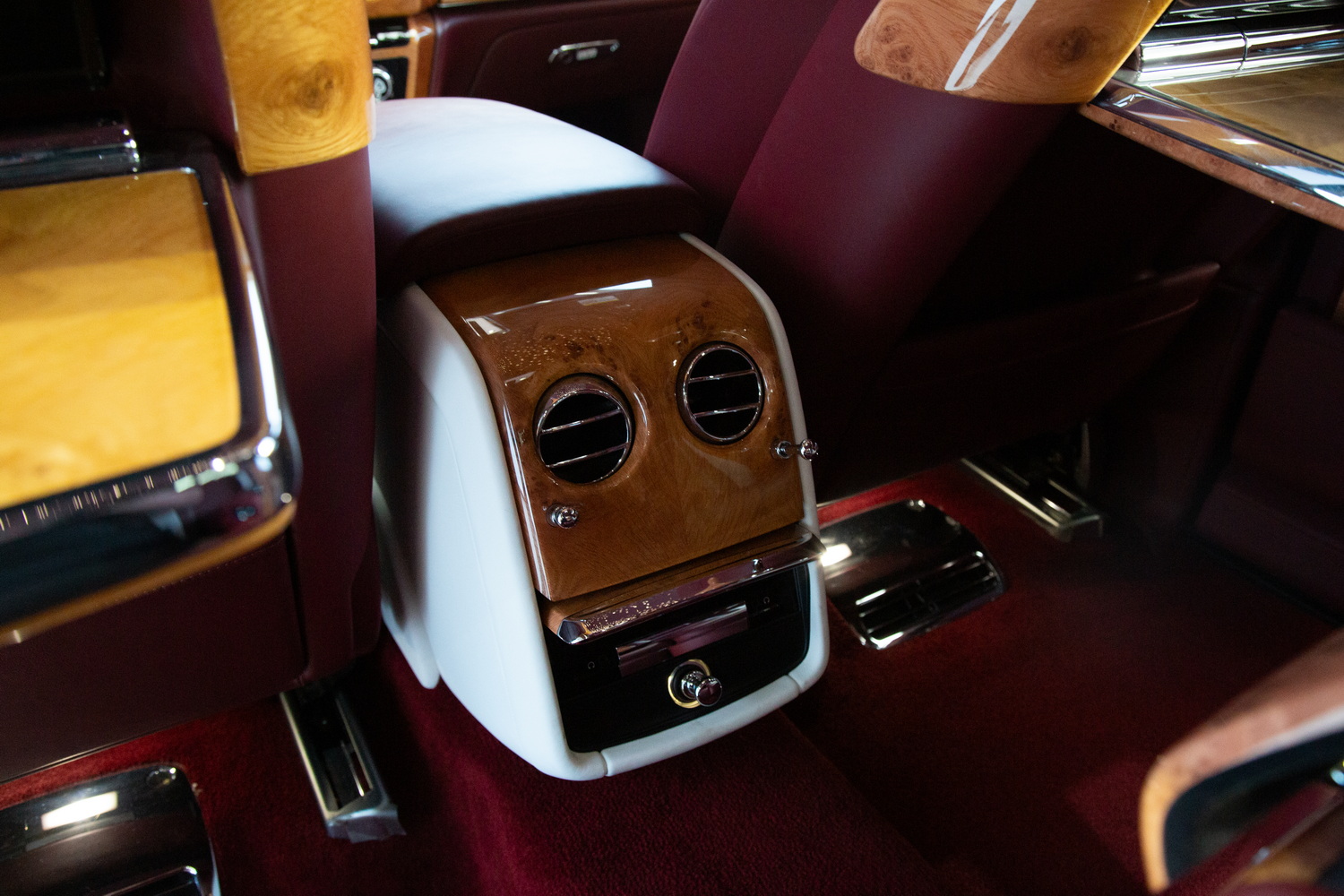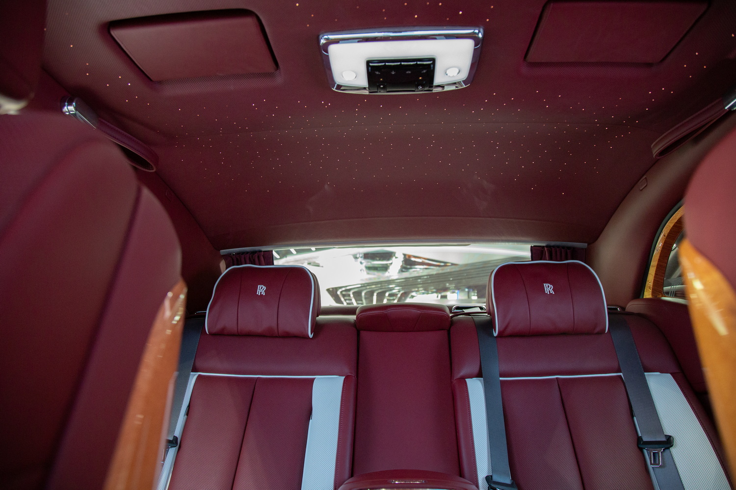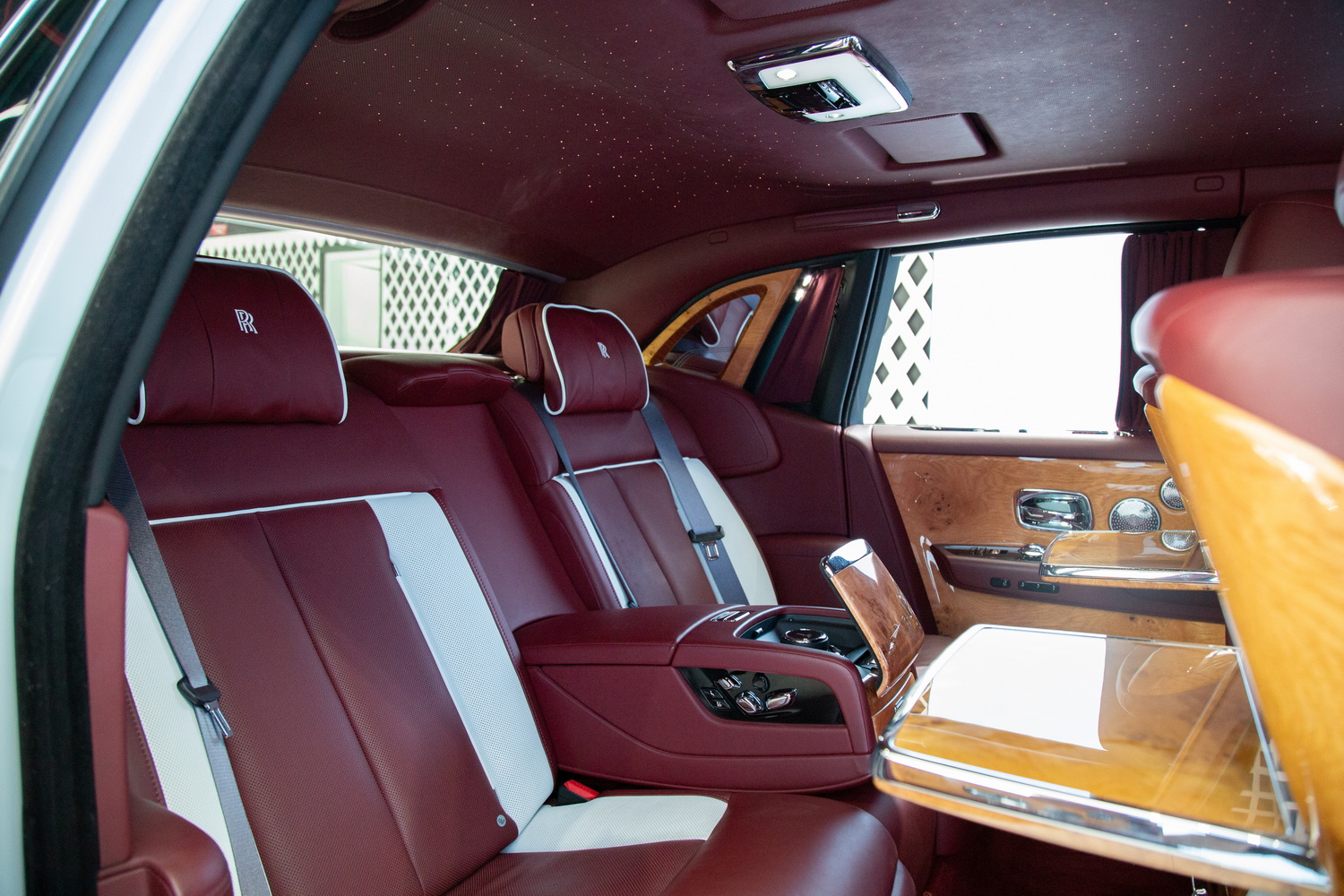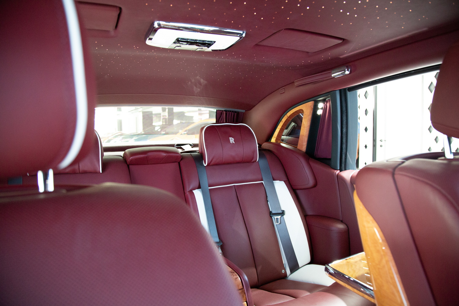 Step inside the lavish interior, where opulence takes on new meaning with a two-tone red and white palette. Bespoke audio envelops you in a symphony of sound, while the rich wooden trim adds warmth and texture to the surroundings. Privacy curtains ensure that every moment within the Phantom is a private sanctuary, far removed from the outside world.
