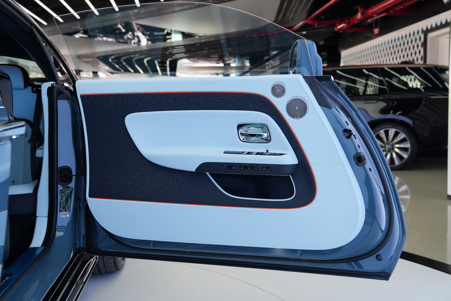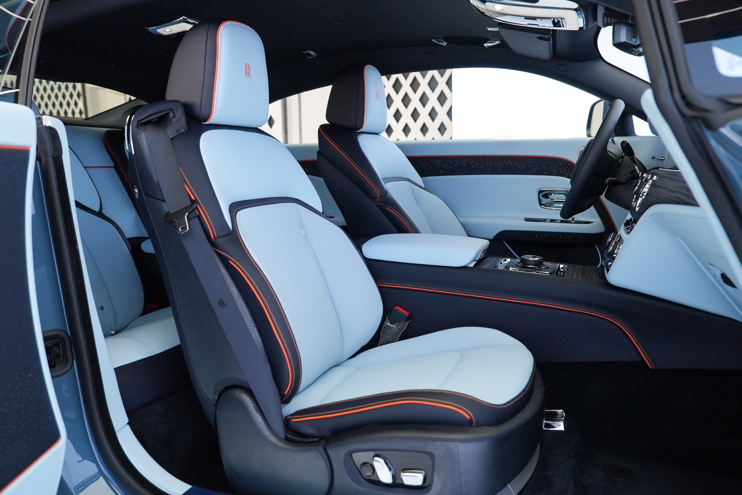The 2025 Rolls Royce Spectre stands as a testament to exquisite craftsmanship and innovation. With its captivating Withering Blue exterior, this luxury coupe commands attention on every road. The elegant Charles Blue interior, complemented by Mandarin Orange accents, creates a harmonious blend of sophistication and vibrancy that elevates the driving experience.