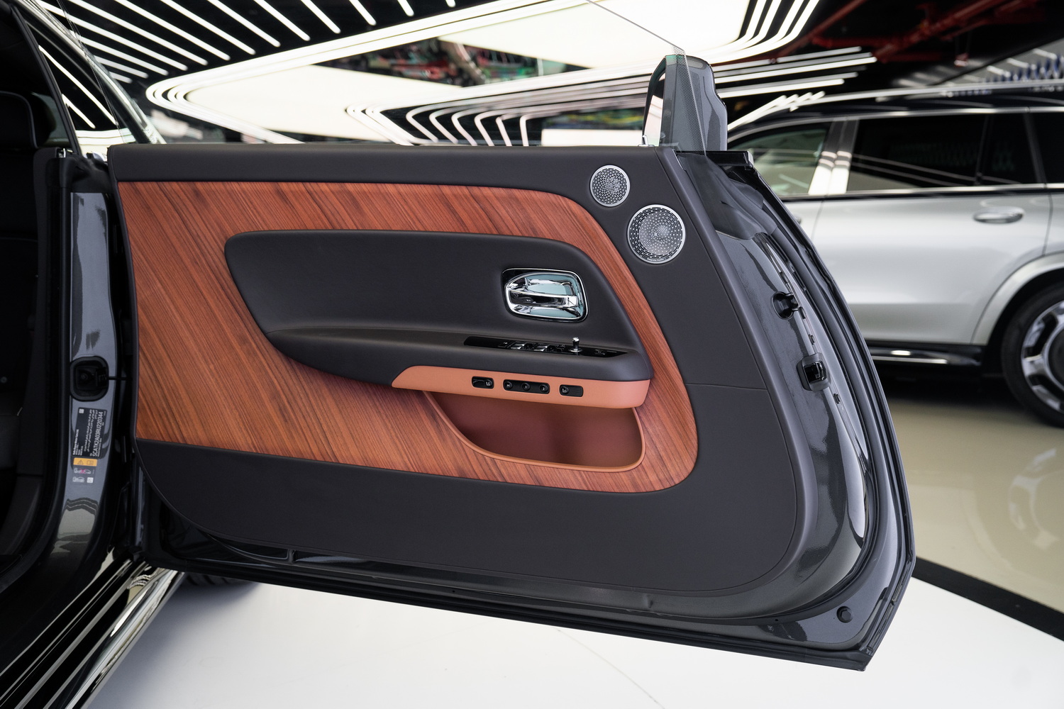 The 2024 Rolls-Royce Spectre redefines the concept of ultra-luxury with its all-electric powertrain and unparalleled craftsmanship. Featuring a grey exterior, a sophisticated black interior with wood design, and ivory leather stitching, this grand coupe is the ultimate statement of elegance and innovation.